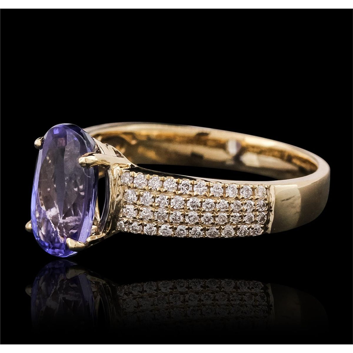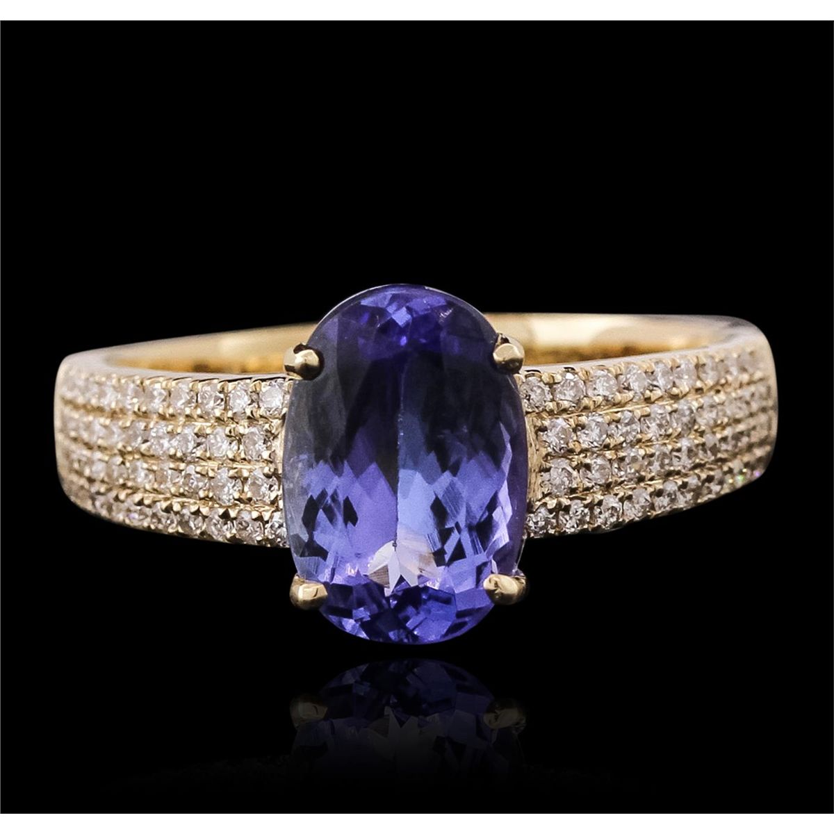 One electronically tested 14KT yellow gold ladies combination cast & assembled tanzanite and diamond ring with a flat shank with a bright polish finish. Identified with markings of "14K". Condition is new. Containing: One prong set oval modified brilliant cut natural tanzanite, measuring 10.05 x 6.80 x 3.75mm, approximate weight of 1.78ct., clarity is eye clean, type I, medium, very slightly grayish, violet color, (GIA V 5/3), cut is good. Eighty prong set round brilliant cut diamonds, measuring 1.10 - 1.10 x 0.66mm (depth est.) approximate total weight of 80 Stones = 0.38ct. Clarity: I-1 to I-2. Color: I - J, Cut is Good. Colored gemstones are presumed to have been subjected to commonly used enhancement processes. All diamonds and colored gemstones are graded in the mounting, unless otherwise stated total weight of Colored Stones 1.78ct. Total Weight of Diamonds 0.38ct. Total Weight of Ring 4.00 grams. GGL Appraised at $5,250.00.