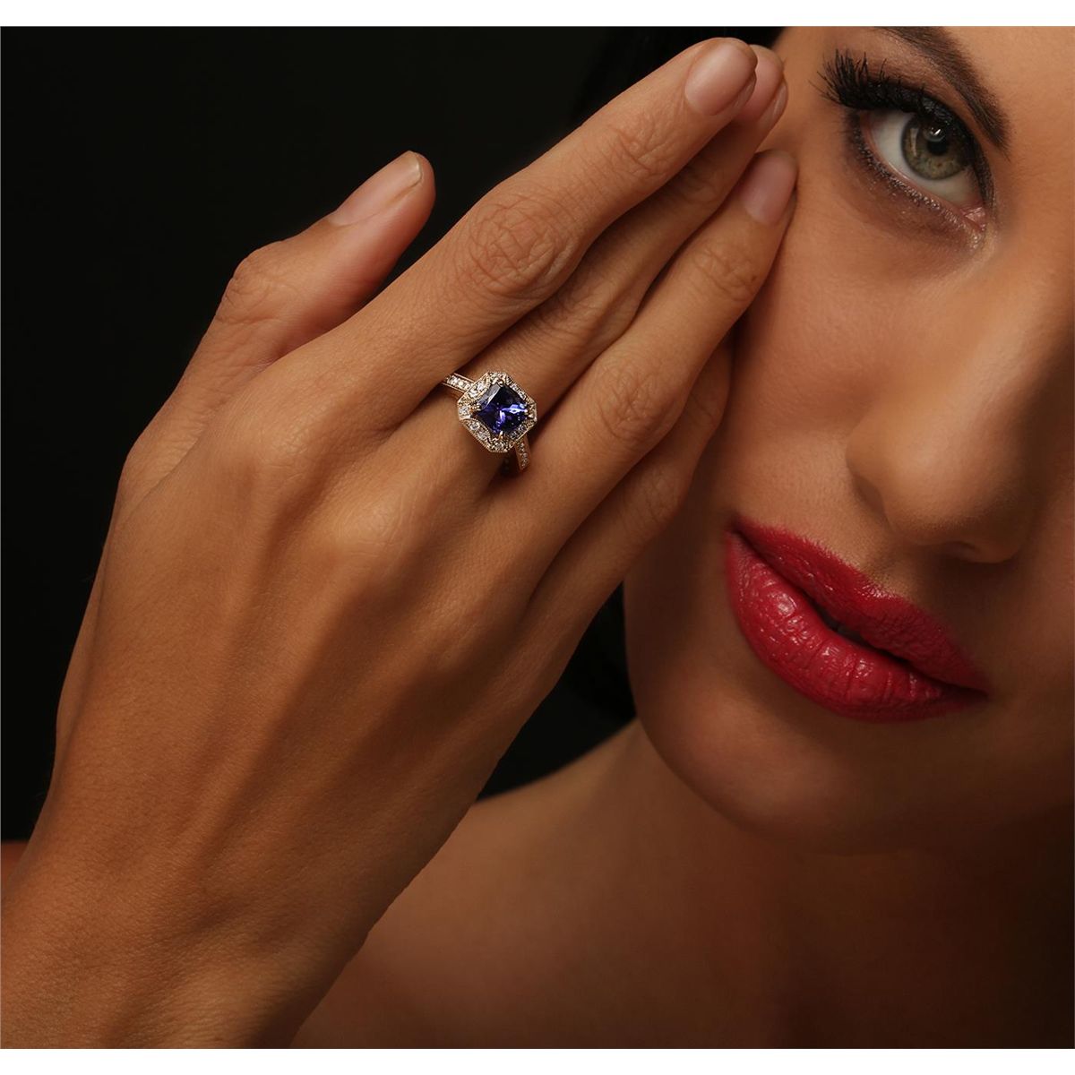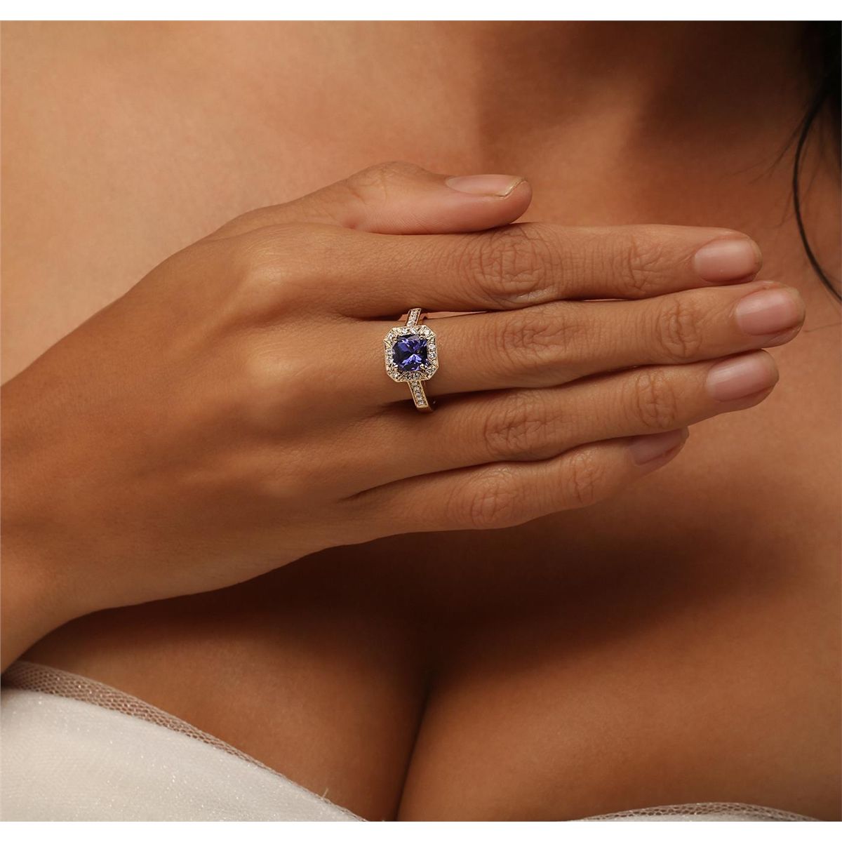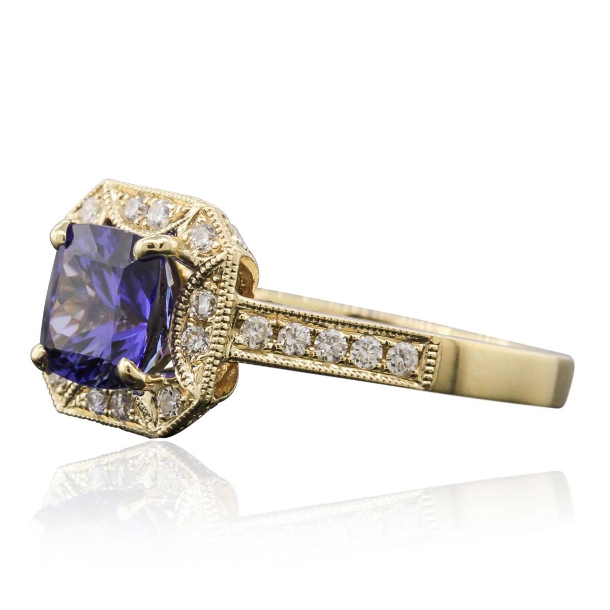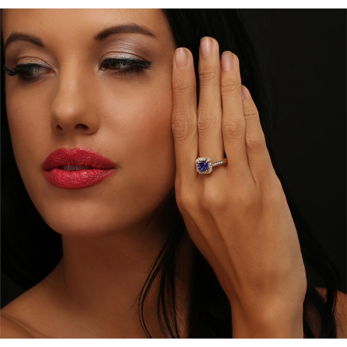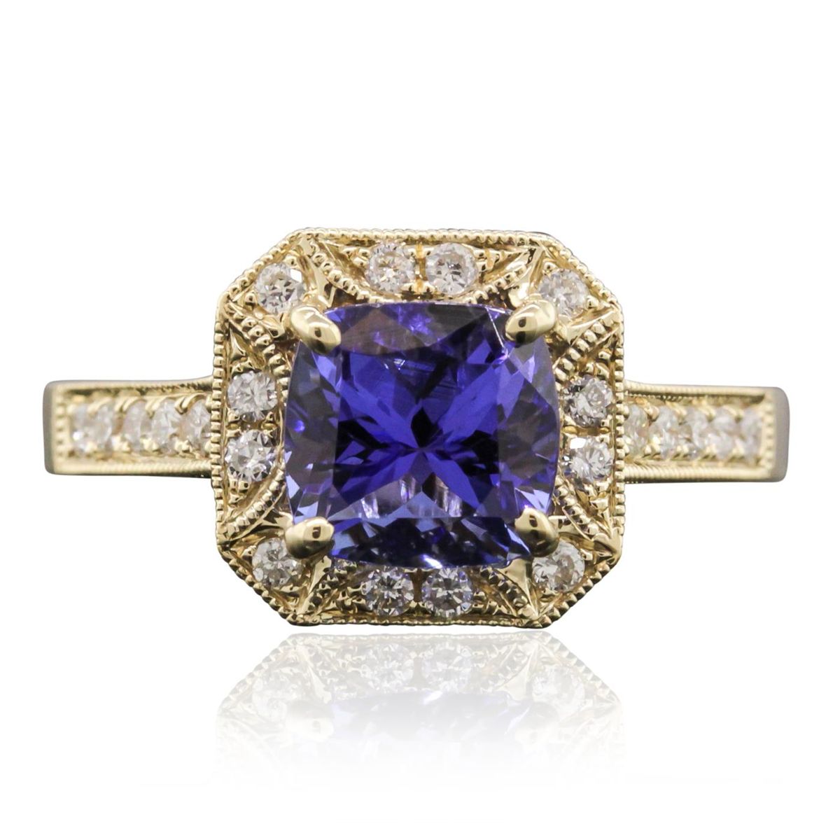 One electronically tested 14KT yellow gold Ladies combination cast & assembled ring with a bright polish finish. Condition is new. Identified with markings of "14K". Containing: One prong set square cushion modified brilliant cut natural tanzanite, measuring 7.15 x 6.90 x 4.57mm, approximate. Total Weight of 1.78ct., clarity is eye clean, type I, medium, moderately strong, bluish violet color, (GIA bV 5/4), cut is good. Thirty-Eight prong set round brilliant cut diamonds, measuring 1.50 - 1.30 x 0.84mm (depth est.) approximate. Total Weight of 38 Stones = 0.38ct. Clarity: SI-1 to I-1. Color: I - J, Cut is Good. Colored gemstones are presumed to have been subjected to commonly used enhancement processes. All diamonds and colored gemstones are graded in the mounting, unless otherwise stated. Total Weight of Colored Stones 1.78ct. Total Weight of Diamonds 0.38ct. Total Weight of Ring 4.50 grams. GGL Appraised at $4,980.00.