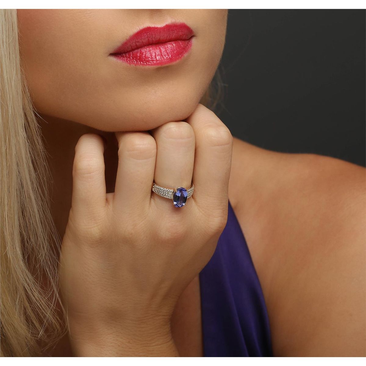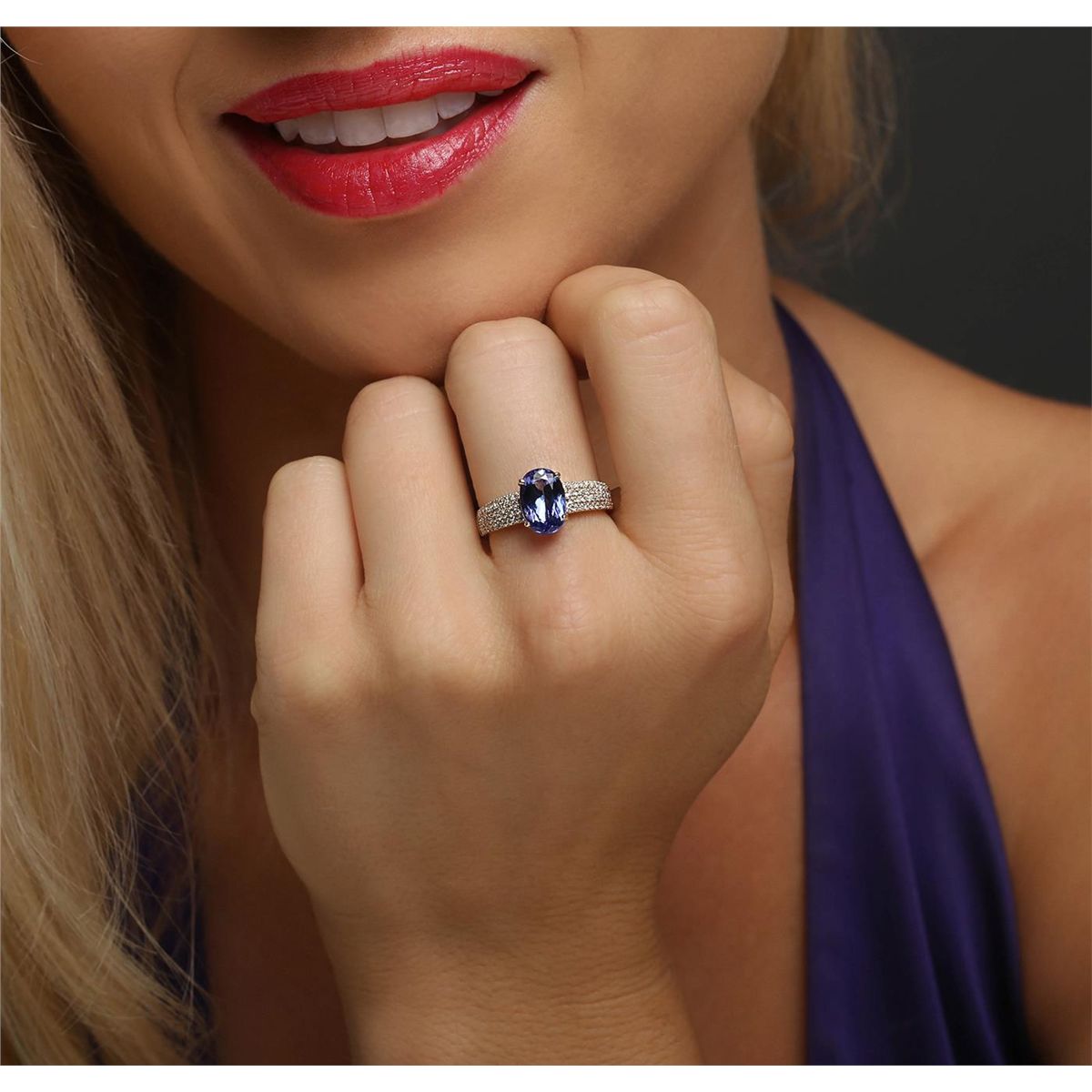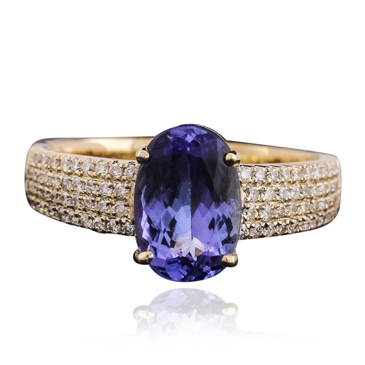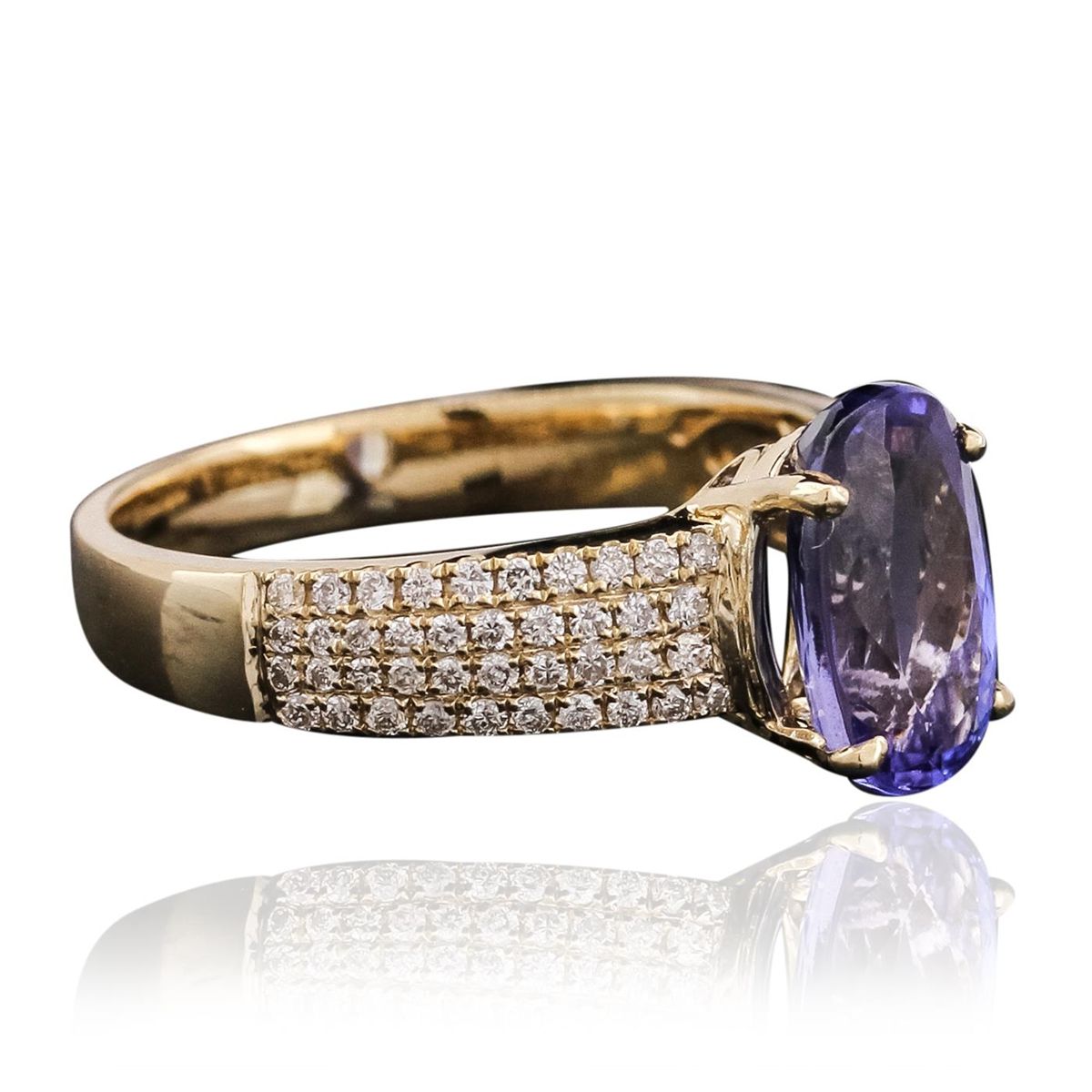 One electronically tested 14KT yellow gold ladies combination cast & assembled tanzanite and diamond ring with a flat shank with a bright polish finish. Identified with markings of "14K". Condition is new. Containing: One prong set oval modified brilliant cut natural tanzanite, measuring 10.05 x 6.80 x 3.75mm, approximate weight of 1.78ct., clarity is eye clean, type I, medium, very slightly grayish, violet color, (GIA V 5/3), cut is good. Eighty prong set round brilliant cut diamonds, measuring 1.10 - 1.10 x 0.66mm (depth est.) approximate total weight of 80 Stones = 0.38ct. Clarity: I-1 to I-2. Color: I - J, Cut is Good. Colored gemstones are presumed to have been subjected to commonly used enhancement processes. All diamonds and colored gemstones are graded in the mounting, unless otherwise stated total weight of Colored Stones 1.78ct. Total Weight of Diamonds 0.38ct. Total Weight of Ring 4.00 grams. GGL Appraised at $5,250.00.