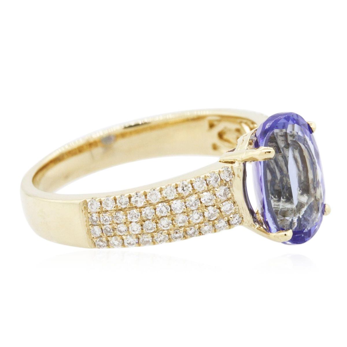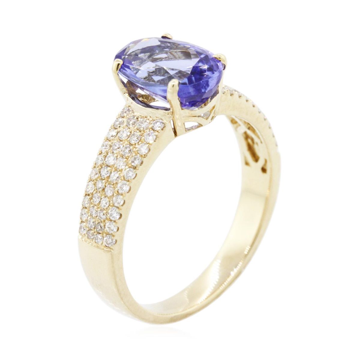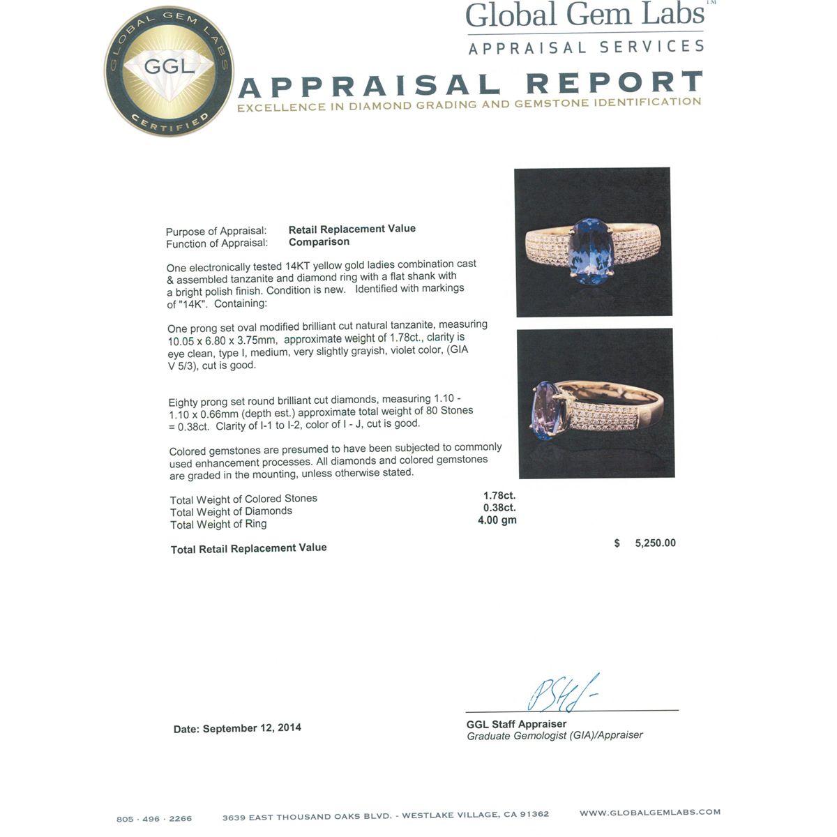 One electronically tested 14KT yellow gold ladies combination cast & assembled tanzanite and diamond ring with a flat shank with a bright polish finish. Identified with markings of "14K". Condition is new. Containing: One prong set oval modified brilliant cut natural tanzanite, measuring 10.05 x 6.80 x 3.75mm, approximate weight of 1.78ct., clarity is eye clean, type I, medium, very slightly grayish, violet color, (GIA V 5/3), cut is good. Eighty prong set round brilliant cut diamonds, measuring 1.10 - 1.10 x 0.66mm (depth est.) approximate total weight of 80 Stones = 0.38ct. Clarity: I-1 to I-2. Color: I - J, Cut is Good. Colored gemstones are presumed to have been subjected to commonly used enhancement processes. All diamonds and colored gemstones are graded in the mounting, unless otherwise stated total weight of Colored Stones 1.78ct. Total Weight of Diamonds 0.38ct. Total Weight of Ring 4.00 grams. GGL Appraised at $5,250.00.