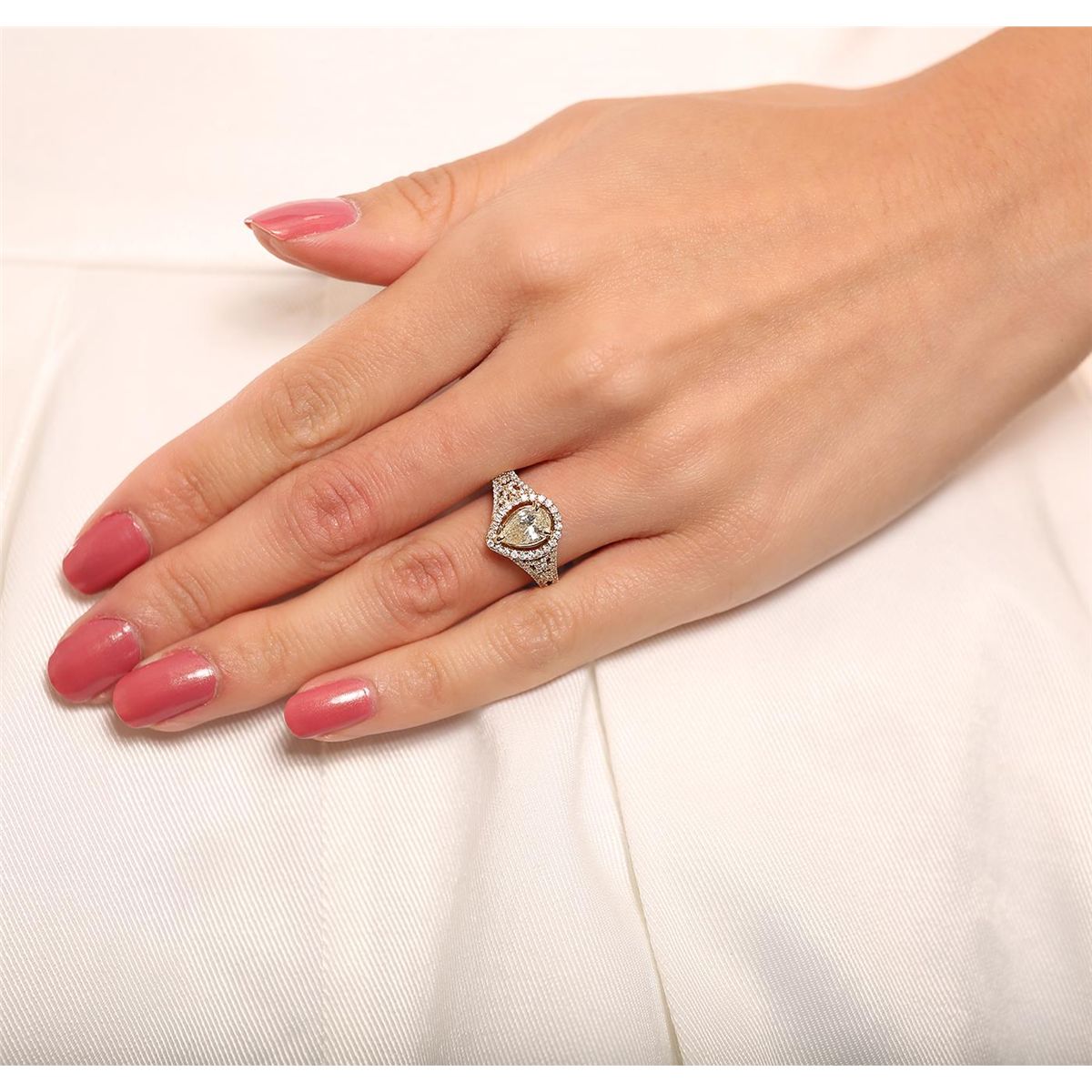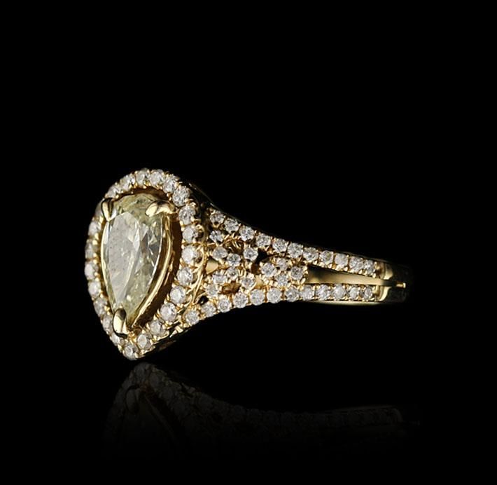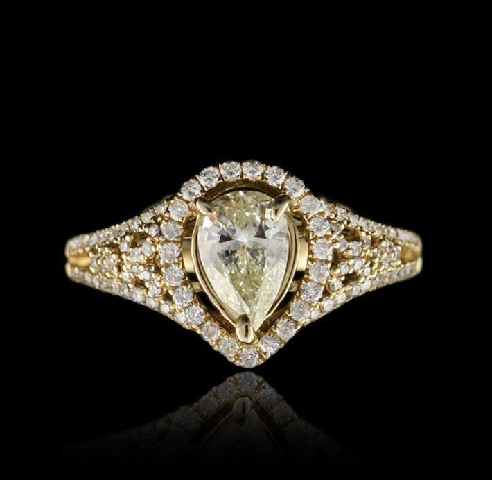 One electronically tested 14KT yellow gold ladies cast & assembled diamond unity ring with a bright polish finish. Condition is good. The ring features a pear shaped diamond set within a ribbon of diamond supported by a lacy under gallery, completed by a tapering diamond set two millimeter wide band. Trademark is V.J. Identified with markings of "14K". Containing: One prong set pear shaped cut diamond, measuring 8.50 x 5.00 x 3.15mm (depth est.) approximate weight of 0.77ct. Graded in the setting. Clarity: SI-2. Color: Very Light Yellow. Depth: 63.0%. Table: 56.0%. Ninety-one prong set round brilliant cut diamonds, measuring 1.00 -1.90 x 0.87mm (depth est.) approximate total weight of 91 Stones = 1.01ct. Graded in the setting. Clarity: SI-1 to I-1. Color: G-H. Total Weight of Diamonds: 1.78ct. Total Weight of ring: 3.17gm.