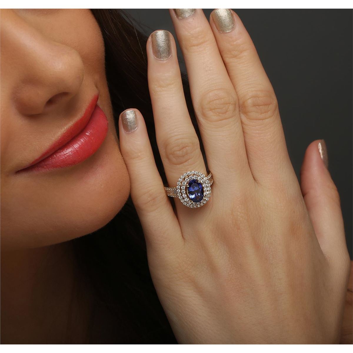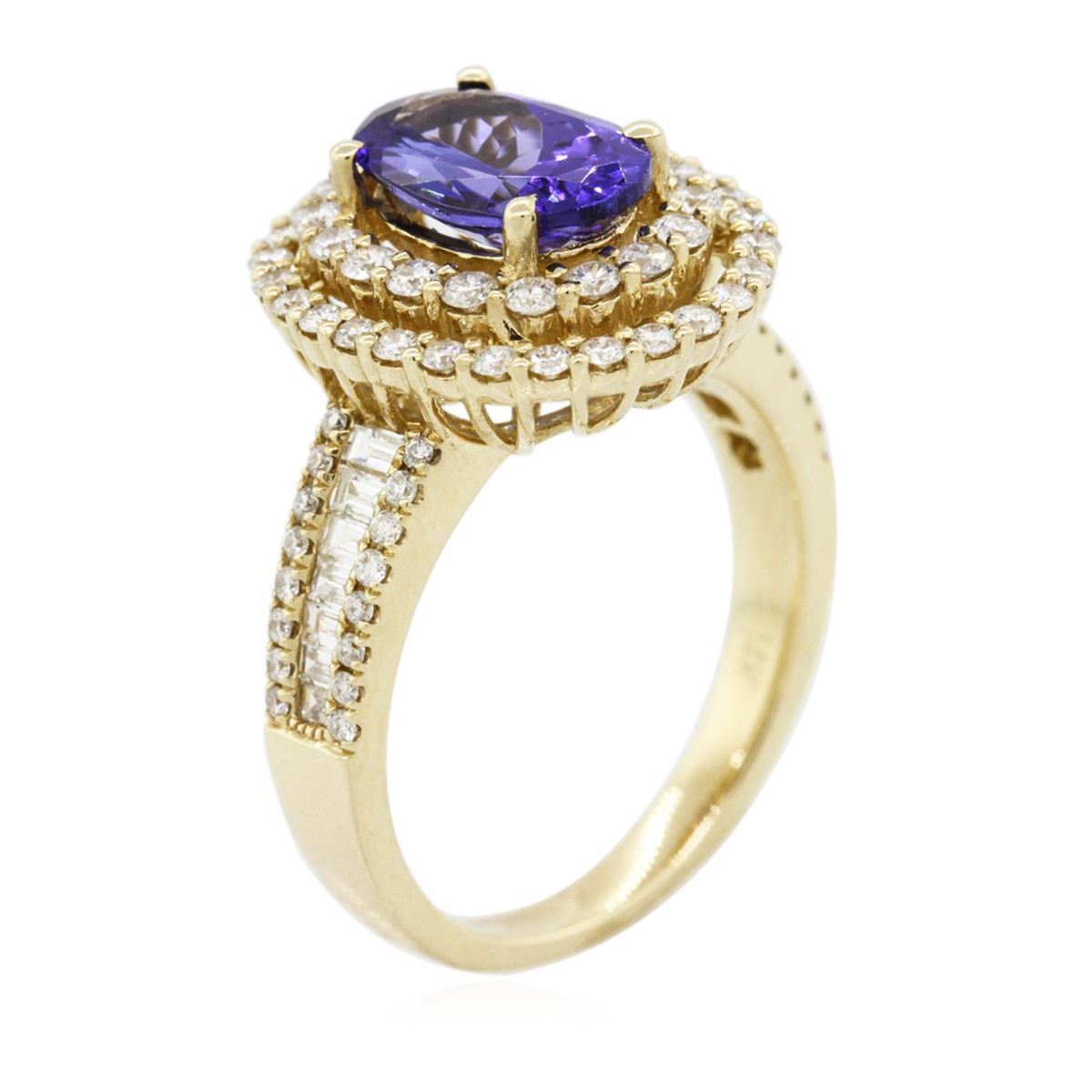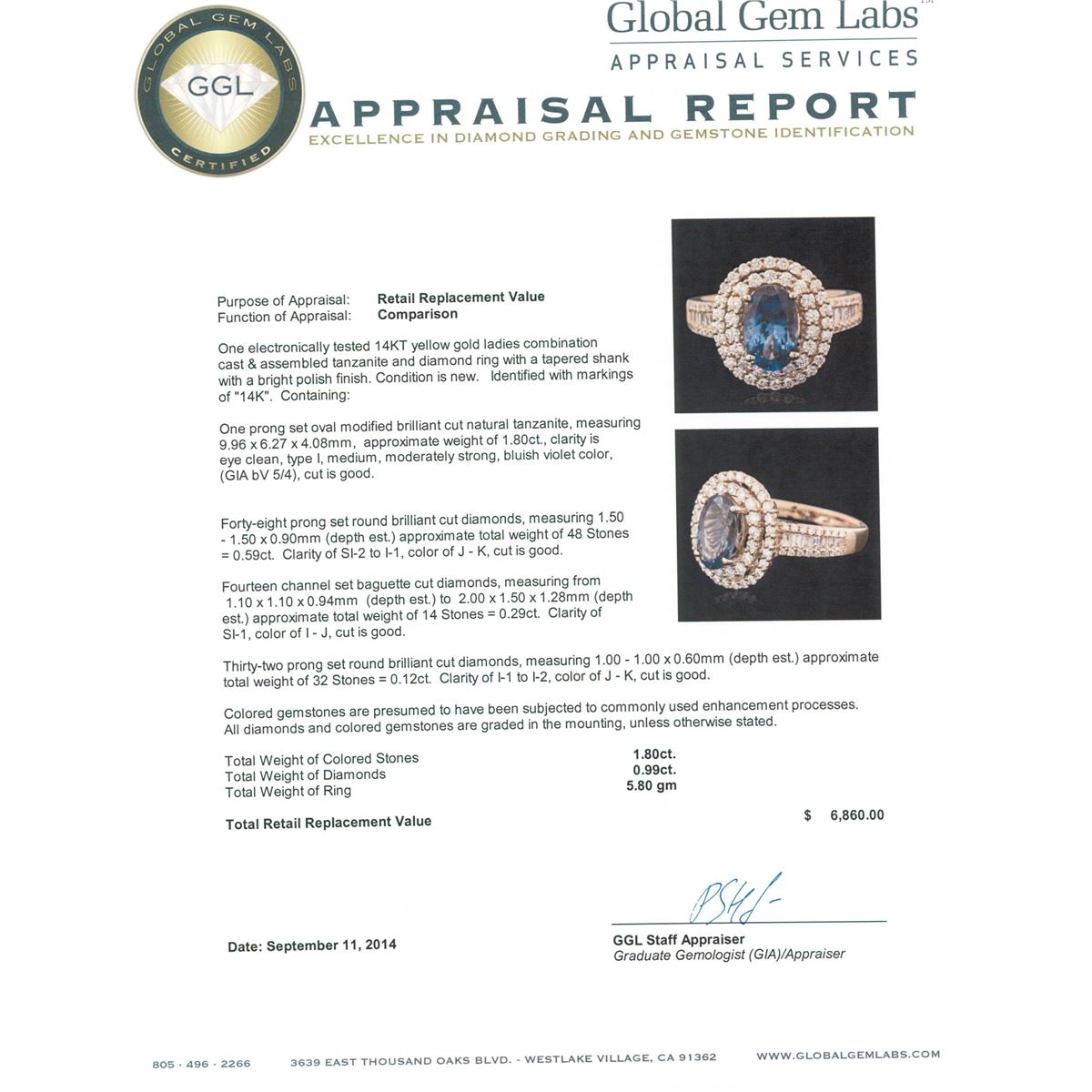 One electronically tested 14KT yellow gold ladies combination cast & assembled tanzanite and diamond ring with a tapered shank with a bright polish finish. Identified with markings of "14K". Condition is new. Containing: One prong set oval modified brilliant cut natural tanzanite, measuring 9.96 x 6.27 x 4.08mm, approximate weight of 1.80ct., clarity is eye clean, type I, medium, moderately strong, bluish violet color, (GIA bV 5/4), cut is good. Forty-Eight prong set round brilliant cut diamonds, measuring 1.50 - 1.50 x 0.90mm (depth est.) approximate total weight of 48 Stones = 0.59ct. Clarity: SI-2 to I-1. Color: J - K, Cut is Good. Fourteen channel set baguette cut diamonds, measuring from 1.10 x 1.10 x 0.94mm (depth est.) to 2.00 x 1.50 x 1.28mm (depth est.) approximate total weight of 14 Stones = 0.29ct. Clarity: SI-1. Color: I - J, Cut is Good. Thirty-Two prong set round brilliant cut diamonds, measuring 1.00 - 1.00 x 0.60mm (depth est.) approximate total weight of 32 Stones = 0.12ct. Clarity: I-1 to I-2. Color: J - K, Cut is Good. Colored gemstones are presumed to have been subjected to commonly used enhancement processes. All diamonds and colored gemstones are graded in the mounting, unless otherwise stated. Total Weight of Colored Stones 1.80ct. Total Weight of Diamonds 0.99ct. Total Weight of Ring 5.80 grams. GGL Appraised at $6,860.00.