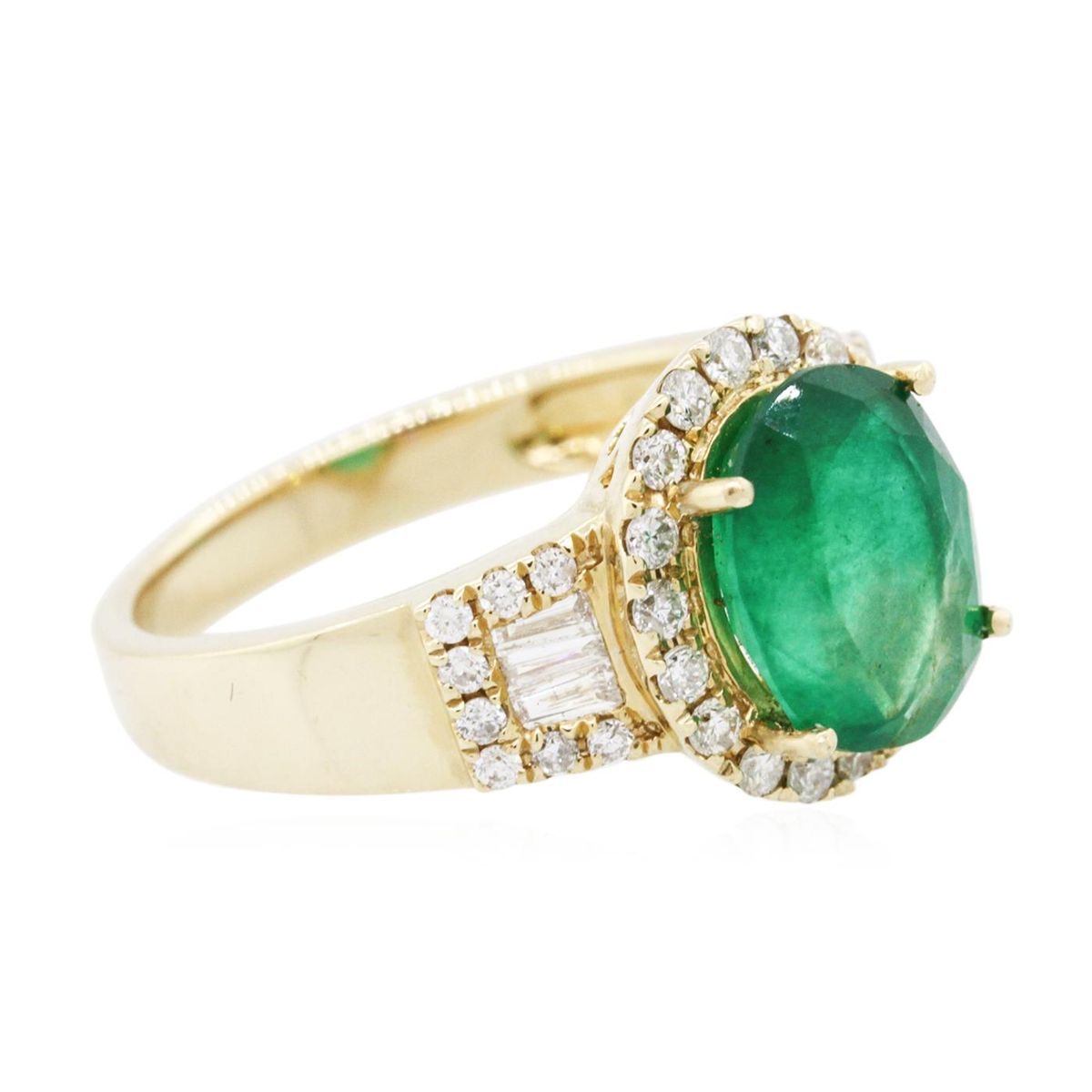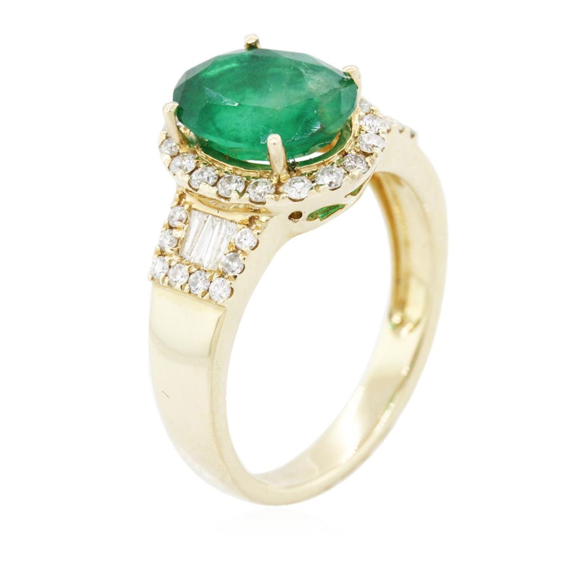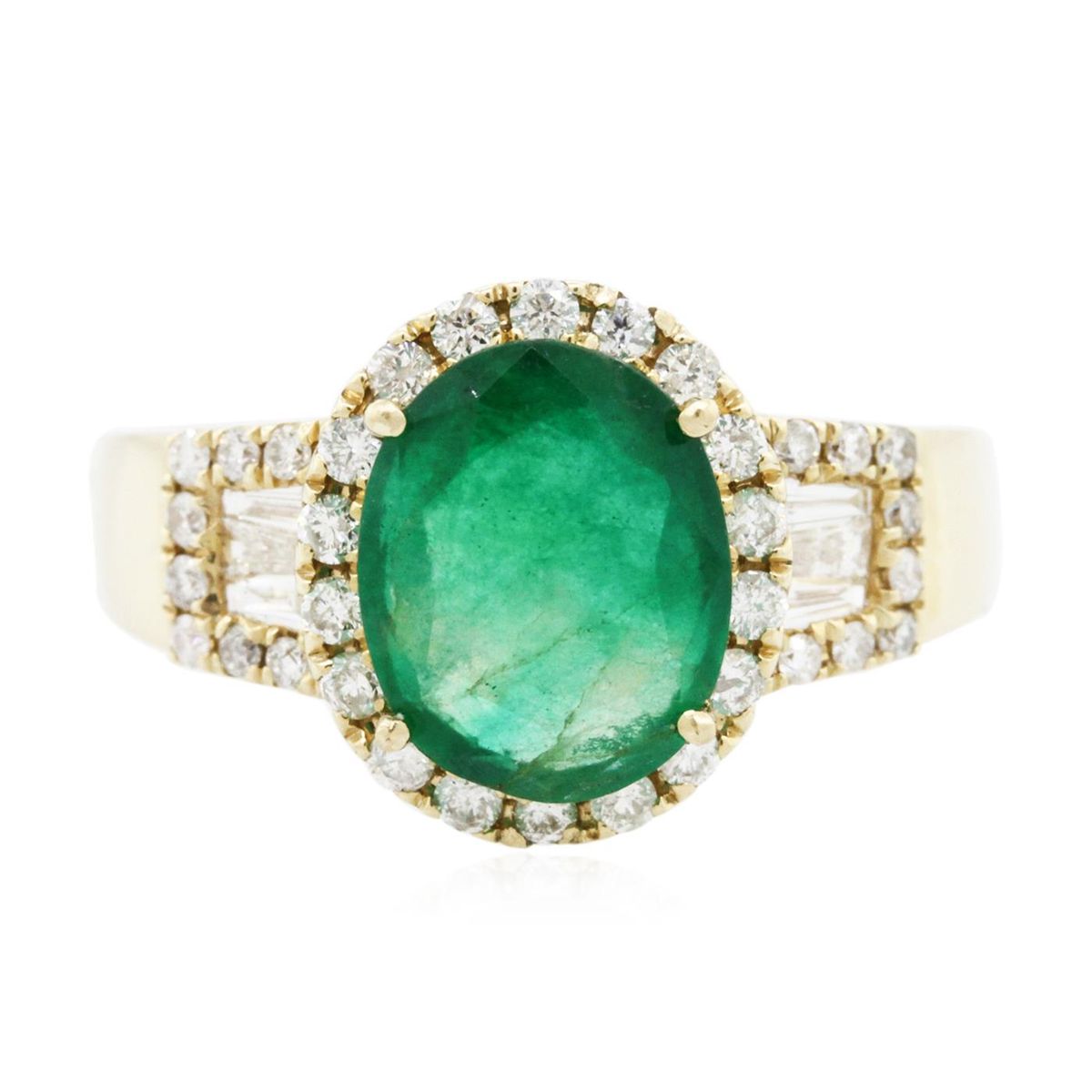 One electronically tested 14KT yellow gold ladies cast emerald and diamond ring with a bright polish finish. The featured emerald is set within a diamond bezel supported by diamond set shoulders, completed by a two and one-half millimeter wide band. Identified with markings of "14K". Condition is new, good workmanship. Containing: One prong set oval mixed cut natural emerald, measuring 9.70 x 8.10 x 3.95mm, 6% bulge factor, approximate weight of 1.80ct., clarity is heavily included, type III, medium dark, moderately strong, very slightly bluish green color, (GIA vslbG 6/4), cut is good. Transmitting light with a minimum of distortion, transparent. Naturally occurring internal & external characteristics are present. Indications of multiple laboratory enhancements, including oil residue. Graded in the setting. Six channel set baguette cut (tapered) diamonds, measuring from 2.80 x 1.20 x 0.84mm (depth est.) to 2.90 x 1.20 x 0.84mm (depth est.) approximate total weight of 6 Stones = 0.16ct. Graded in the setting. Clarity: SI-1 to SI-2. Color: G - H Thirty-Four prong set round brilliant cut diamonds, measuring 1.50 - 1.30 x 0.84mm (depth est.) approximate total weight of 34 Stones = 0.44ct. Graded in the setting. Clarity: SI-1 to I-1. Color: G - I. Total Weight of Colored Stones 1.80ct. Total Weight of Diamonds 0.60ct. Total Weight of Ring 4.87 grams. AIG Appraised at $5,065.00.