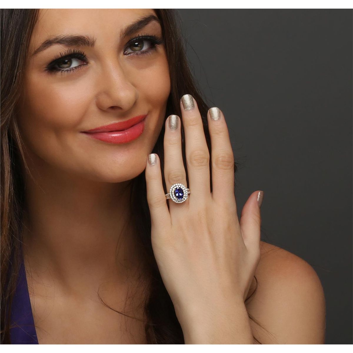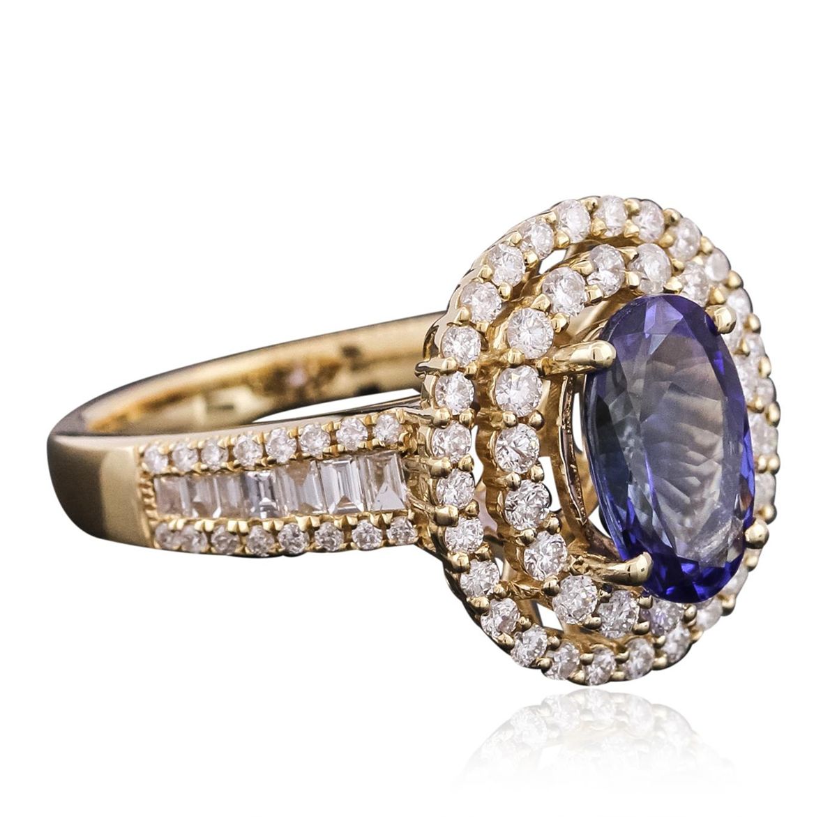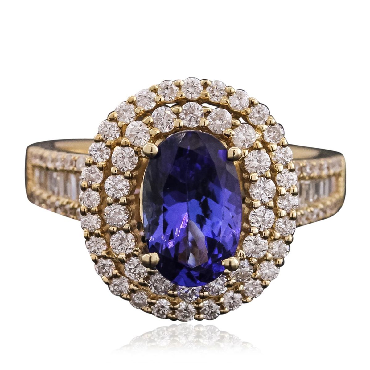 One electronically tested 14KT yellow gold ladies combination cast & assembled tanzanite and diamond ring with a tapered shank with a bright polish finish. Identified with markings of "14K". Condition is new. Containing: One prong set oval modified brilliant cut natural tanzanite, measuring 9.96 x 6.27 x 4.08mm, approximate weight of 1.80ct., clarity is eye clean, type I, medium, moderately strong, bluish violet color, (GIA bV 5/4), cut is good. Forty-Eight prong set round brilliant cut diamonds, measuring 1.50 - 1.50 x 0.90mm (depth est.) approximate total weight of 48 Stones = 0.59ct. Clarity: SI-2 to I-1. Color: J - K, Cut is Good. Fourteen channel set baguette cut diamonds, measuring from 1.10 x 1.10 x 0.94mm (depth est.) to 2.00 x 1.50 x 1.28mm (depth est.) approximate total weight of 14 Stones = 0.29ct. Clarity: SI-1. Color: I - J, Cut is Good. Thirty-Two prong set round brilliant cut diamonds, measuring 1.00 - 1.00 x 0.60mm (depth est.) approximate total weight of 32 Stones = 0.12ct. Clarity: I-1 to I-2. Color: J - K, Cut is Good. Colored gemstones are presumed to have been subjected to commonly used enhancement processes. All diamonds and colored gemstones are graded in the mounting, unless otherwise stated. Total Weight of Colored Stones 1.80ct. Total Weight of Diamonds 0.99ct. Total Weight of Ring 5.80 grams. GGL Appraised at $6,860.00.