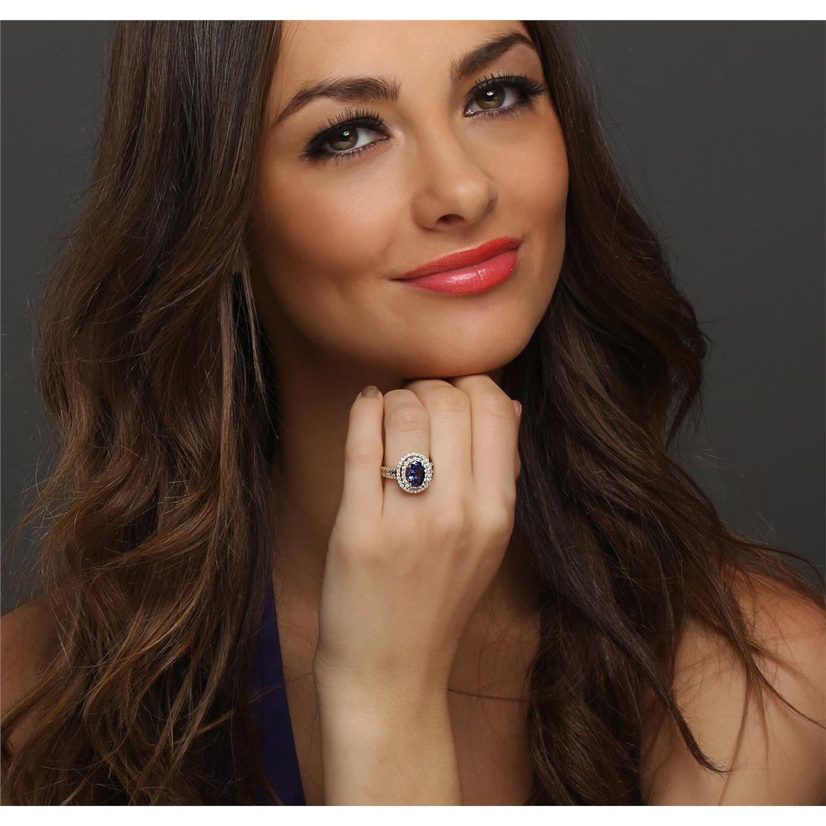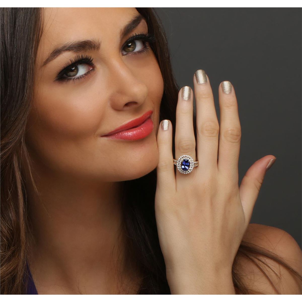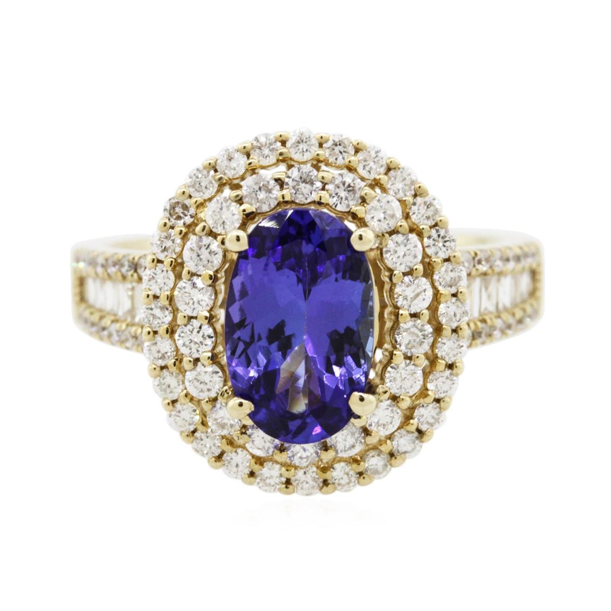 One electronically tested 14KT yellow gold ladies combination cast & assembled tanzanite and diamond ring with a tapered shank with a bright polish finish. Identified with markings of "14K". Condition is new. Containing: One prong set oval modified brilliant cut natural tanzanite, measuring 9.96 x 6.27 x 4.08mm, approximate weight of 1.80ct., clarity is eye clean, type I, medium, moderately strong, bluish violet color, (GIA bV 5/4), cut is good. Forty-Eight prong set round brilliant cut diamonds, measuring 1.50 - 1.50 x 0.90mm (depth est.) approximate total weight of 48 Stones = 0.59ct. Clarity: SI-2 to I-1. Color: J - K, Cut is Good. Fourteen channel set baguette cut diamonds, measuring from 1.10 x 1.10 x 0.94mm (depth est.) to 2.00 x 1.50 x 1.28mm (depth est.) approximate total weight of 14 Stones = 0.29ct. Clarity: SI-1. Color: I - J, Cut is Good. Thirty-Two prong set round brilliant cut diamonds, measuring 1.00 - 1.00 x 0.60mm (depth est.) approximate total weight of 32 Stones = 0.12ct. Clarity: I-1 to I-2. Color: J - K, Cut is Good. Colored gemstones are presumed to have been subjected to commonly used enhancement processes. All diamonds and colored gemstones are graded in the mounting, unless otherwise stated. Total Weight of Colored Stones 1.80ct. Total Weight of Diamonds 0.99ct. Total Weight of Ring 5.80 grams. GGL Appraised at $6,860.00.