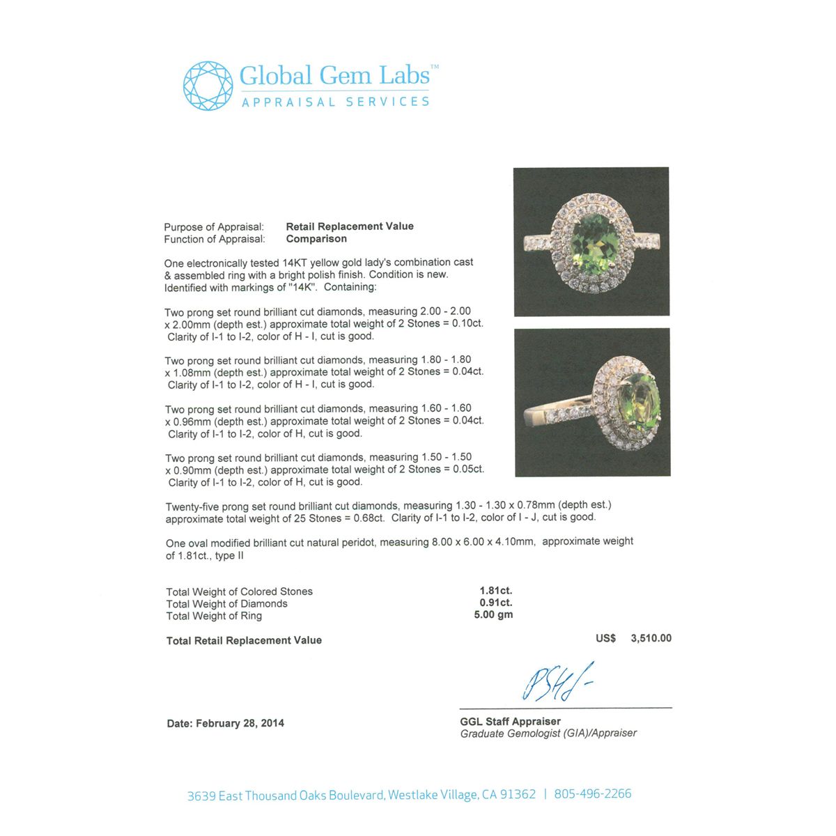 One electronically tested 14KT yellow gold Ladies combination cast & assembled ring with a bright polish finish. Condition is new. Identified with markings of "14K". Containing: Two prong set round brilliant cut diamonds, measuring 2.00 - 2.00 x 2.00mm (depth est.) approximate. Total Weight of 2 Stones = 0.10ct. Clarity: I-1 to I-2. Color: H - I, Cut is Good. Two prong set round brilliant cut diamonds, measuring 1.80 - 1.80 x 1.08mm (depth est.) approximate. Total Weight of 2 Stones = 0.04ct. Clarity: I-1 to I-2. Color: H - I, Cut is Good. Two prong set round brilliant cut diamonds, measuring 1.60 - 1.60 x 0.96mm (depth est.) approximate. Total Weight of 2 Stones = 0.04ct. Clarity: I-1 to I-2. Color: H, Cut is Good. Two prong set round brilliant cut diamonds, measuring 1.50 - 1.50 x 0.90mm (depth est.) approximate. Total Weight of 2 Stones = 0.05ct. Clarity: I-1 to I-2. Color: H, Cut is Good. Twenty-Five prong set round brilliant cut diamonds, measuring 1.30 - 1.30 x 0.78mm (depth est.) approximate. Total Weight of 25 Stones = 0.68ct. Clarity: I-1 to I-2. Color: I - J, Cut is Good. One oval modified brilliant cut natural peridot, measuring 8.00 x 6.00 x 4.10mm, approximate weight of 1.81ct., type II Total Weight of Colored Stones 1.81ct. Total Weight of Diamonds 0.91ct. Total Weight of Ring 5.00 grams. GGL Appraised at $3,510.00.