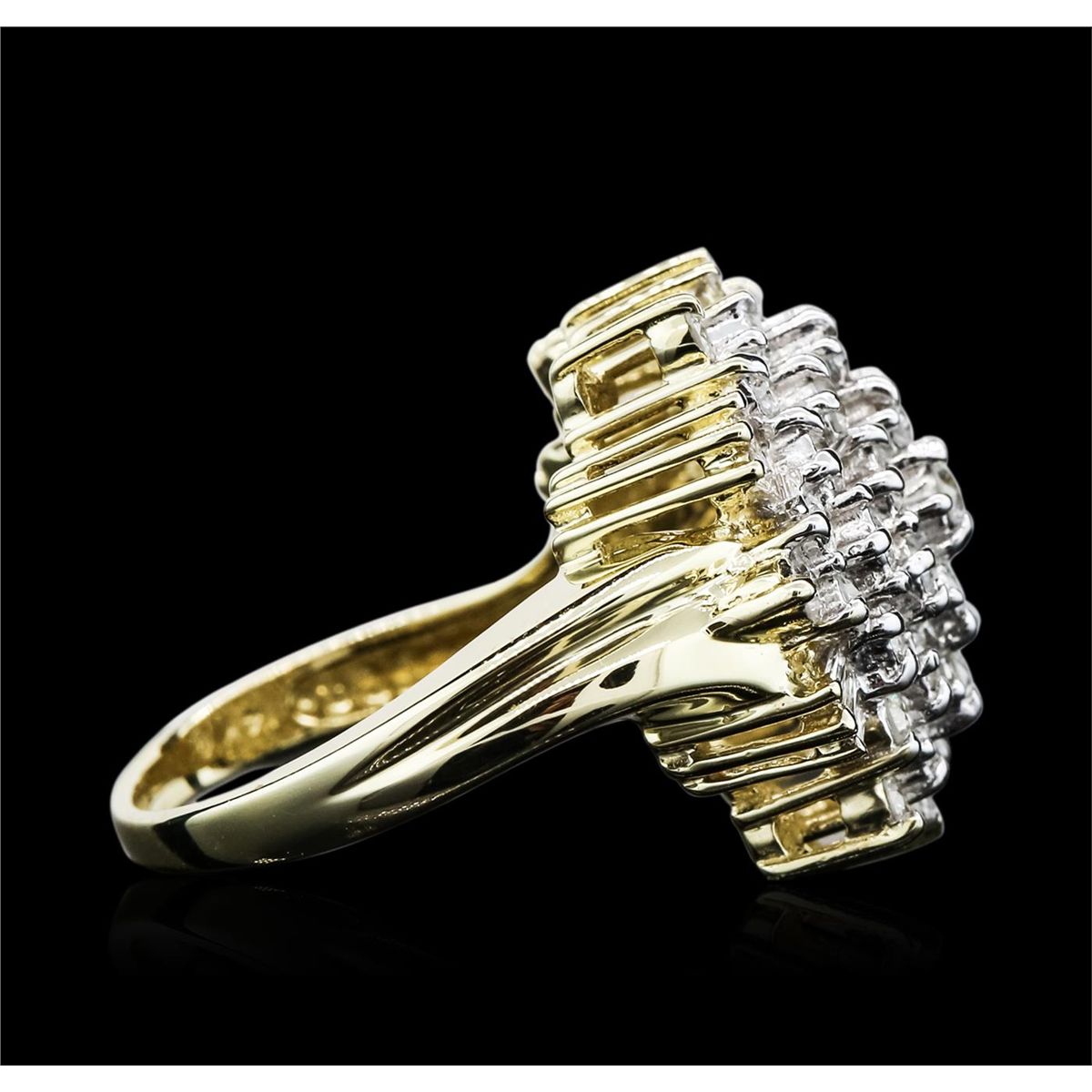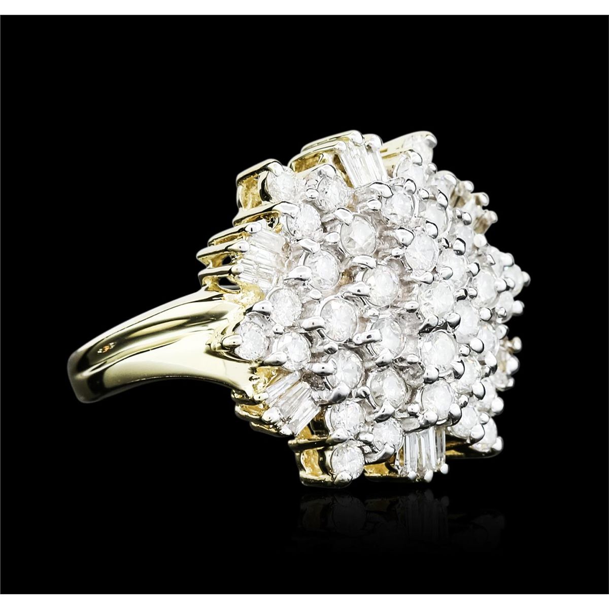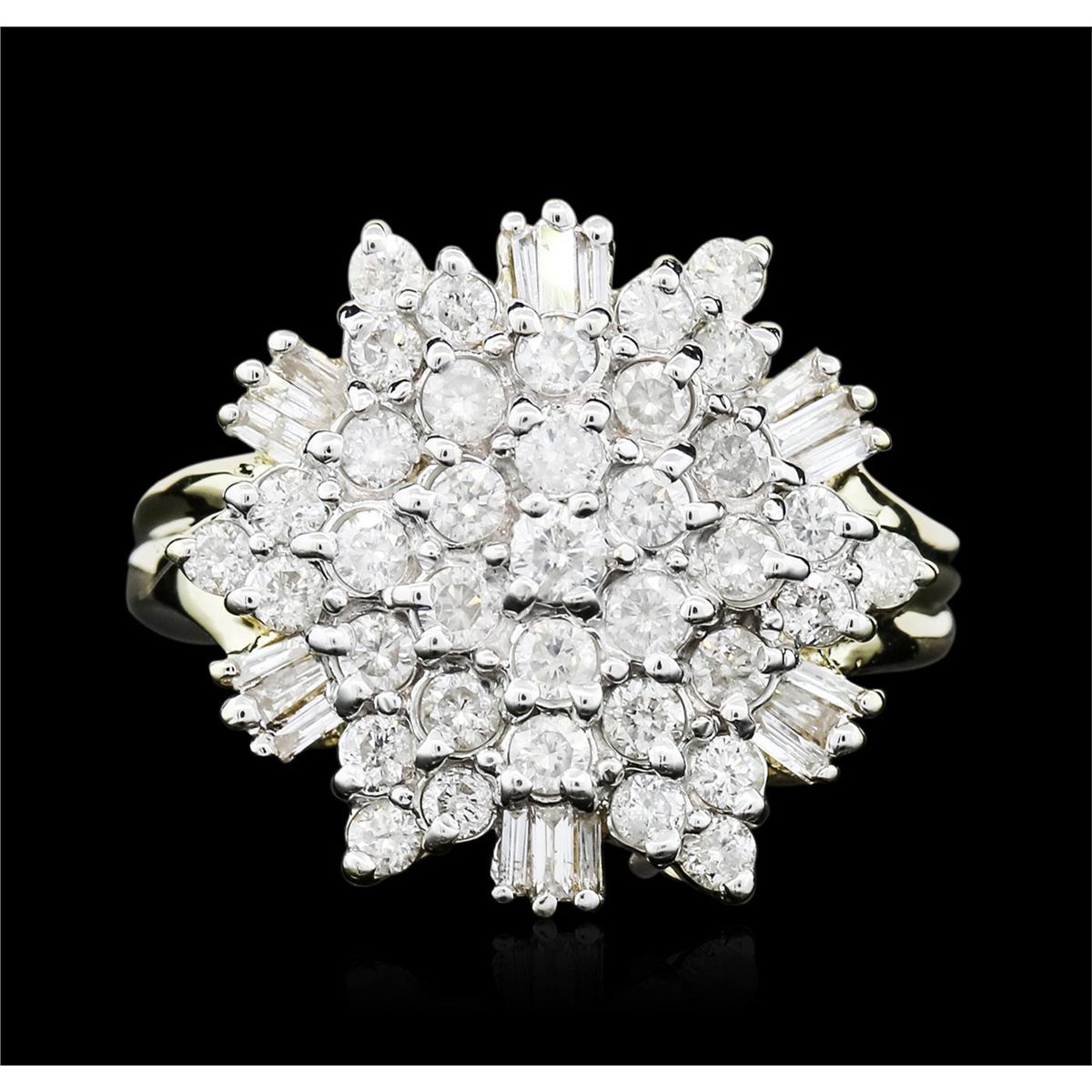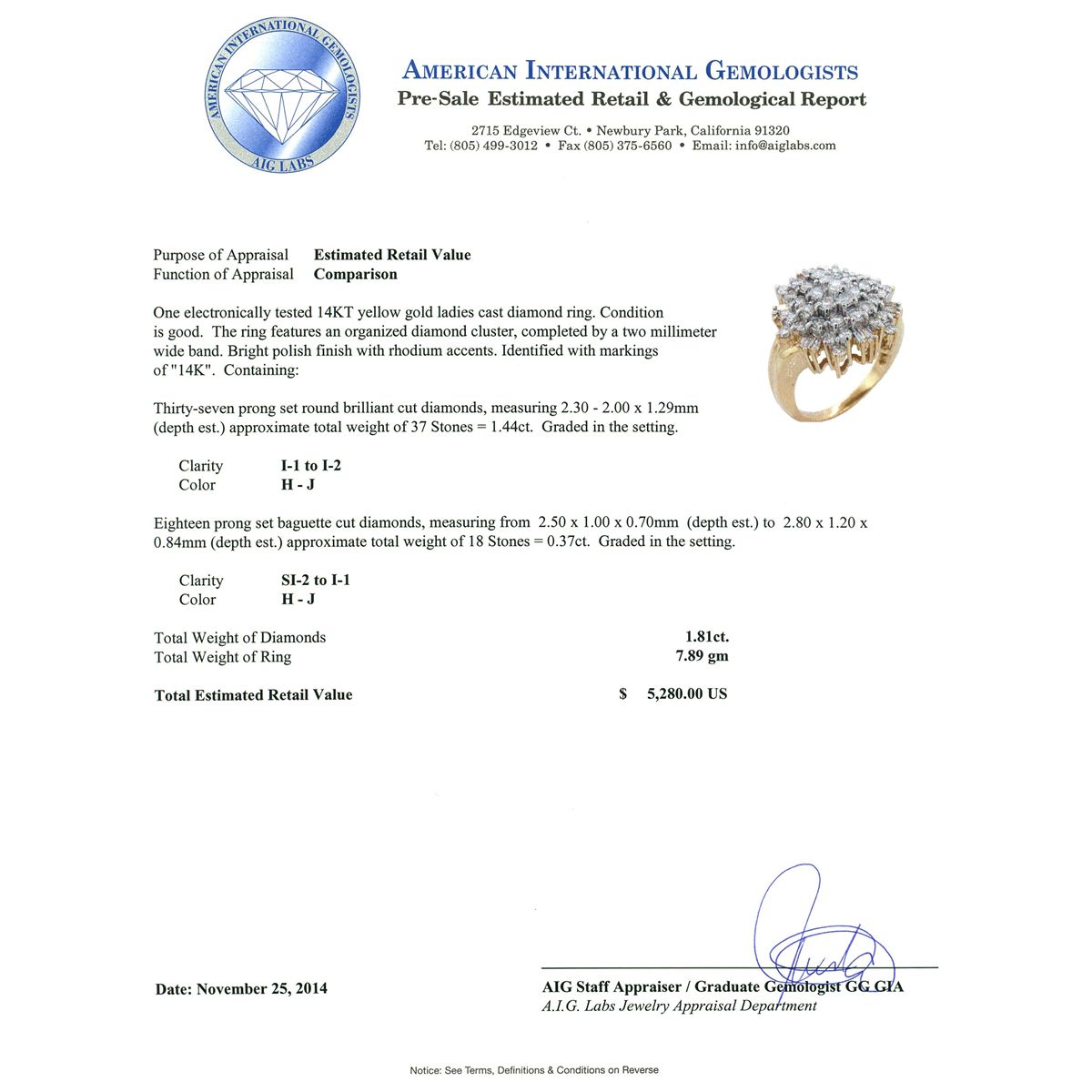 One electronically tested 14KT yellow gold ladies cast diamond ring. The ring features an organized diamond cluster, completed by a two millimeter wide band. Bright polish finish with rhodium accents. Identified with markings of "14K". Condition is good. Containing: Thirty-Seven prong set round brilliant cut diamonds, measuring 2.30 - 2.00 x 1.29mm (depth est.) approximate total weight of 37 Stones = 1.44ct. Graded in the setting. Clarity: I-1 to I-2. Color: H - J Eighteen prong set baguette cut diamonds, measuring from 2.50 x 1.00 x 0.70mm (depth est.) to 2.80 x 1.20 x 0.84mm (depth est.) approximate total weight of 18 Stones = 0.37ct. Graded in the setting. Clarity: SI-2 to I-1. Color: H - J. Total Weight of Diamonds 1.81ct. Total Weight of Ring 7.89 grams. AIG Appraised at $5,280.00.