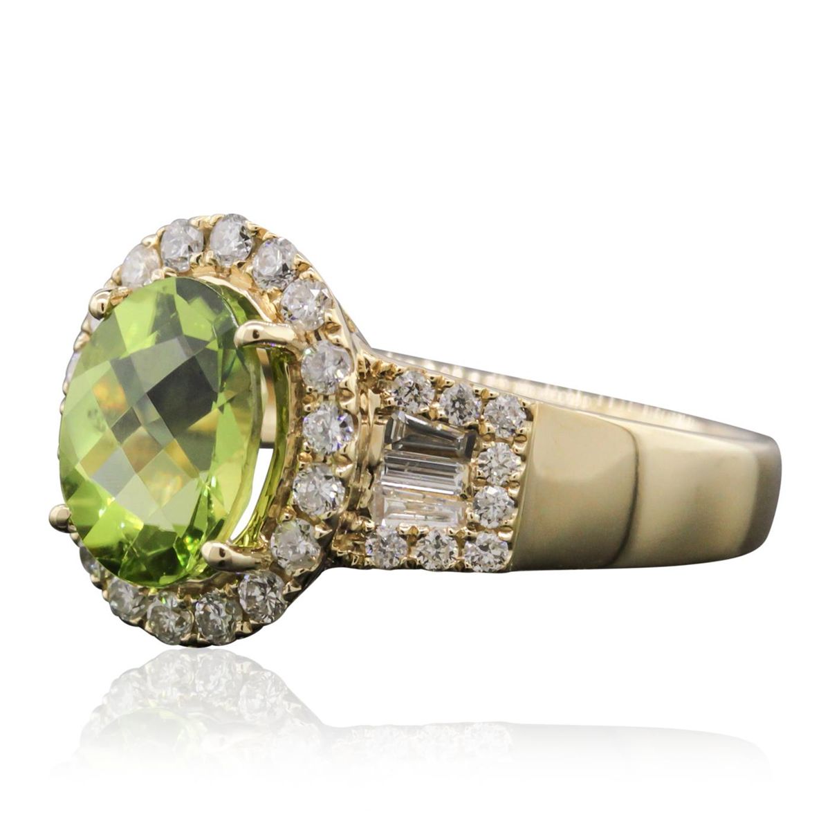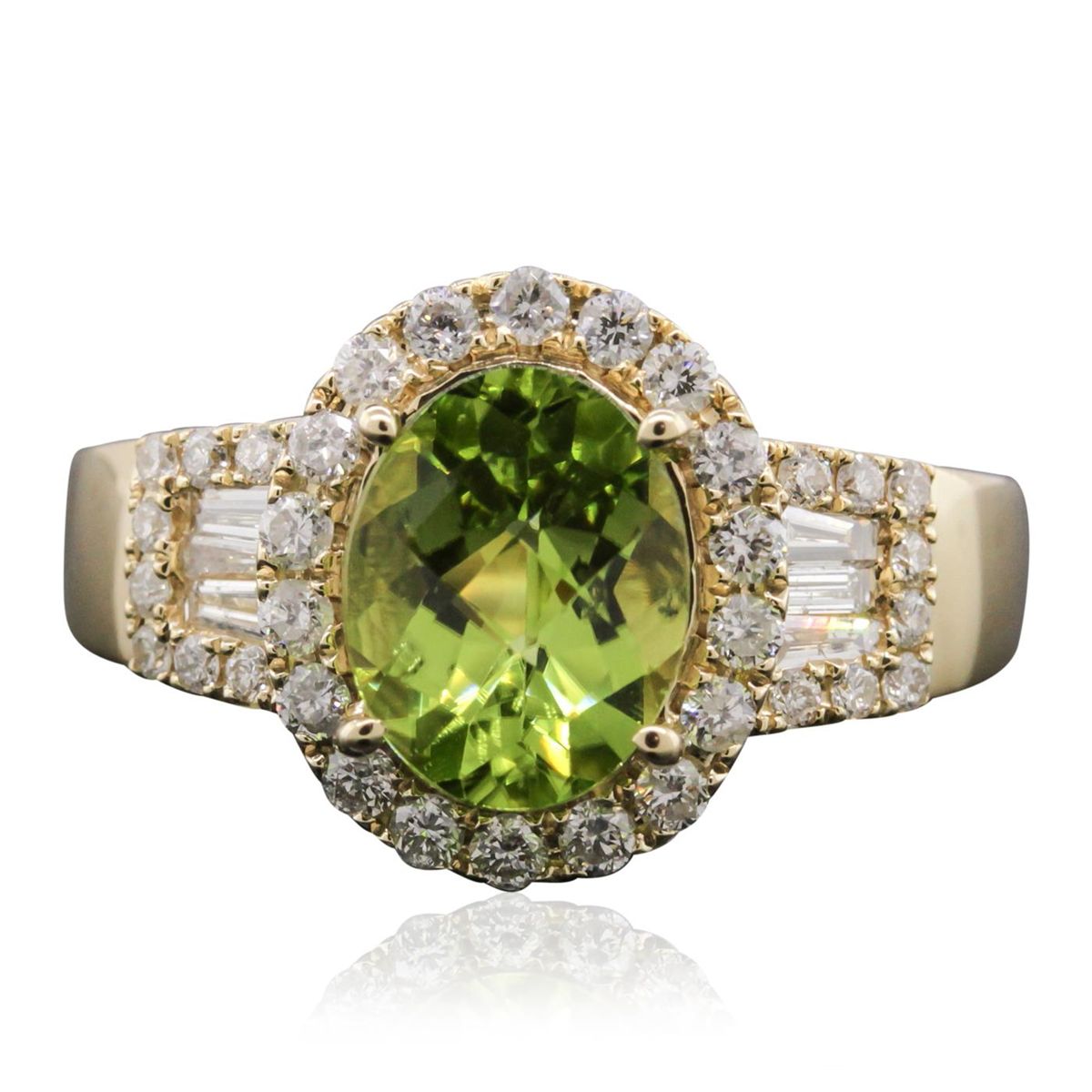 One electronically tested 14KT yellow gold Ladies combination cast & assembled ring with a bright polish finish. Condition is new. Identified with markings of "14K". Containing: One prong set oval modified mixed cut natural peridot, measuring 8.90 x 6.80 x 4.42mm, approximate weight of 1.82ct., clarity is eye clean, type II, medium, moderately strong, yellowish green color, (GIA yG 5/4), cut is very good. Thirty-Four prong set round brilliant cut diamonds, measuring 1.50 - 1.30 x 0.84mm (depth est.) approximate total weight of 34 Stones = 0.34ct. Clarity: I-1 to I-2. Color: I - J, Cut is Good. Six channel set baguette cut diamonds, measuring 3.50 x 1.30 x 1.11mm (depth est.) approximate total weight of 6 Stones = 0.20ct. Clarity: VS-2 to SI-1. Color: H - I, Cut is Good. Colored gemstones are presumed to have been subjected to commonly used enhancement processes. All diamonds and colored gemstones are graded in the mounting, unless otherwise stated. Total Weight of Colored Stones 1.82ct. Total Weight of Diamonds 0.54ct. Total Weight of Ring 4.70 grams. GGL Appraised at $4,430.00.