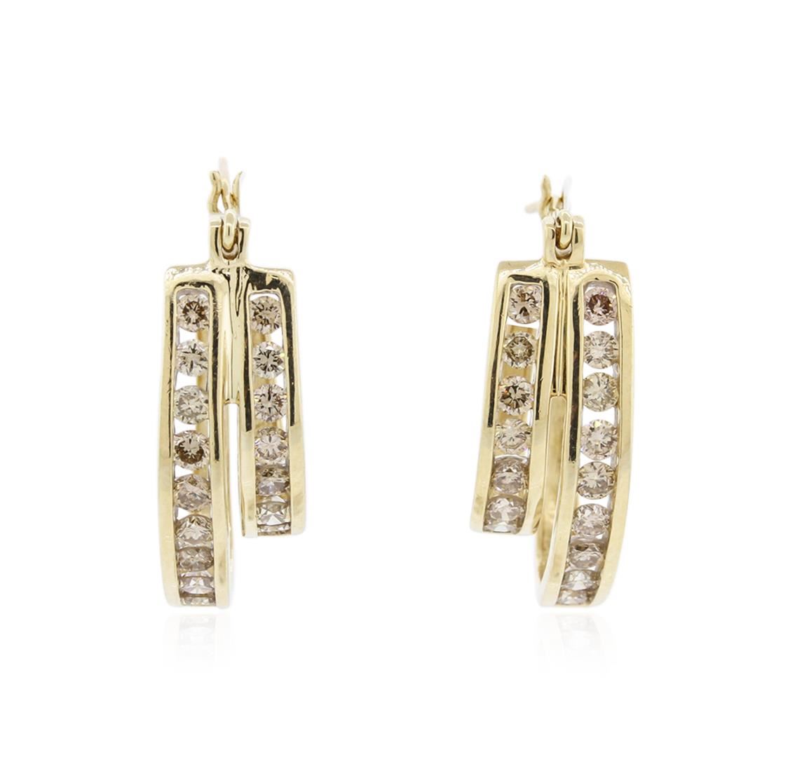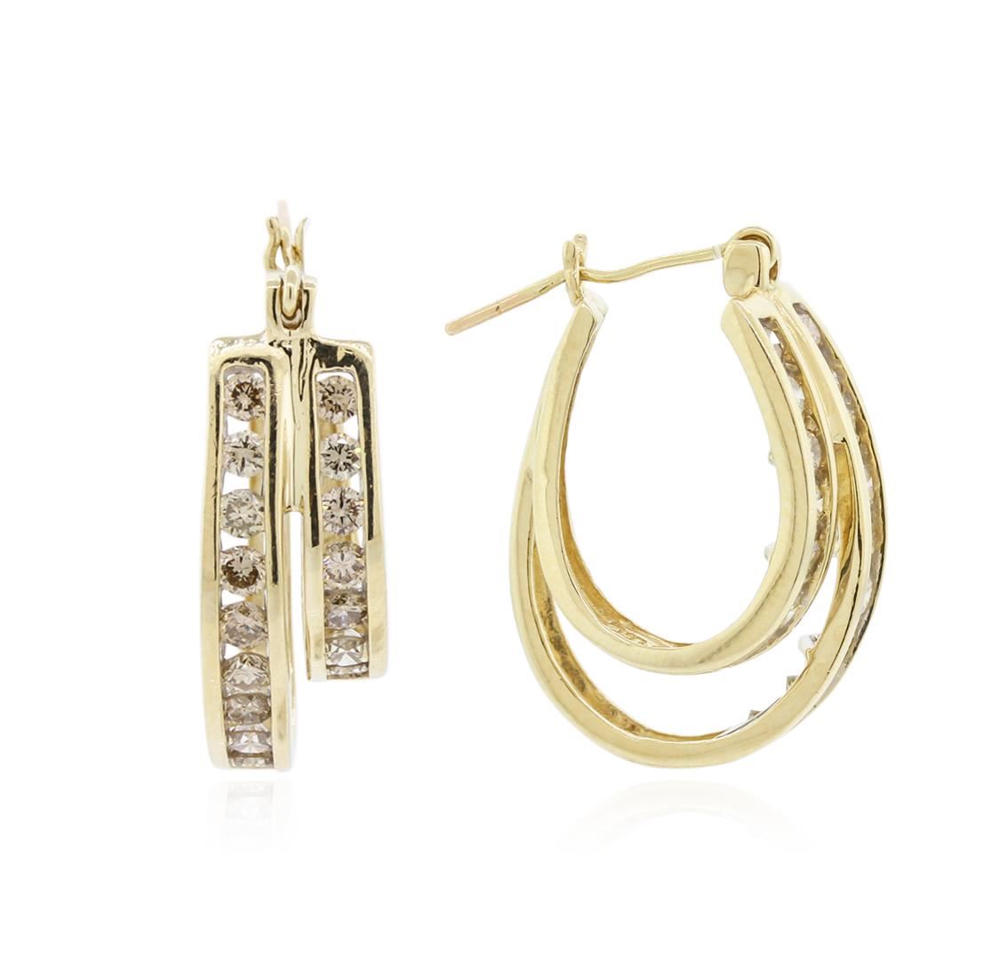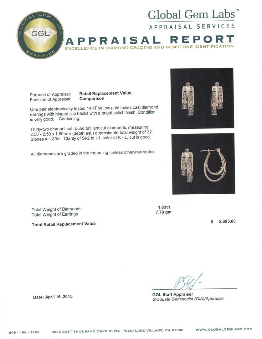 One pair electronically tested 14KT yellow gold ladies cast diamond earrings with hinged clip backs with a bright polish finish. Condition is very good. Containing: Thirty-Two channel set round brilliant cut diamonds, measuring 2.50 - 2.50 x 1.50mm (depth est.) approximate total weight of 32 Stones = 1.83ct. Clarity: SI-2 to I-1. Color: K - L, Cut is Good. All diamonds are graded in the mounting, unless otherwise stated. Total Weight of Diamonds 1.83ct. Total Weight of Earrings 7.70 grams. GGL Appraised at $2,695.00.