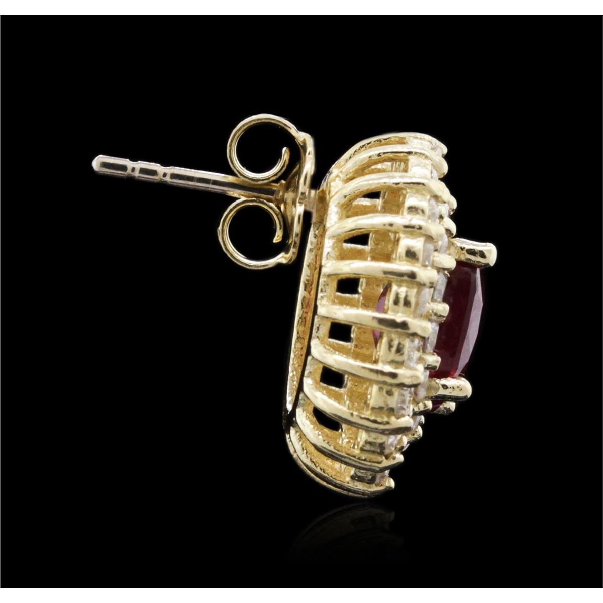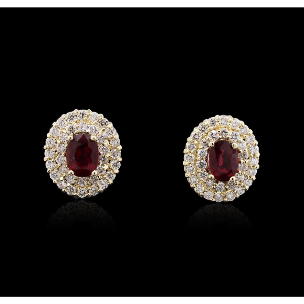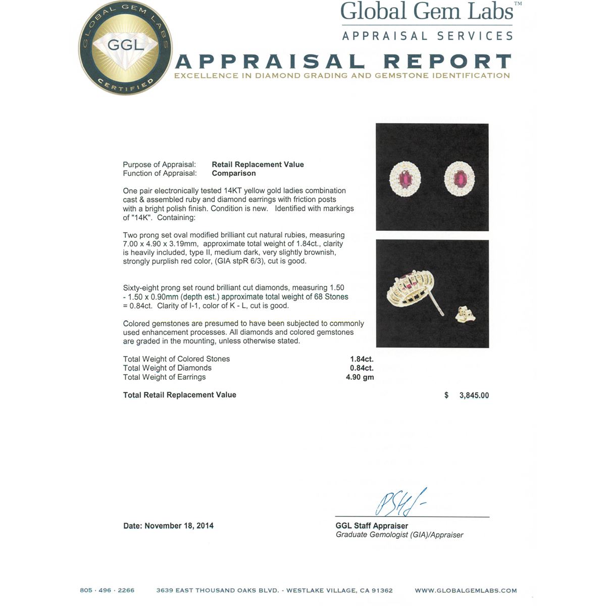 One pair electronically tested 14KT yellow gold ladies combination cast & assembled ruby and diamond earrings with friction posts with a bright polish finish. Identified with markings of "14K". Condition is new. Containing: Two prong set oval modified brilliant cut natural rubies, measuring 7.00 x 4.90 x 3.19mm, approximate total weight of 1.84ct., clarity is heavily included, type II, medium dark, very slightly brownish, strongly purplish red color, (GIA stpR 6/3), cut is good. Sixty-Eight prong set round brilliant cut diamonds, measuring 1.50 - 1.50 x 0.90mm (depth est.) approximate total weight of 68 Stones = 0.84ct. Clarity: I-1. Color: K - L, Cut is Good. Colored gemstones are presumed to have been subjected to commonly used enhancement processes. All diamonds and colored gemstones are graded in the mounting, unless otherwise stated. Total Weight of Colored Stones 1.84ct. Total Weight of Diamonds 0.84ct. Total Weight of Earrings 4.90 grams. GGL Appraised at $3,845.00.