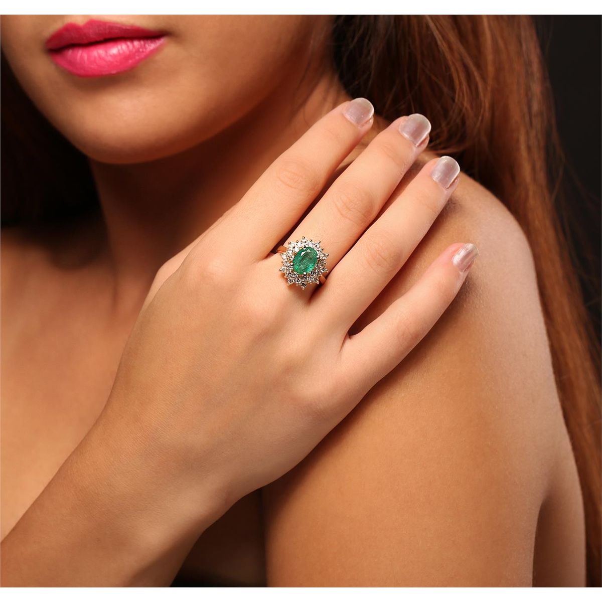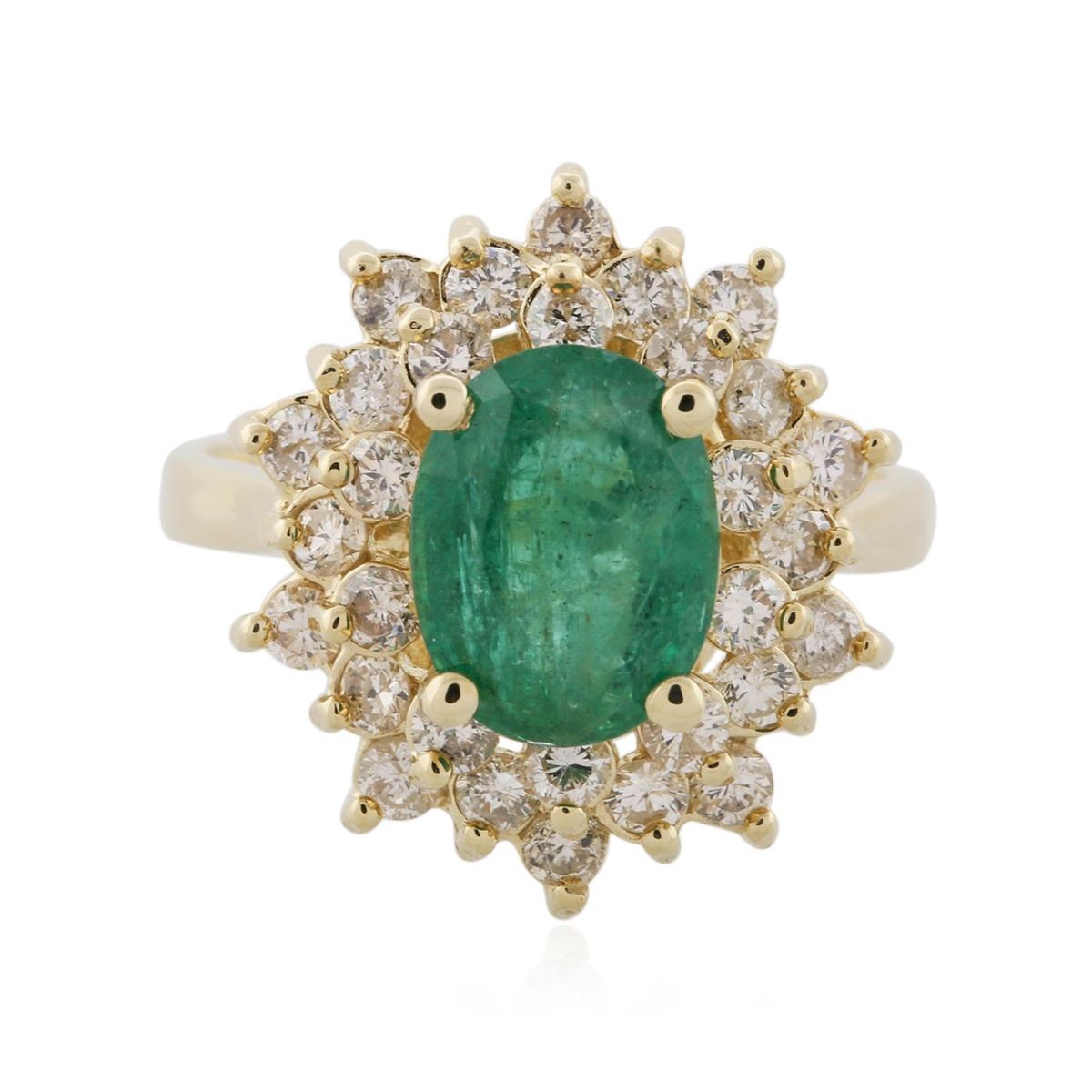 One electronically tested 14KT yellow gold Ladies combination cast & assembled fashion ring with a high polish finish. Condition is new. Identified with markings of "14K". Containing: One prong set oval modified mixed cut natural emerald, measuring 9.50 x 7.30 x 4.80mm, approximate weight of 1.84ct., clarity is heavily included, type III, medium light, moderately strong, very slightly bluish green color, (GIA vslbG 4/4), cut is good. Colored gemstones are presumed to have been subjected to commonly used and possible undetectable color/clarity enhancement processes. Thirty prong set round brilliant cut diamonds, measuring 2.00 - 2.00 x 1.20mm (depth est.) approximate total weight of 30 Stones = 0.88ct. Clarity of SI-2 to I-2, Color of J - L, Cut is Good. Total Weight of Colored Stones 1.84ct. Total Weight of Diamonds 0.88ct. Total Weight of Ring 5.70 grams. GGL Appraised at $6,870.00.