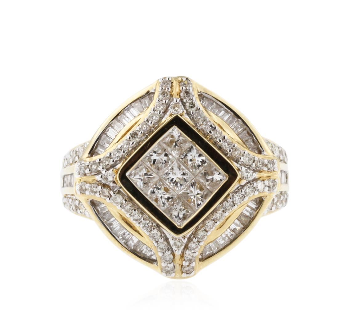 One electronically tested 14KT yellow gold cast diamond cluster ring with a bright finish. The ring features a princess cut diamond cluster bezel set within concave diamond ribbons, and an outer circular baguette cut diamond bezel, supported by tapering diamond set shoulders, completed by a three millimeter wide band. Trademark is CJ. Identified with markings of "14K". Condition is new, good workmanship. Containing: Nine invisible set princess cut diamonds, measuring 2.50 x 2.40 x 1.68mm (depth est.) approximate total weight of 9 Stones = 0.74ct. Graded in the setting. Clarity: I-1 to I-2. Color: H - I Sixty-Seven prong set round brilliant cut diamonds, measuring 1.60 - 1.20 x 0.84mm (depth est.) approximate total weight of 67 Stones = 0.67ct. Graded in the setting. Clarity: I-1 to I-2. Color: H - J Fifty-Nine channel set baguette cut (tapered) diamonds, measuring from 1.65 x 0.80 x 0.54mm (depth est.) to 1.80 x 0.80 x 0.56mm (depth est.) approximate total weight of 59 Stones = 0.44ct. Graded in the setting. Clarity: I-1 to I-2. Color: H - I. Total Weight of Diamonds 1.85ct. Total Weight of Ring 6.52 grams. AIG Appraised at $5,470.00.