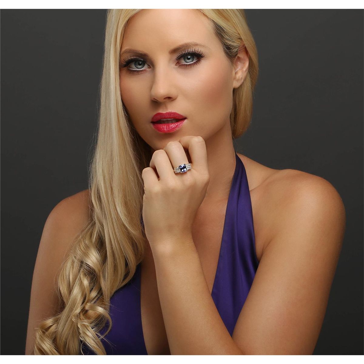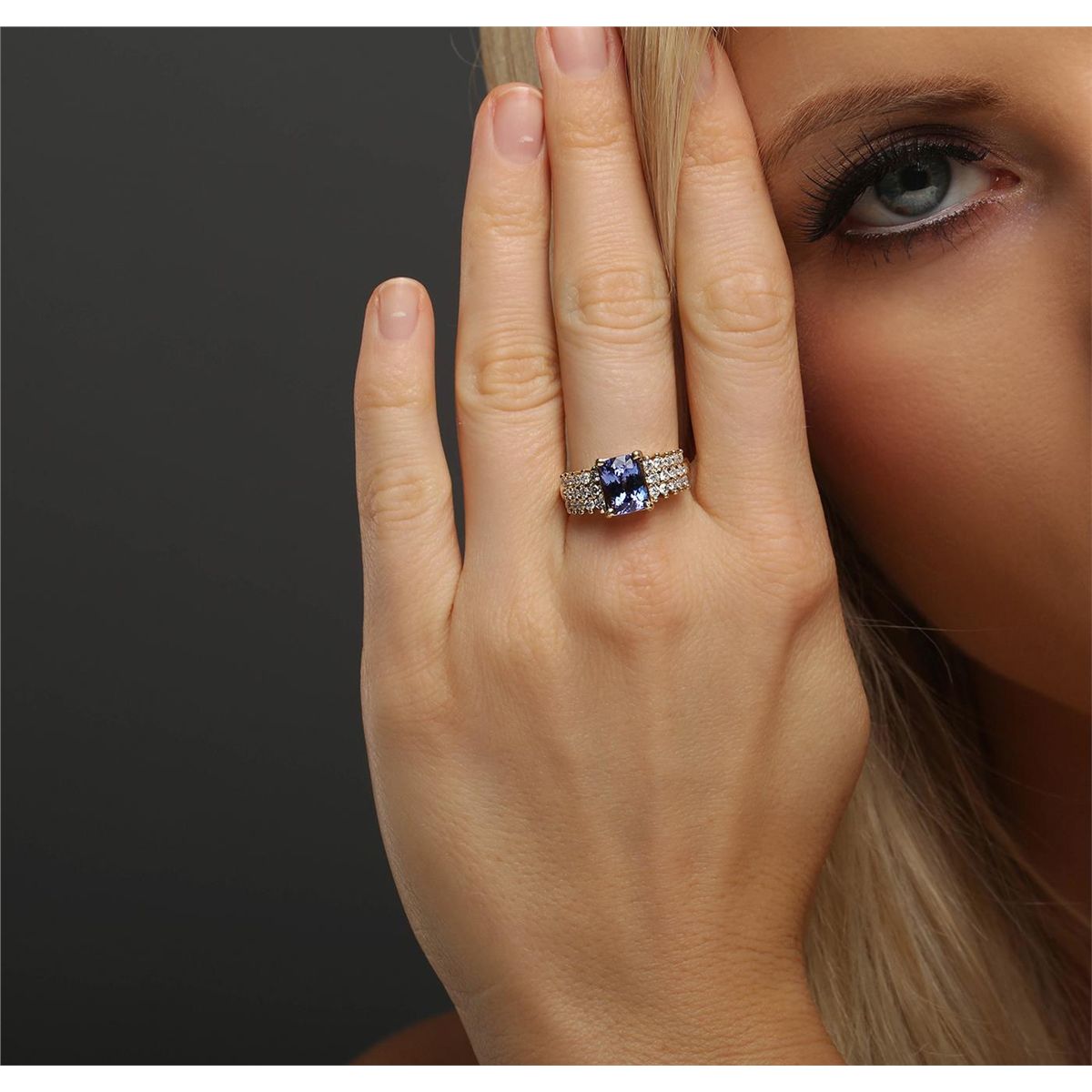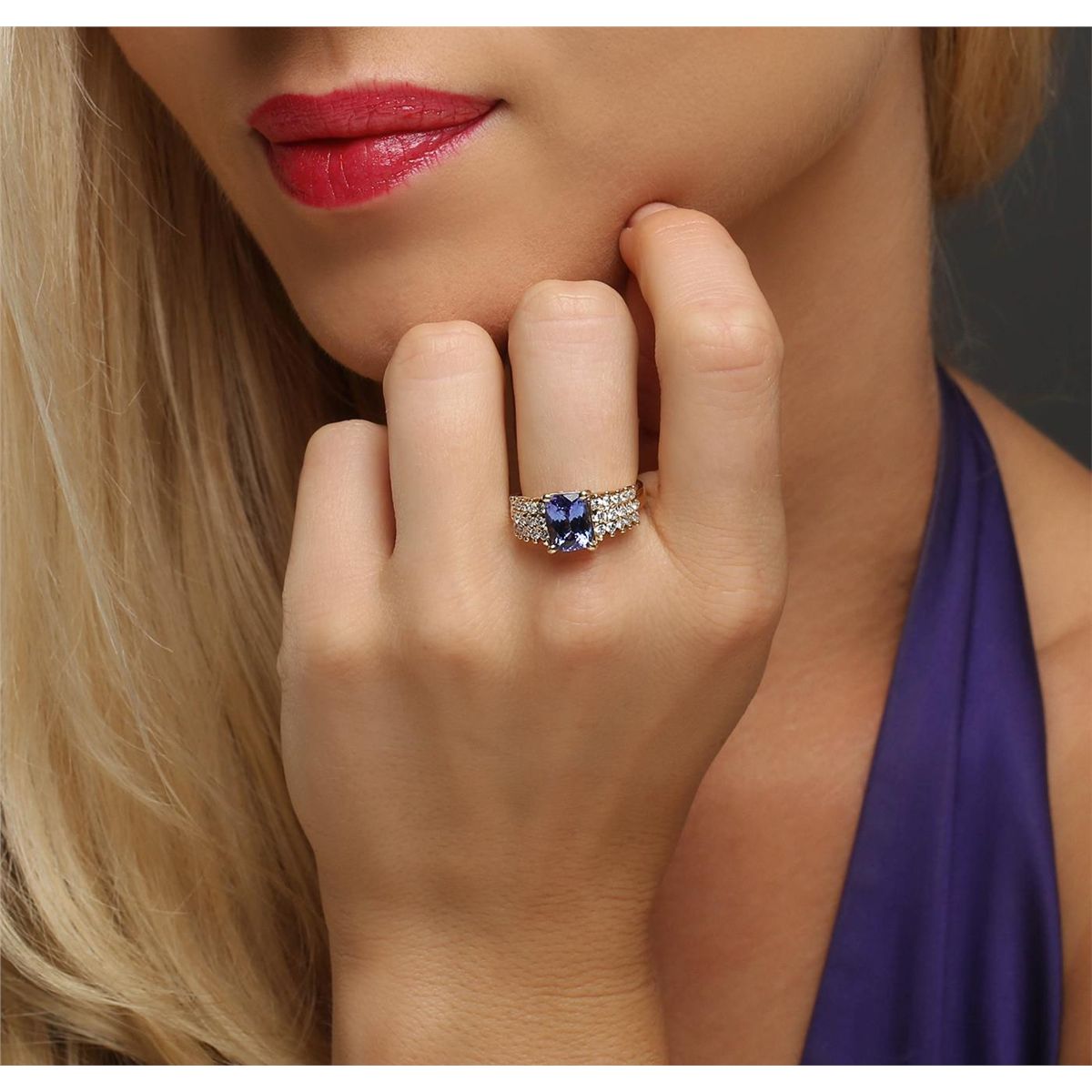 One electronically tested 14KT yellow gold ladies combination cast & assembled tanzanite and diamond ring with a flat shank with a bright polish finish. Identified with markings of "14K". Condition is new. Containing: One prong set rectangular cushion modified brilliant cut natural tanzanite, measuring 9.02 x 6.93 x 3.75mm, approximate weight of 1.85ct., clarity is eye clean, type I, medium light, very slightly grayish, violet color, (GIA V 4/3), cut is good. Thirty prong set round brilliant cut diamonds, measuring 1.70 - 1.70 x 1.02mm (depth est.) approximate total weight of 30 Stones = 0.54ct. Clarity: I-1 to I-2. Color: I - J, Cut is Good. Colored gemstones are presumed to have been subjected to commonly used enhancement processes. All diamonds and colored gemstones are graded in the mounting, unless otherwise stated total weight of Colored Stones 1.85ct. Total Weight of Diamonds 0.54ct. Total Weight of Ring 5.50 grams. GGL Appraised at $5,710.00.