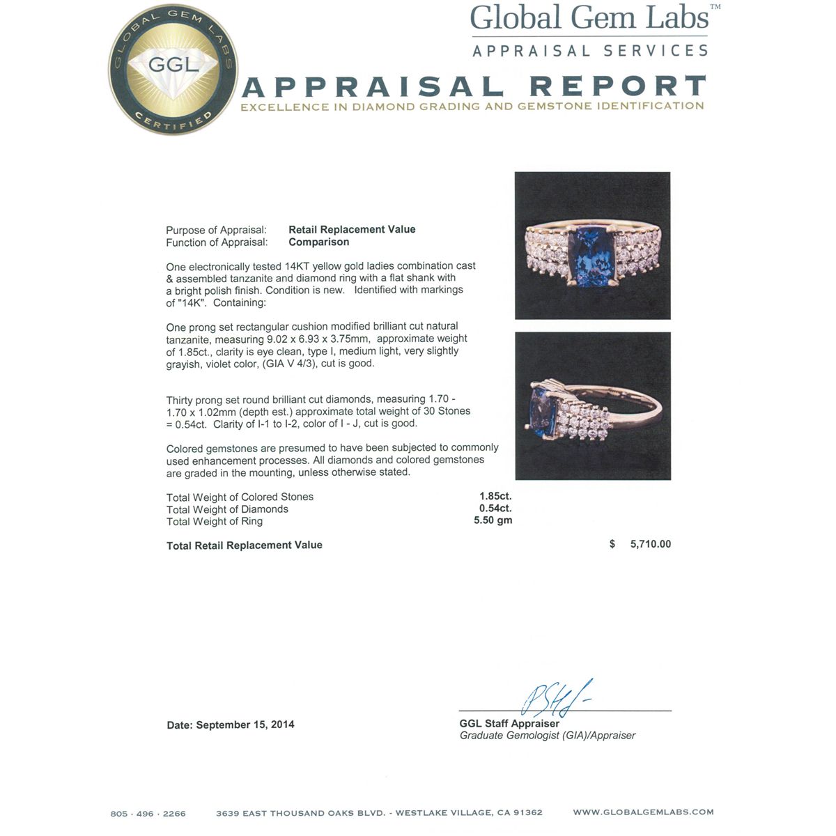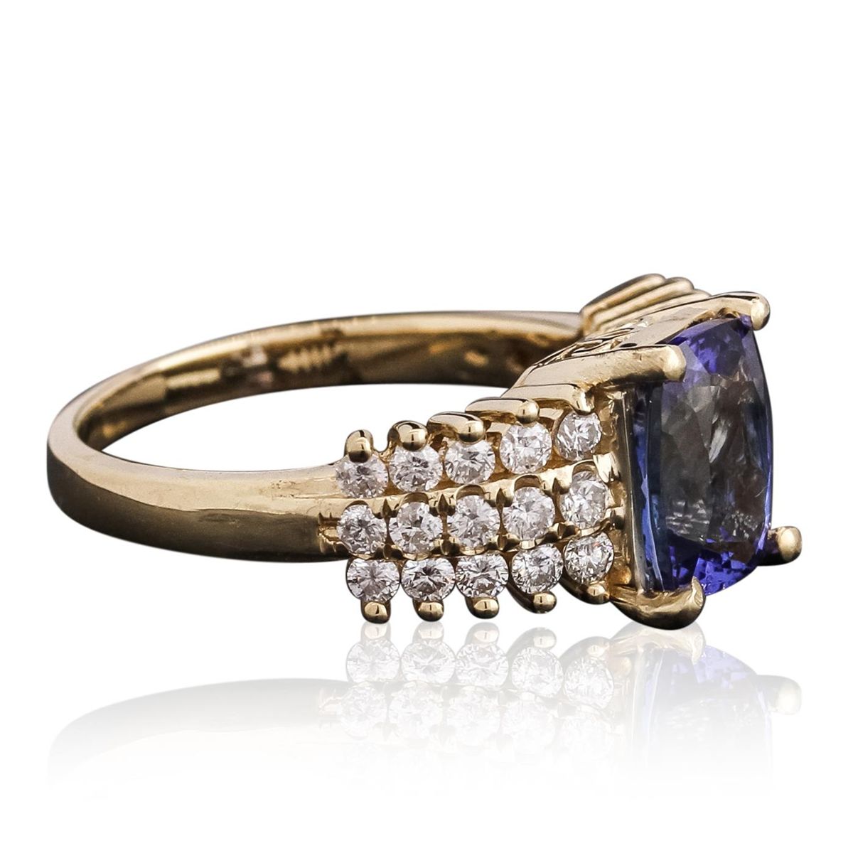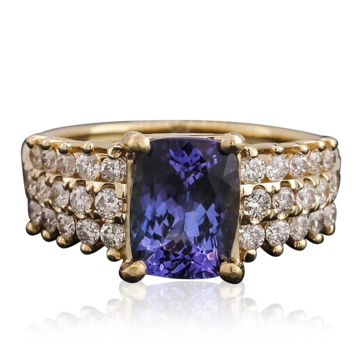 One electronically tested 14KT yellow gold ladies combination cast & assembled tanzanite and diamond ring with a flat shank with a bright polish finish. Identified with markings of "14K". Condition is new. Containing: One prong set rectangular cushion modified brilliant cut natural tanzanite, measuring 9.02 x 6.93 x 3.75mm, approximate weight of 1.85ct., clarity is eye clean, type I, medium light, very slightly grayish, violet color, (GIA V 4/3), cut is good. Thirty prong set round brilliant cut diamonds, measuring 1.70 - 1.70 x 1.02mm (depth est.) approximate total weight of 30 Stones = 0.54ct. Clarity: I-1 to I-2. Color: I - J, Cut is Good. Colored gemstones are presumed to have been subjected to commonly used enhancement processes. All diamonds and colored gemstones are graded in the mounting, unless otherwise stated total weight of Colored Stones 1.85ct. Total Weight of Diamonds 0.54ct. Total Weight of Ring 5.50 grams. GGL Appraised at $5,710.00.