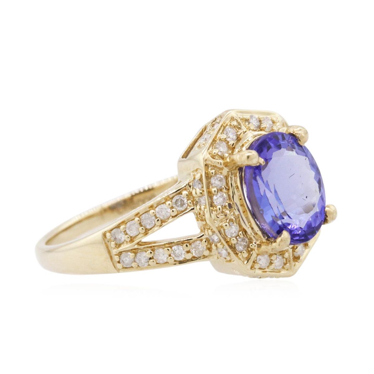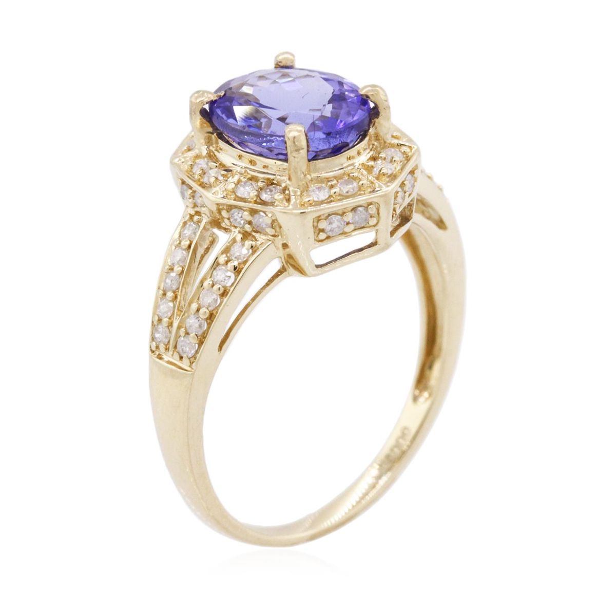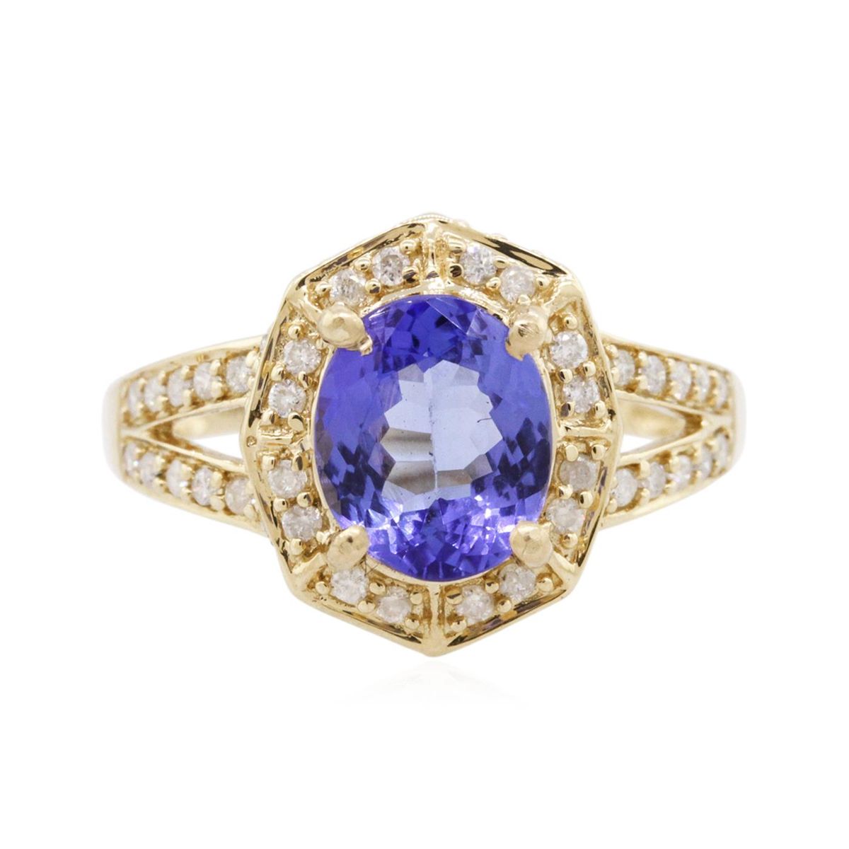 One electronically tested 14KT yellow gold ladies cast tanzanite and diamond ring with a bright polish finish. The featured tanzanite is set within a diamond bezel supported by diamond set split shoulders, completed by a one and one-half millimeter wide band. Trademark is Orianne. Identified with markings of "14K". Condition is new, good workmanship. Containing: One prong set oval brilliant cut natural tanzanite, measuring 8.40 x 7.00 x 4.40mm, 6% bulge factor, approximate weight of 1.85ct., clarity is eye clean, type I, medium dark, very slightly grayish, bluish violet color, (GIA bV 6/3), cut is good. Transmitting light with no distortion, transparent. Graded in the setting. Tanzanite is a very rare gemstone that is only found in the country of Tanzania. Originally discovered in 1967. Tiffany & Company, named the stone Tanzanite. It is found in the Usumburu Mountains that border the Umba Valley of northern Tanzania. Tanzanite occurs in gray, brown, violet, blue, reddish-purple, & green. The gem is interesting because of its exceptional pleochroism. Rotated in different directions a tanzanite will exhibit multiple changes of color. Tanzanite has a low tolerance to ultrasonic cleaning, and should not be cleaned using this method. Fifty-Two bead set round brilliant cut diamonds, measuring 1.30 - 1.20 x 0.75mm (depth est.) approximate total weight of 52 Stones = 0.47ct. Graded in the setting. Clarity: I-2 to I-3. Color: H - J. Total Weight of Colored Stones 1.85ct. Total Weight of Diamonds 0.47ct. Total Weight of Ring 3.43 grams. AIG Appraised at $5,170.00.