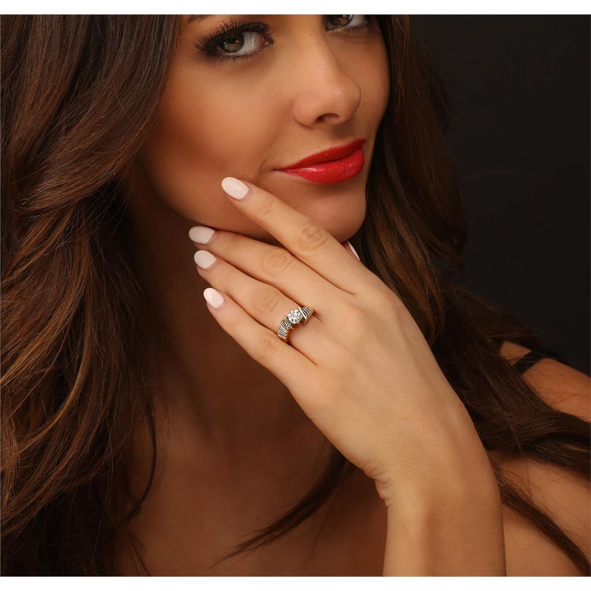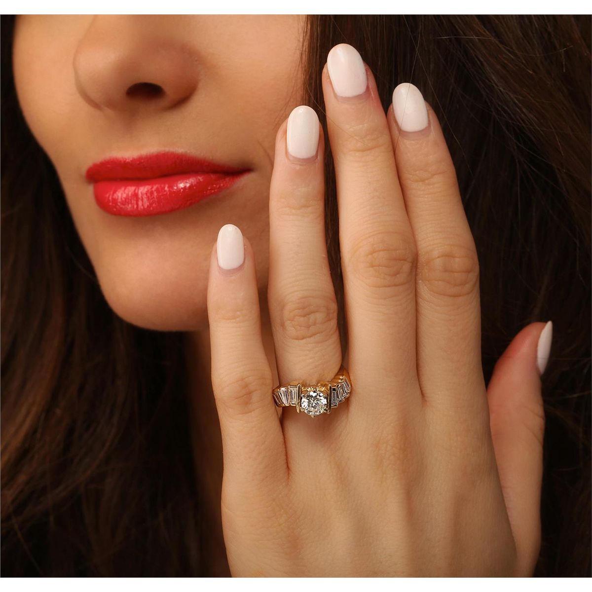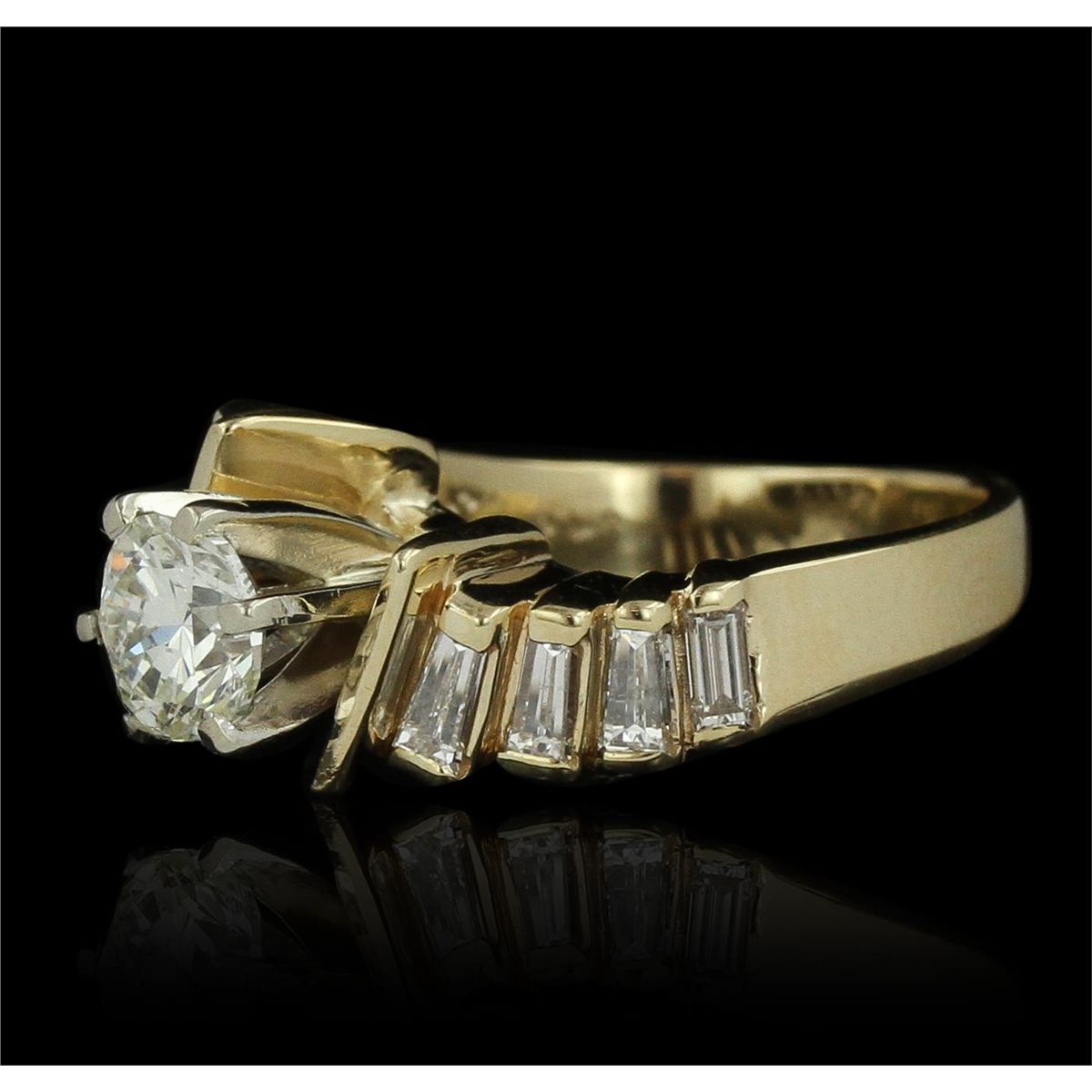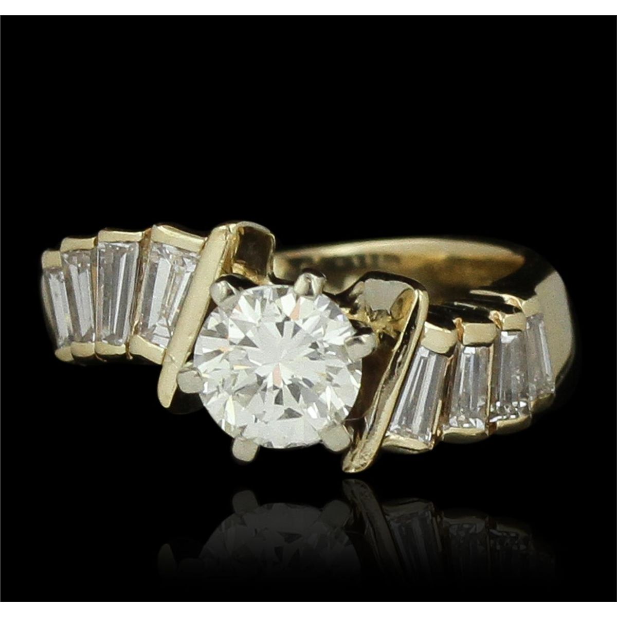 One electronically tested 14KT yellow gold ladies cast & assembled diamond unity ring with a bright polish finish. Condition is good. The featured diamond is supported by tapering diamond set shoulders, completed by a three millimeter wide band. Identified with markings of "14K". Containing: One prong set round brilliant cut diamond, measuring 6.10 - 6.00 x 4.20mm (depth est.), 3.00.%. GTCF approximate weight of 1.06ct with a medium blue fluorescence. Graded in the setting. Clarity: SI-1. Color: 69.4%. Table 64.5%. Eight channel set baguette cut (tapered) diamonds, measuring from 3.90 x 1.80 x 1.26mm (depth est.) to 4.20 x 2.00 x 1.40mm (depth est.) approximate. Total Weight of 8 Stones = 0.80ct. Graded in the setting. Clarity: VS-1 to VS-2. Color: H - I. Total Weight of Diamonds 1.86ct. Total Weight of Ring 7.68 grams. AIG Appraised at $24,040.00.