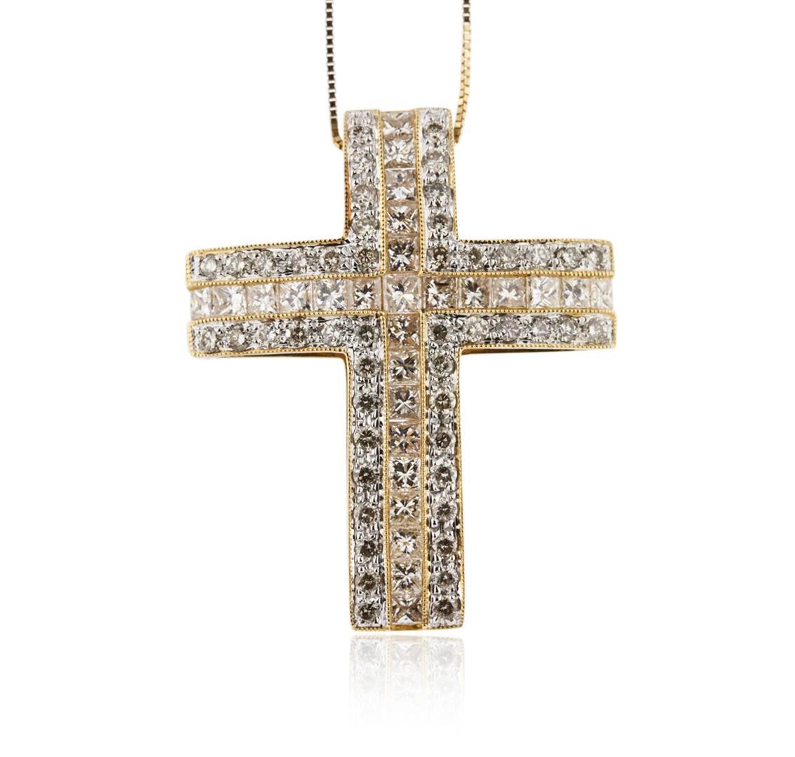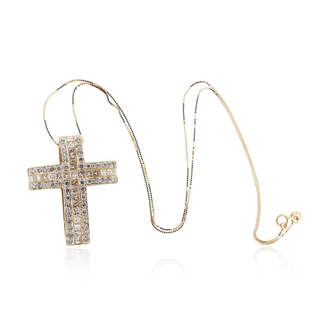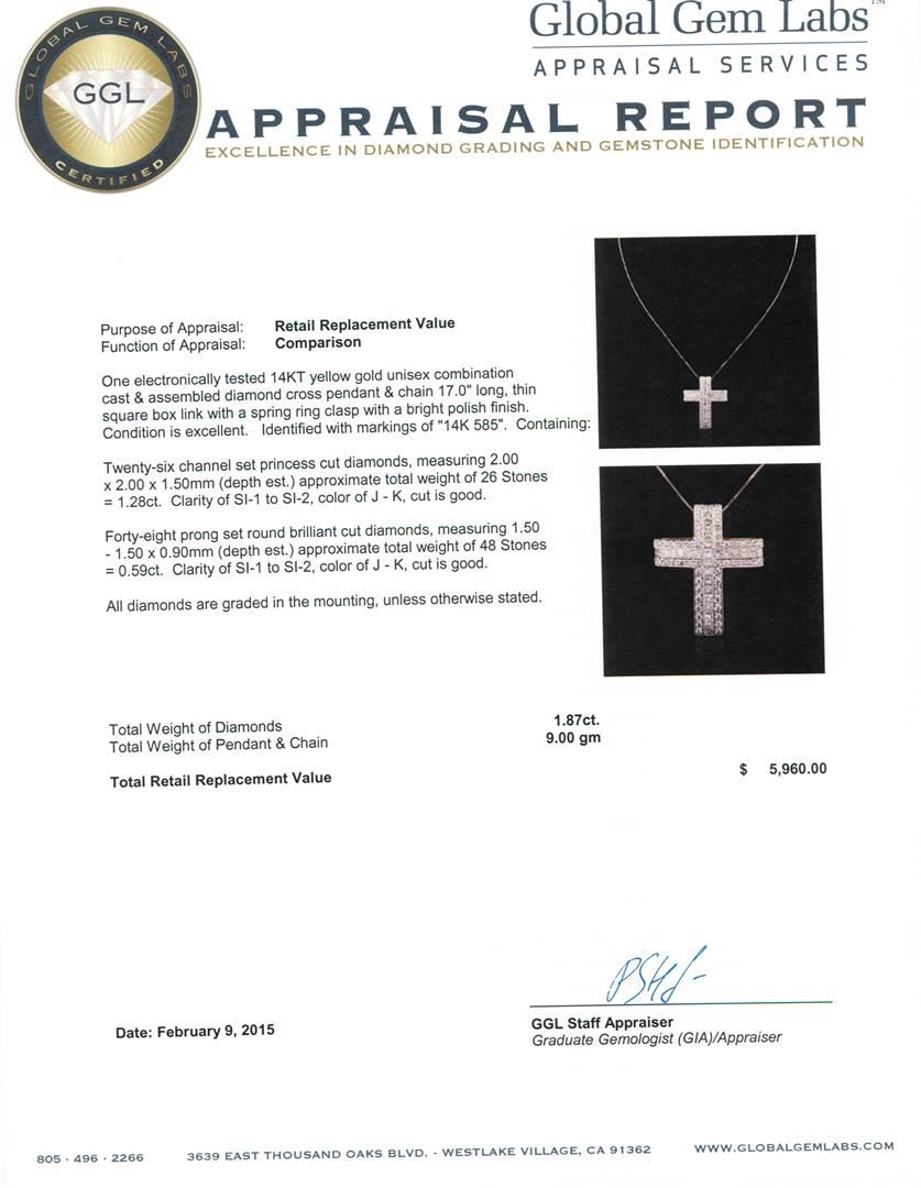 One electronically tested 14KT yellow gold unisex combination cast & assembled diamond cross pendant & chain 17.0" long, thin square box link with a spring ring clasp with a bright polish finish. Identified with markings of "14K 585". Condition is excellent. Containing: Twenty-Six channel set princess cut diamonds, measuring 2.00 x 2.00 x 1.50mm (depth est.) approximate total weight of 26 Stones = 1.28ct. Clarity: SI-1 to SI-2. Color: J - K, Cut is Good. Forty-Eight prong set round brilliant cut diamonds, measuring 1.50 - 1.50 x 0.90mm (depth est.) approximate total weight of 48 Stones = 0.59ct. Clarity: SI-1 to SI-2. Color: J - K, Cut is Good. All diamonds are graded in the mounting, unless otherwise stated. Total Weight of Diamonds 1.87ct. Total Weight of Pendant & Chain 9.00 grams. GGL Appraised at $5,960.00.