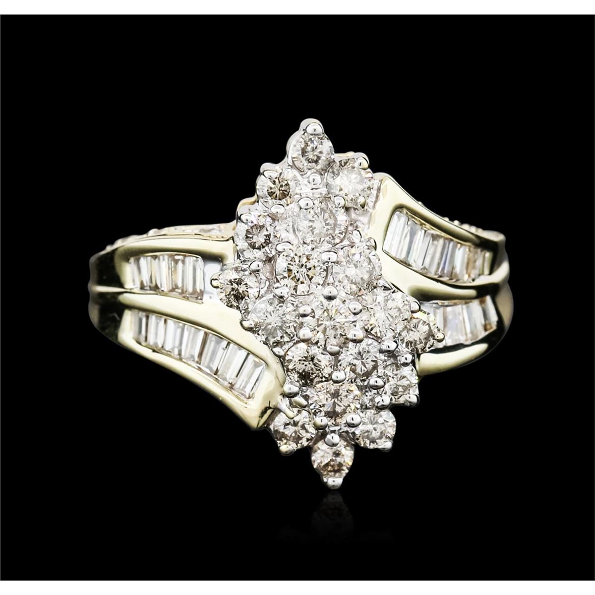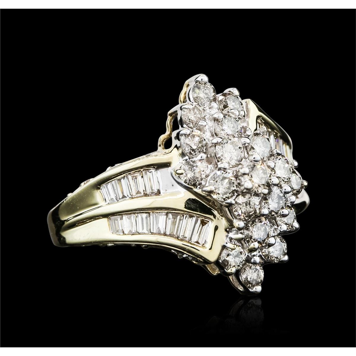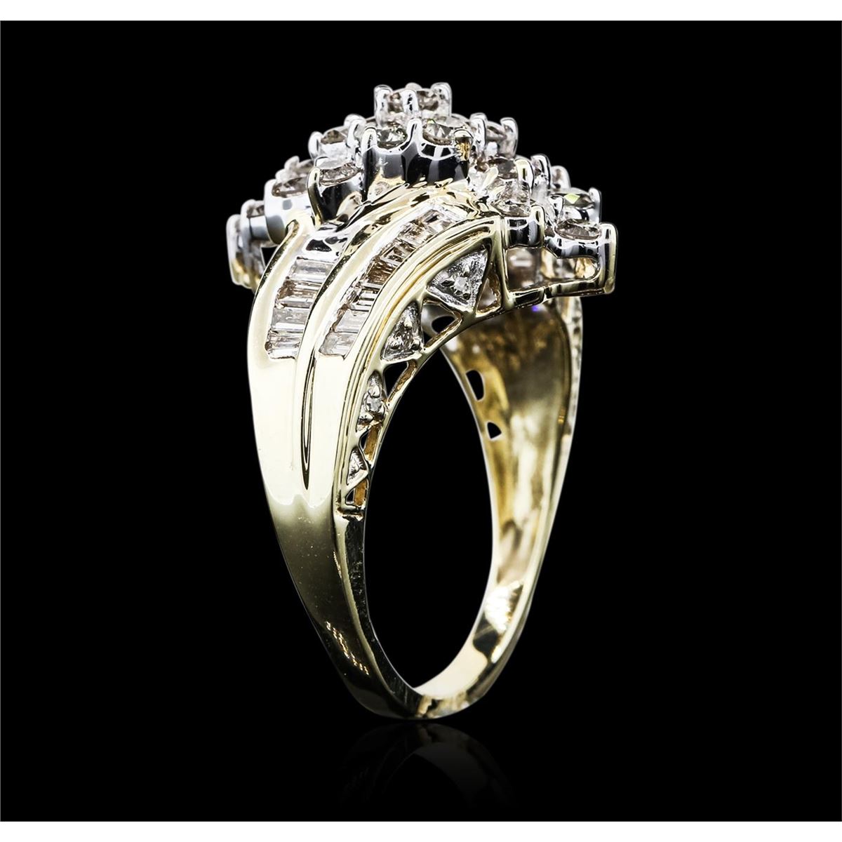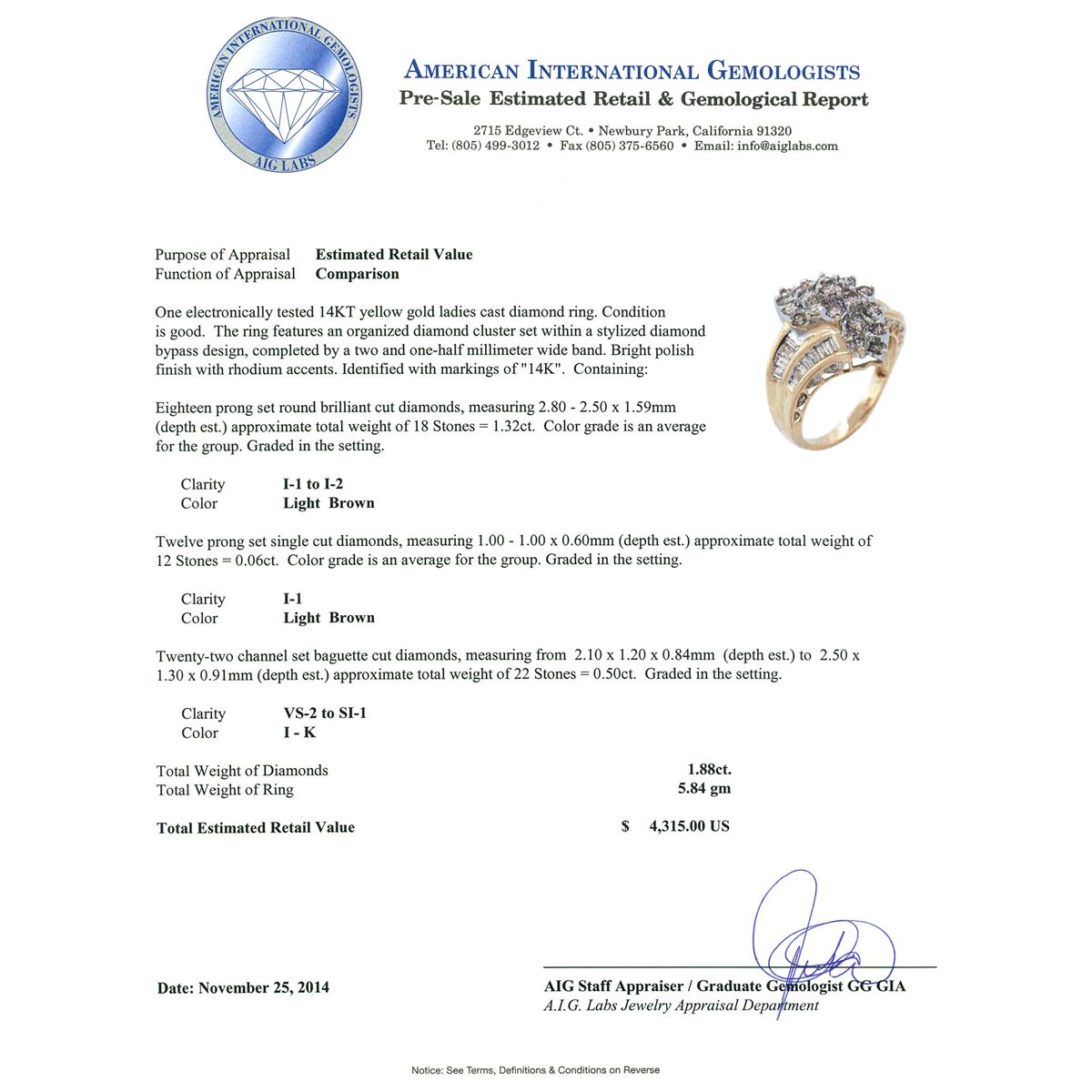 One electronically tested 14KT yellow gold ladies cast diamond ring. The ring features an organized diamond cluster set within a stylized diamond bypass design, completed by a two and one-half millimeter wide band. Bright polish finish with rhodium accents. Identified with markings of "14K". Condition is good. Containing: Eighteen prong set round brilliant cut diamonds, measuring 2.80 - 2.50 x 1.59mm (depth est.) approximate total weight of 18 Stones = 1.32ct. Color grade is an average for the group. Graded in the setting. Clarity: I-1 to I-2 Twelve prong set single cut diamonds, measuring 1.00 - 1.00 x 0.60mm (depth est.) approximate total weight of 12 Stones = 0.06ct. Color grade is an average for the group. Graded in the setting. Clarity: I-1 Twenty-Two channel set baguette cut diamonds, measuring from 2.10 x 1.20 x 0.84mm (depth est.) to 2.50 x 1.30 x 0.91mm (depth est.) approximate total weight of 22 Stones = 0.50ct. Graded in the setting. Clarity: VS-2 to SI-1. Color: I - K. Total Weight of Diamonds 1.88ct. Total Weight of Ring 5.84 grams. AIG Appraised at $4,315.00.