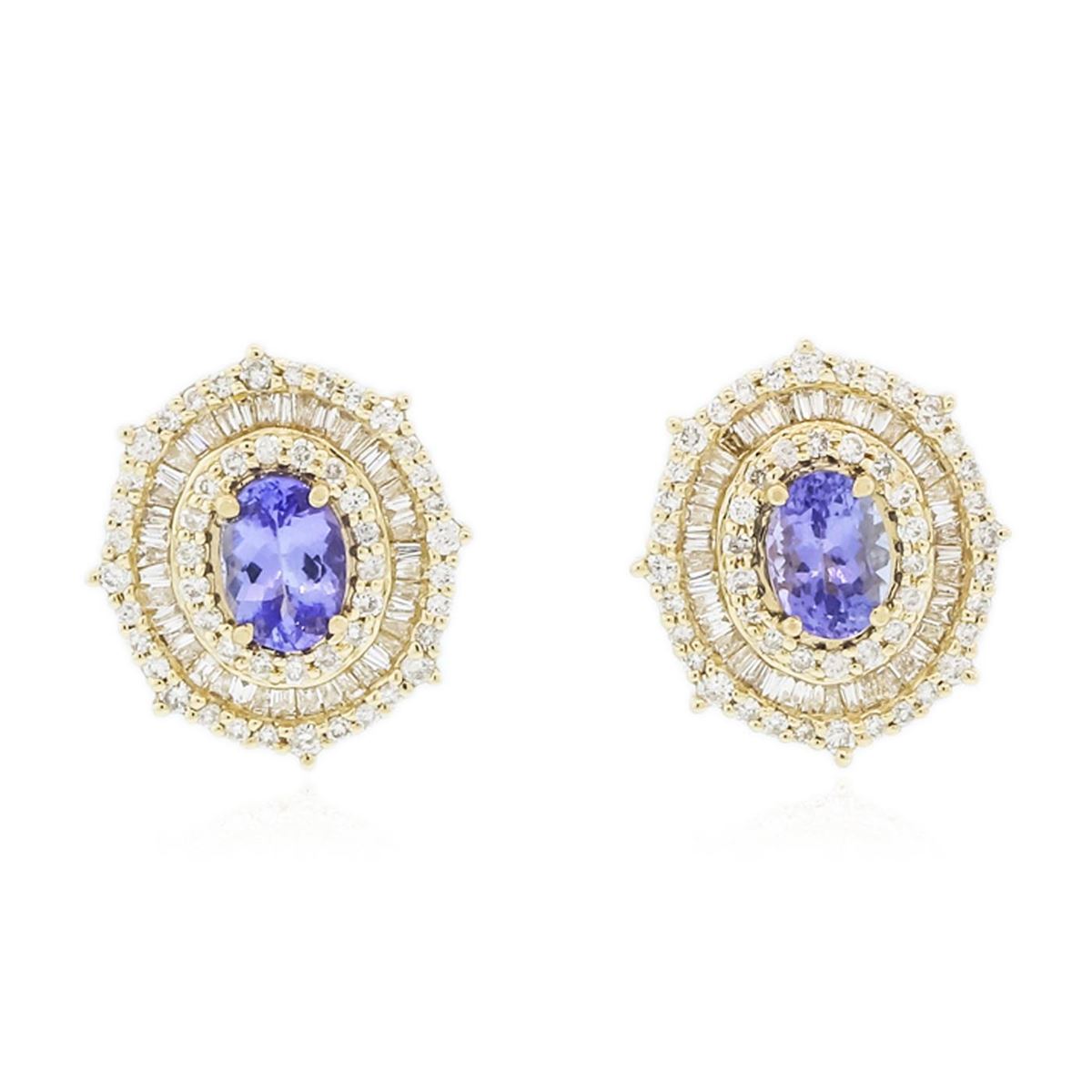 One pair electronically tested 14KT yellow gold ladies combination cast & assembled stud earrings with friction posts with a bright polish finish.  Identified with markings of "14K". Condition is new. Containing: Two prong set oval modified brilliant cut natural tanzanites, measuring 7.40 x 5.32 x 3.46mm, approximate total weight of 1.88ct., clarity is eye clean, type I, medium light, very slightly grayish, violet color, (GIA V 4/3), cut is good. One Hundred prong set round brilliant cut diamonds, measuring 1.50 - 1.10 x 0.78mm (depth est.) approximate total weight of 100 Stones = 0.80ct. Clarity: SI-1 to I-1. Color: I - J, Cut is Good.  Eighty channel set baguette cut diamonds, measuring 1.50 x 1.10 x 0.94mm (depth est.) approximate total weight of 80 Stones = 1.13ct. Clarity: SI-1. Color: I - J, Cut is Good. Colored gemstones are presumed to have been subjected to commonly used enhancement processes. All diamonds and colored gemstones are graded in the mounting, unless otherwise stated. Total Weight of Colored Stones 1.88ct. Total Weight of Diamonds 1.93ct. Total Weight of Earrings 8.10 grams. GGL Appraised at $9,905.00.