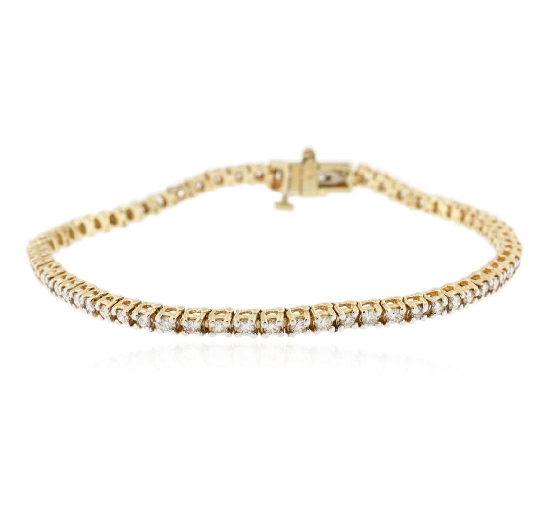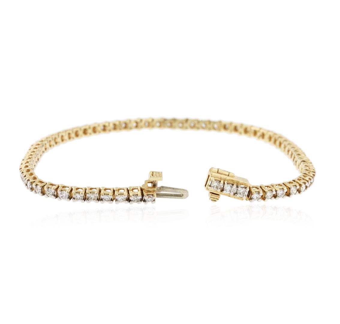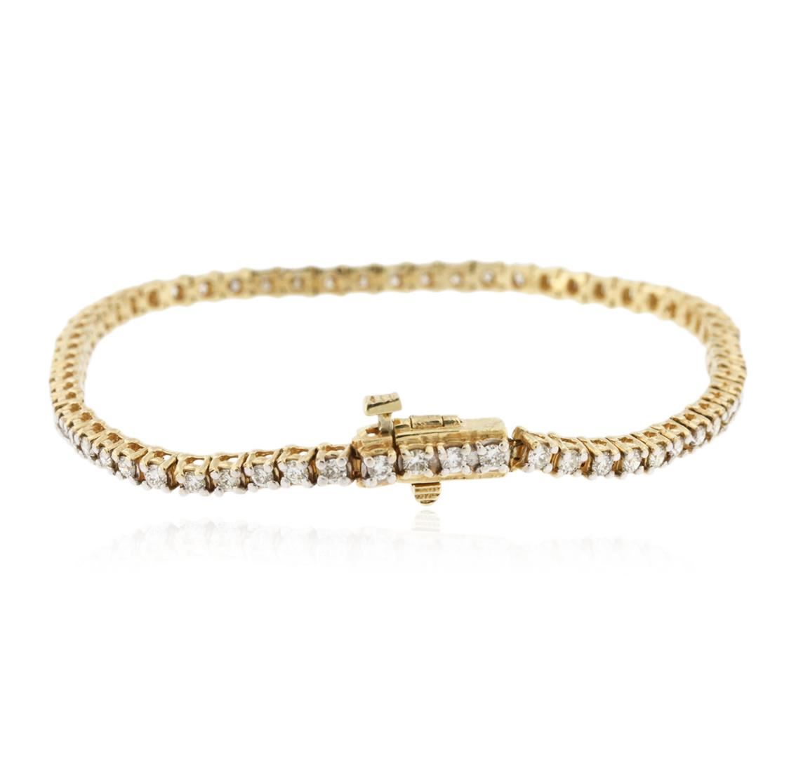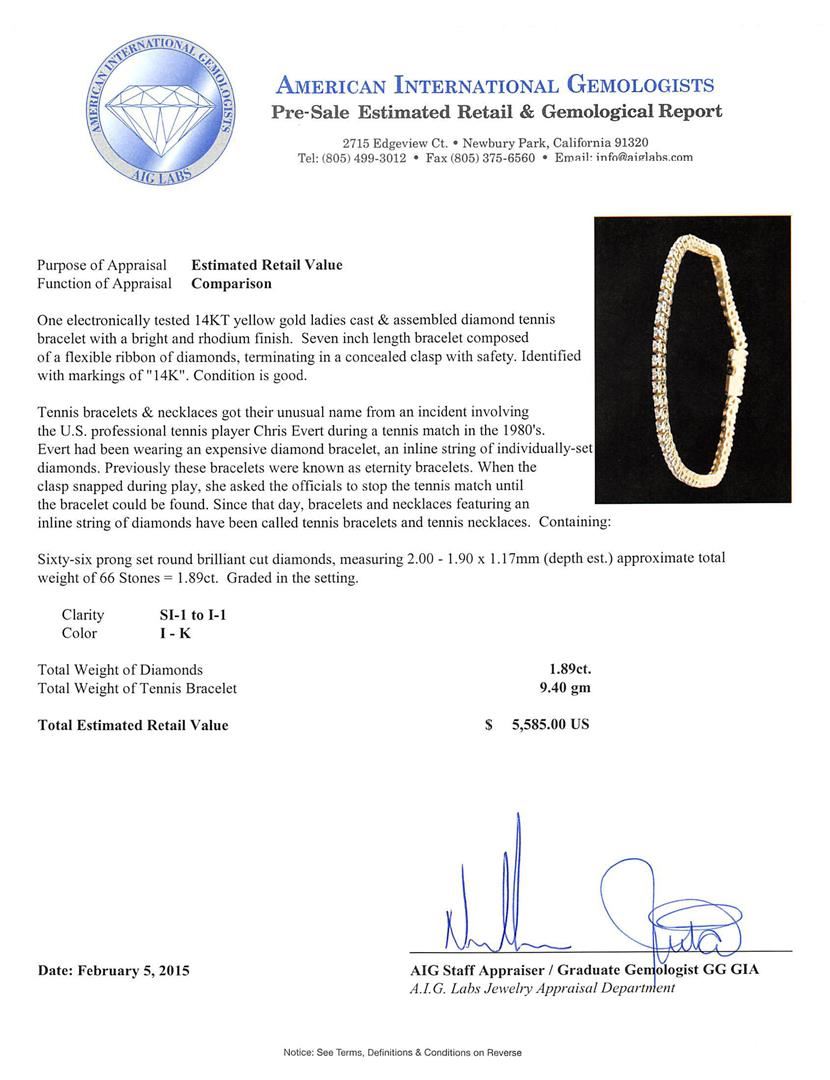 One electronically tested 14KT yellow gold ladies cast & assembled diamond tennis bracelet with a bright and rhodium finish. Seven inch length bracelet composed of a flexible ribbon of diamonds, terminating in a concealed clasp with safety. Identified with markings of "14K". Condition is good. Tennis bracelets & necklaces got their unusual name from an incident involving the U.S. professional tennis player Chris Evert during a tennis match in the 1980's. Evert had been wearing an expensive diamond bracelet, an inline string of individually-set diamonds. Previously these bracelets were known as eternity bracelets. When the clasp snapped during play, she asked the officials to stop the tennis match until the bracelet could be found. Since that day, bracelets and necklaces featuring an inline string of diamonds have been called tennis bracelets and tennis necklaces. Containing: Sixty-Six prong set round brilliant cut diamonds, measuring 2.00 - 1.90 x 1.17mm (depth est.) approximate total weight of 66 Stones = 1.89ct. Graded in the setting. Clarity: SI-1 to I-1. Color: I - K. Total Weight of Diamonds 1.89ct. Total Weight of Tennis Bracelet 9.40 grams. AIG Appraised at $5,585.00.