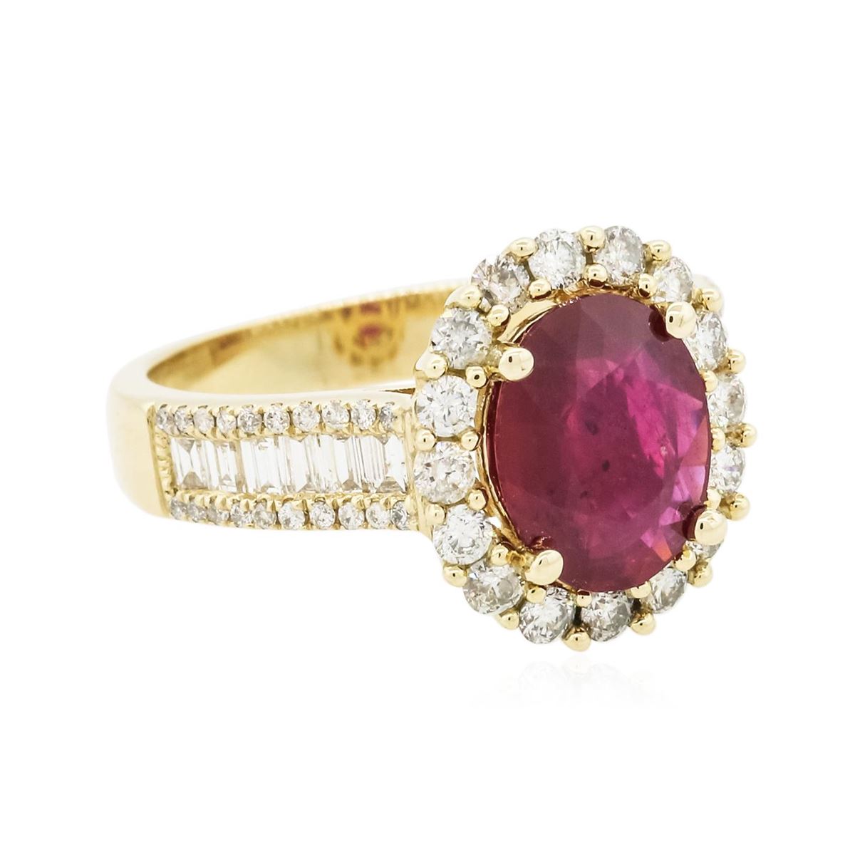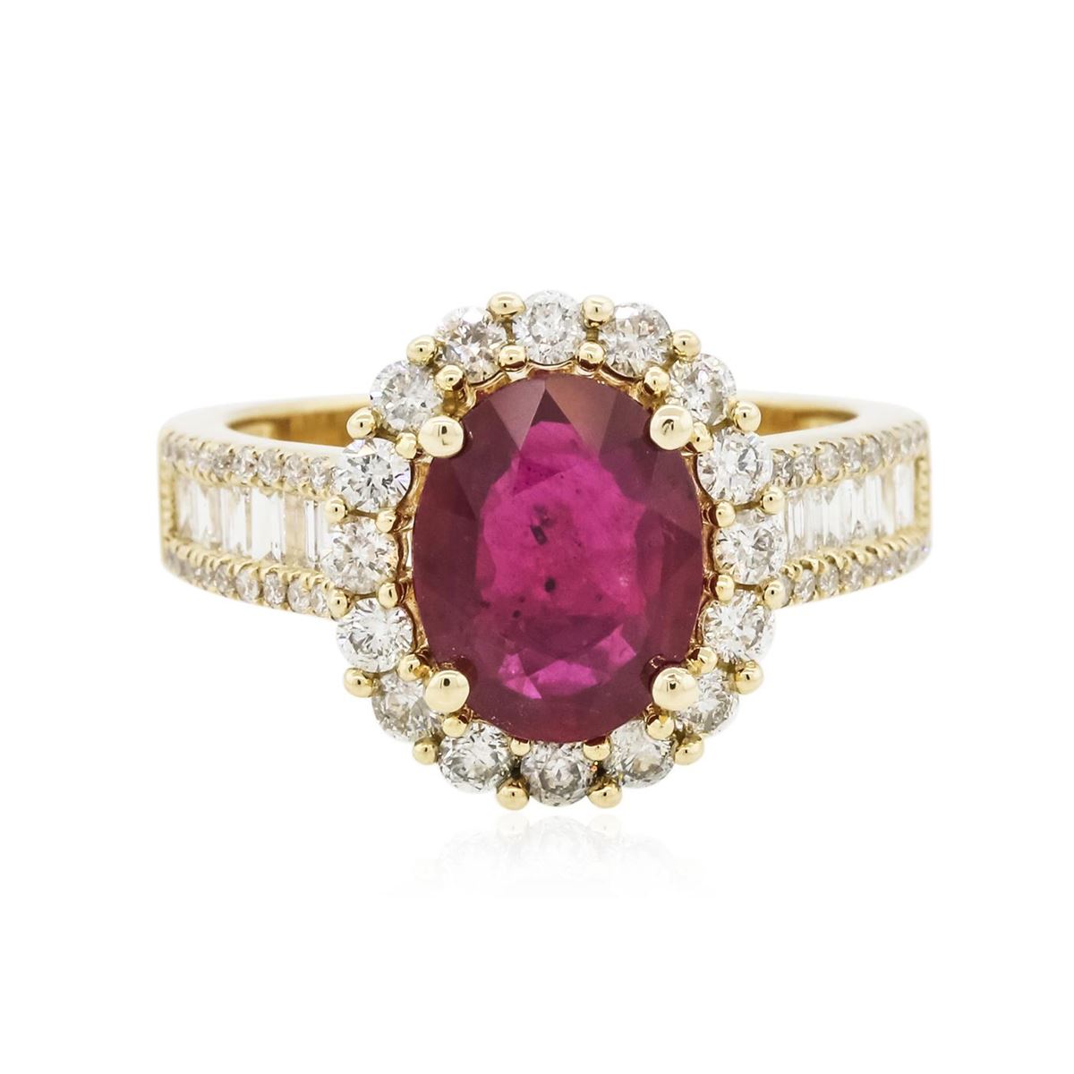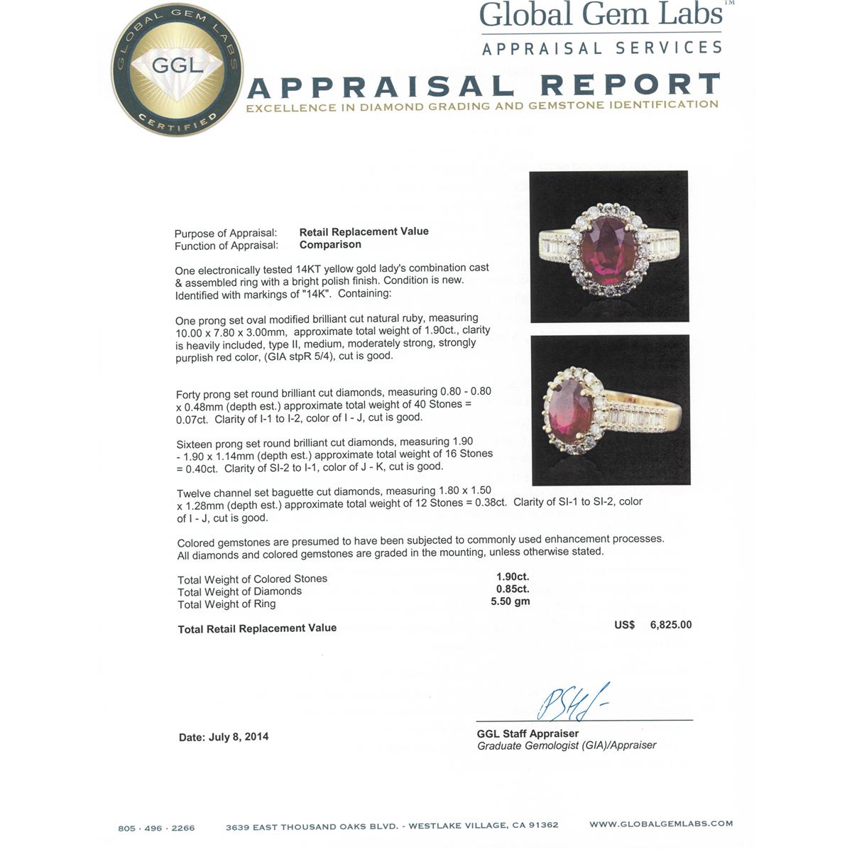 One electronically tested 14KT yellow gold Ladies combination cast & assembled ring with a bright polish finish. Condition is new. Identified with markings of "14K". Containing: One prong set oval modified brilliant cut natural ruby, measuring 10.00 x 7.80 x 3.00mm, approximate. Total Weight of 1.90ct., clarity is heavily included, type II, medium, moderately strong, strongly purplish red color, (GIA stpR 5/4), cut is good. Forty prong set round brilliant cut diamonds, measuring 0.80 - 0.80 x 0.48mm (depth est.) approximate. Total Weight of 40 Stones = 0.07ct. Clarity: I-1 to I-2. Color: I - J, Cut is Good. Sixteen prong set round brilliant cut diamonds, measuring 1.90 - 1.90 x 1.14mm (depth est.) approximate. Total Weight of 16 Stones = 0.40ct. Clarity: SI-2 to I-1. Color: J - K, Cut is Good. Twelve channel set baguette cut diamonds, measuring 1.80 x 1.50 x 1.28mm (depth est.) approximate. Total Weight of 12 Stones = 0.38ct. Clarity: SI-1 to SI-2. Color: I - J, Cut is Good. Colored gemstones are presumed to have been subjected to commonly used enhancement processes. All diamonds and colored gemstones are graded in the mounting, unless otherwise stated. Total Weight of Colored Stones 1.90ct. Total Weight of Diamonds 0.85ct. Total Weight of Ring 5.50 grams. GGL Appraised at $6,825.00.