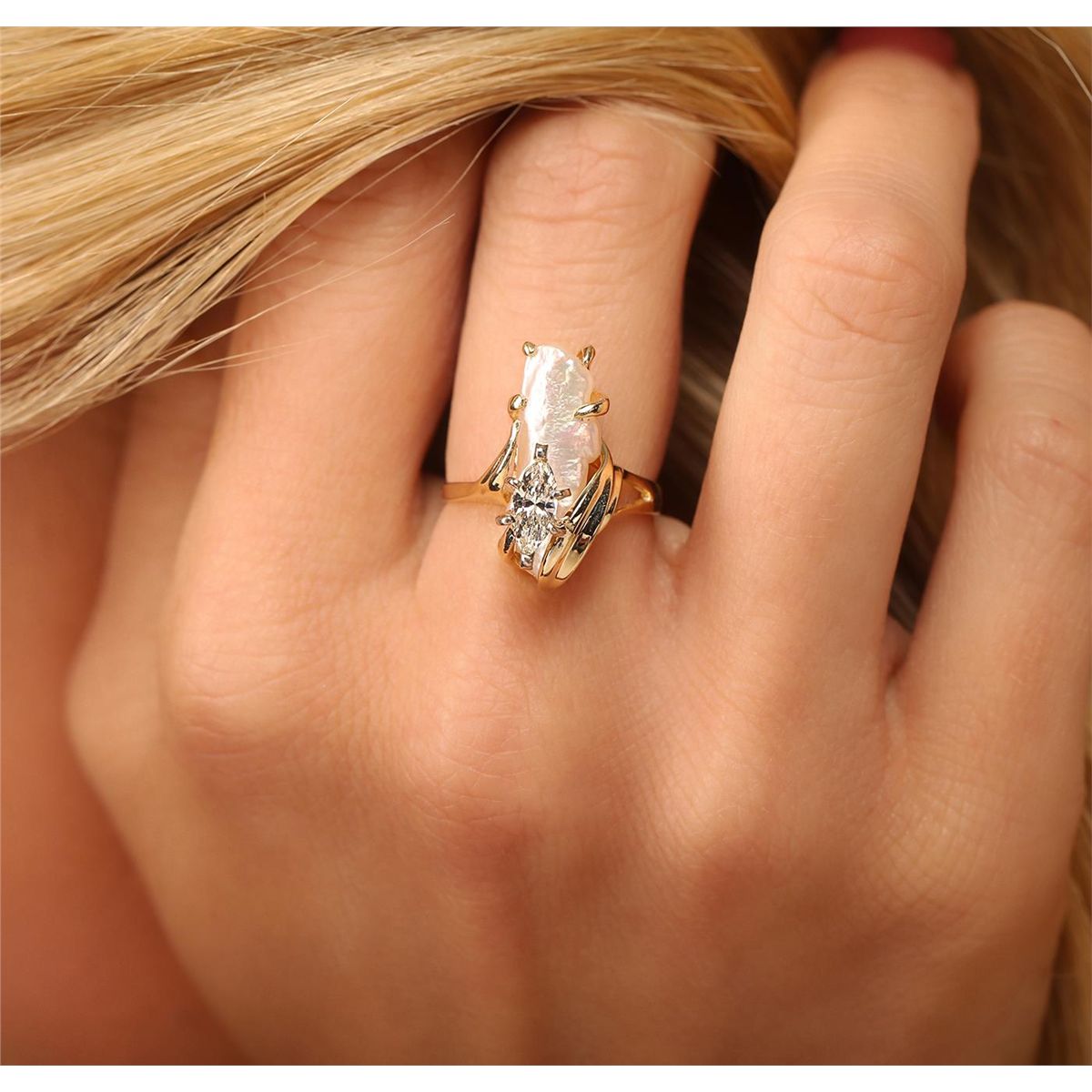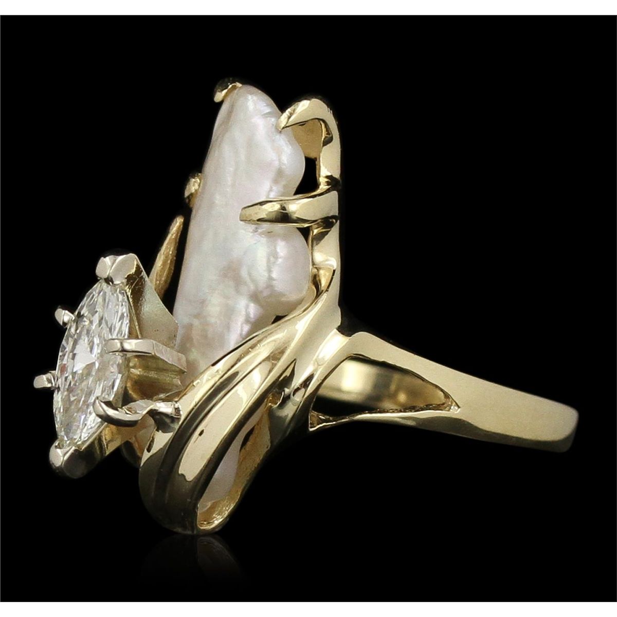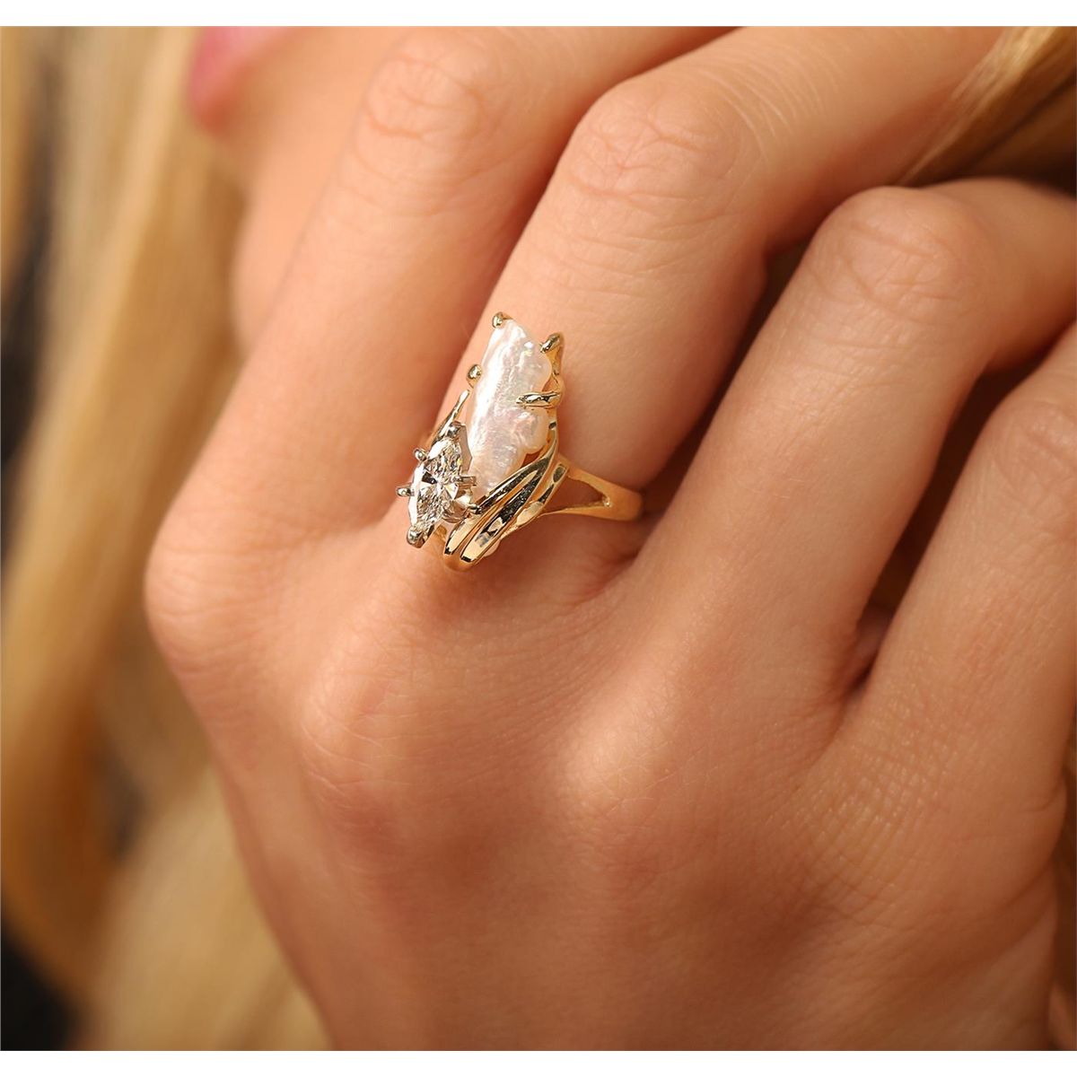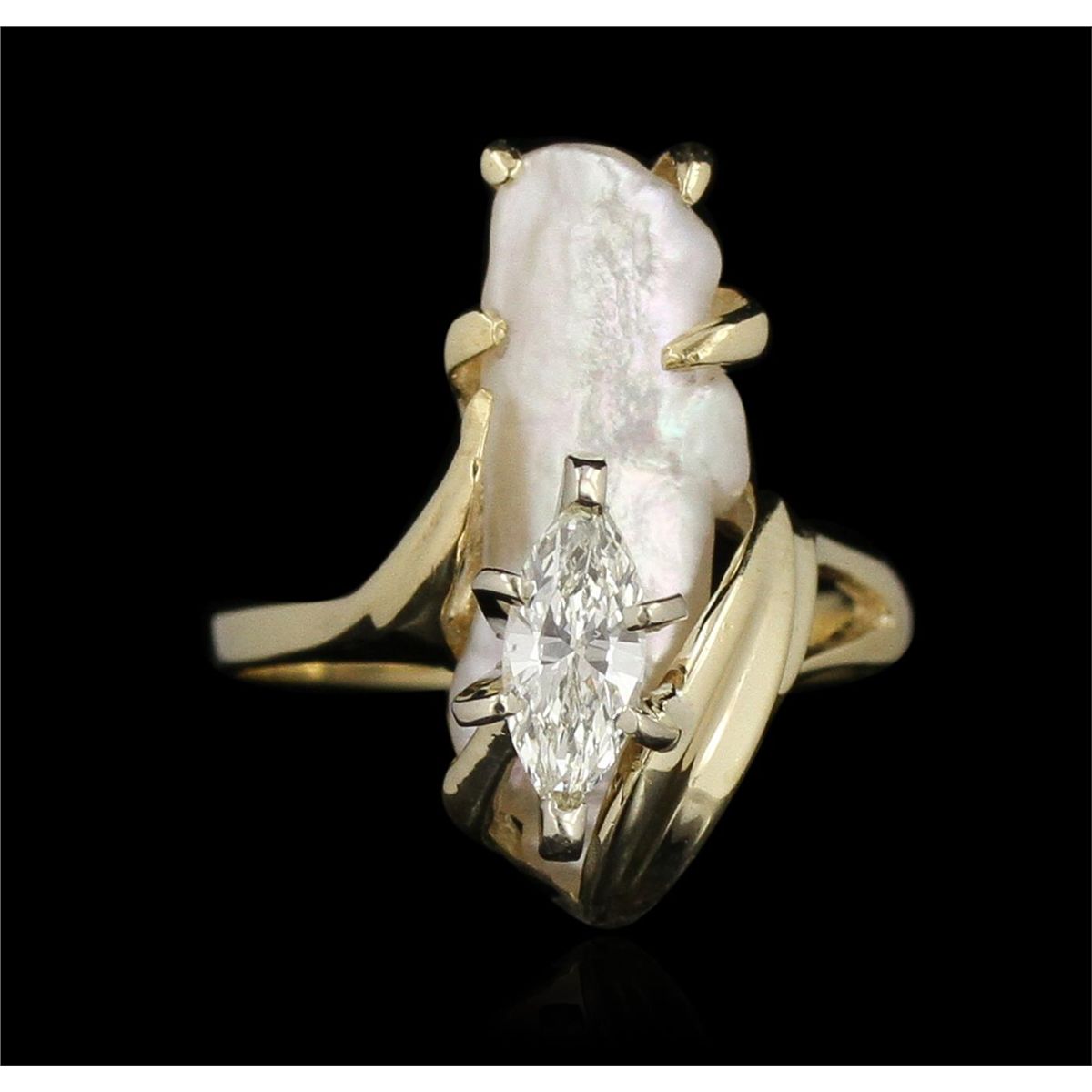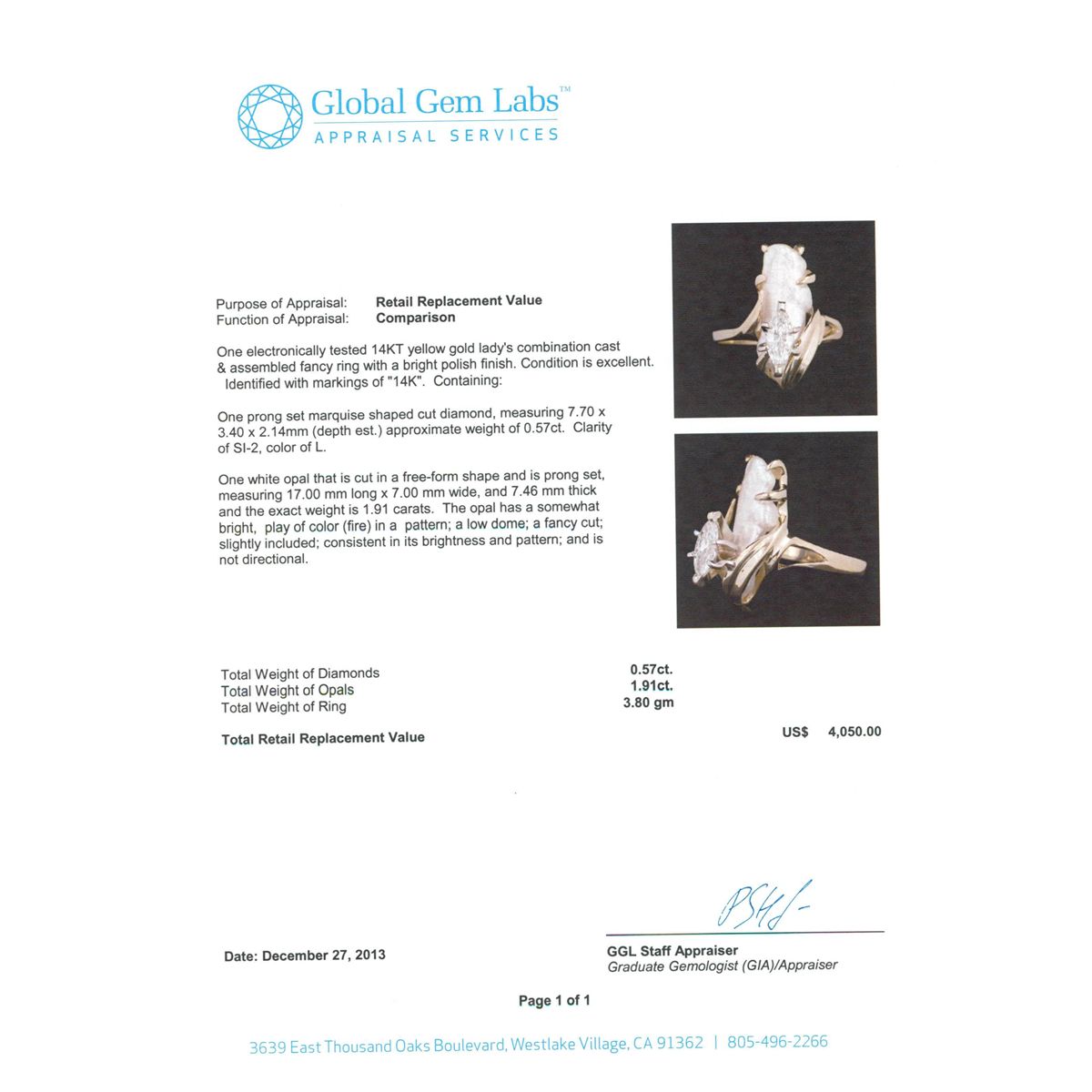 One electronically tested 14KT yellow gold Ladies combination cast & assembled fancy ring with a bright polish finish. Identified with markings of "14K". Condition is excellent. Containing: One prong set marquise shaped cut diamond, measuring 7.70 x 3.40 x 2.14mm (depth est.) approximate weight of 0.57ct. Clarity of SI-2, Color of L. One white opal that is cut in a free-form shape and is prong set, measuring 17.00 mm long x 7.00 mm wide, and 7.46 mm thick and the exact weight is 1.91 carats. The opal has a somewhat bright, play of color (fire) in a pattern; a low dome; a fancy cut; slightly included; consistent in its brightness and pattern; and is not directional. Total Weight of Diamonds 0.57ct. Total Weight of Opals 1.91ct. Total Weight of Ring 3.80gm. GGL Appraised at $4,050.00.