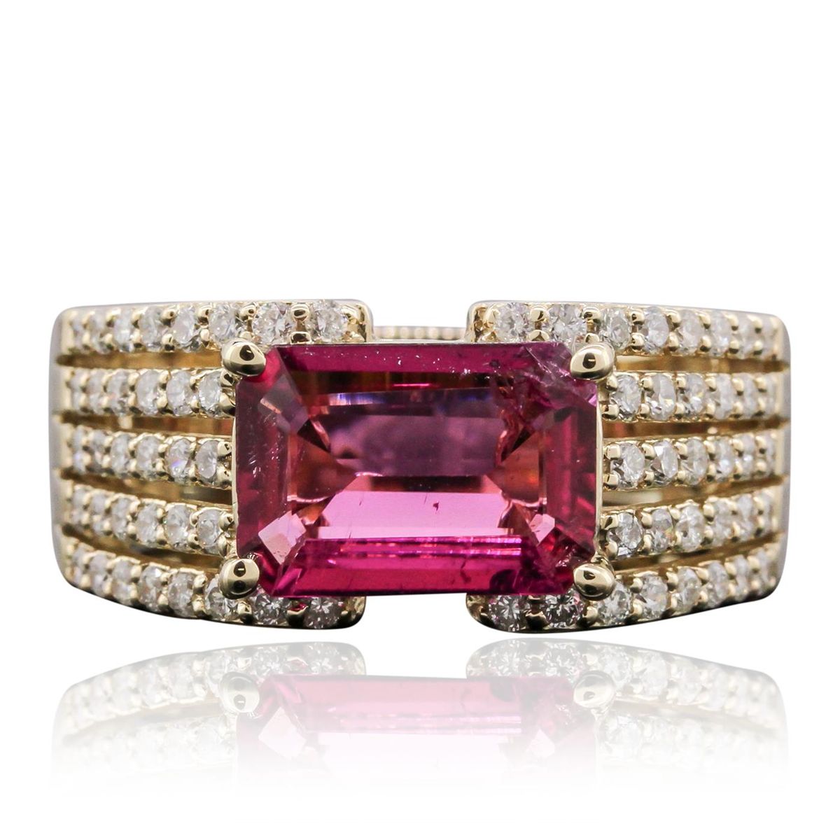 One electronically tested 14KT yellow gold Ladies combination cast & assembled ring with a high polish finish. Condition is new. Identified with markings of "14K". Containing: One prong set rectangular modified mixed cut natural rubellite, measuring 10.00 x 7.00 x 3.00mm, approximate weight of 1.91ct., clarity is eye clean, type III, medium light, moderately strong, reddish purple color, (GIA rP 4/4), cut is good. Colored gemstones are presumed to have been subjected to commonly used color/clarity enhancement processes. Sixty-Eight bead set round brilliant cut diamonds, measuring 1.30 - 1.30 x 0.78mm (depth est.) approximate. Total Weight of 68 Stones = 0.73ct. Clarity: I-1 to I-2. Color: H - I, Cut is Good. Total Weight of Colored Stones 1.91ct. Total Weight of Diamonds 0.73ct. Total Weight of Ring 7.80 grams. GGL Appraised at $5,420.00.