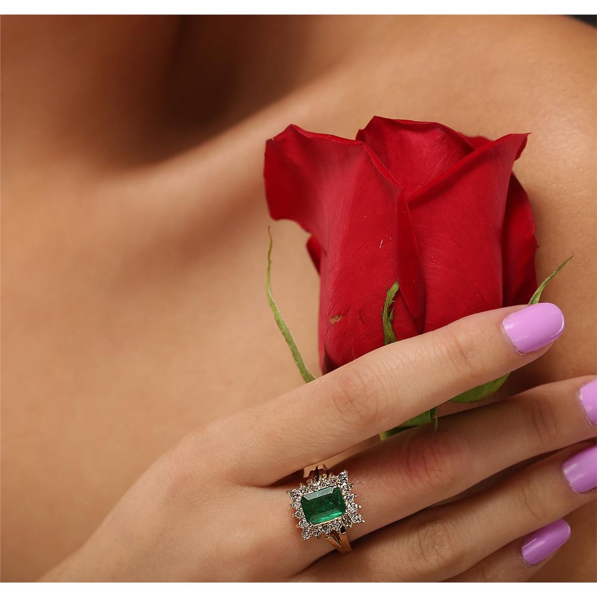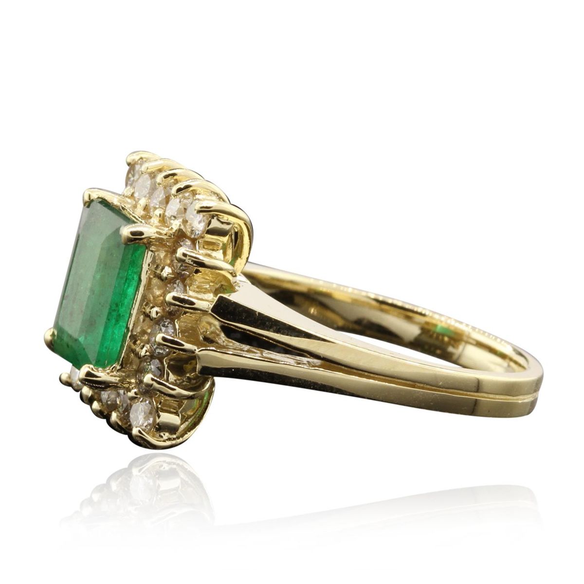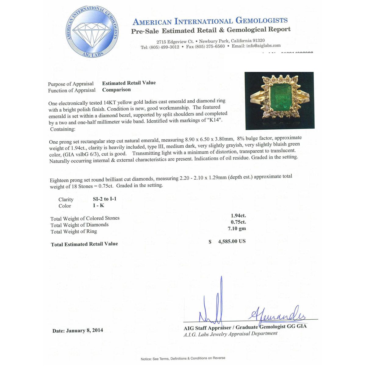 One electronically tested 14KT yellow gold ladies cast emerald and diamond ring with a bright polish finish. The featured emerald is set within a diamond bezel, supported by split shoulders and completed by a two and one-half millimeter wide band. Identified with markings of "K14". Condition is new, good workmanship. Containing: One prong set rectangular step cut natural emerald, measuring 8.90 x 6.50 x 3.80mm, 8%. bulge factor, approximate weight of 1.94ct., clarity is heavily included, type III, medium dark, very slightly grayish, very slightly bluish green color, (GIA vslbG 6/3), cut is good. Transmitting light with a minimum of distortion, transparent to translucent. Naturally occurring internal & external characteristics are present. Indications of oil residue. Graded in the setting. Eighteen prong set round brilliant cut diamonds, measuring 2.20 - 2.10 x 1.29mm (depth est.) approximate. Total Weight of 18 Stones = 0.75ct. Graded in the setting. Clarity: SI-2 to I-1 . Color: I - K. Total Weight of Colored Stones 1.94ct. Total Weight of Diamonds 0.75ct. AIG Appraised at $4,585.00.