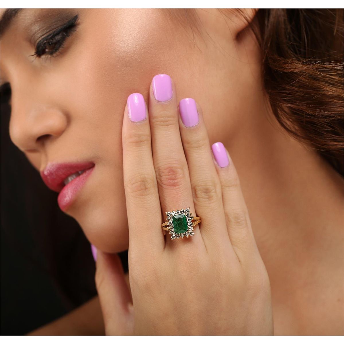 One electronically tested 14KT yellow gold ladies cast emerald and diamond ring with a bright polish finish. The featured emerald is set within a diamond bezel, supported by split shoulders and completed by a two and one-half millimeter wide band. Identified with markings of "K14". Condition is new, good workmanship. Containing: One prong set rectangular step cut natural emerald, measuring 8.90 x 6.50 x 3.80mm, 8%. bulge factor, approximate weight of 1.94ct., clarity is heavily included, type III, medium dark, very slightly grayish, very slightly bluish green color, (GIA vslbG 6/3), cut is good. Transmitting light with a minimum of distortion, transparent to translucent. Naturally occurring internal & external characteristics are present. Indications of oil residue. Graded in the setting. Eighteen prong set round brilliant cut diamonds, measuring 2.20 - 2.10 x 1.29mm (depth est.) approximate. Total Weight of 18 Stones = 0.75ct. Graded in the setting. Clarity: SI-2 to I-1 . Color: I - K. Total Weight of Colored Stones 1.94ct. Total Weight of Diamonds 0.75ct. AIG Appraised at $4,585.00.