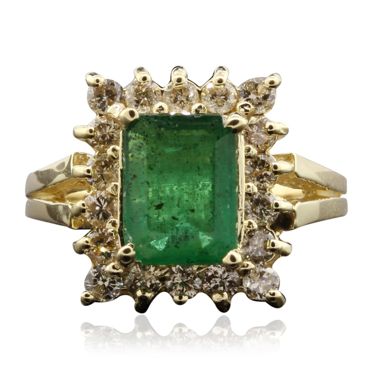 One electronically tested 14KT yellow gold ladies cast emerald and diamond ring with a bright polish finish. The featured emerald is set within a diamond bezel, supported by split shoulders and completed by a two and one-half millimeter wide band. Identified with markings of "K14". Condition is new, good workmanship. Containing: One prong set rectangular step cut natural emerald, measuring 8.90 x 6.50 x 3.80mm, 8%. bulge factor, approximate weight of 1.94ct., clarity is heavily included, type III, medium dark, very slightly grayish, very slightly bluish green color, (GIA vslbG 6/3), cut is good. Transmitting light with a minimum of distortion, transparent to translucent. Naturally occurring internal & external characteristics are present. Indications of oil residue. Graded in the setting. Eighteen prong set round brilliant cut diamonds, measuring 2.20 - 2.10 x 1.29mm (depth est.) approximate. Total Weight of 18 Stones = 0.75ct. Graded in the setting. Clarity: SI-2 to I-1 . Color: I - K. Total Weight of Colored Stones 1.94ct. Total Weight of Diamonds 0.75ct. AIG Appraised at $4,585.00.
