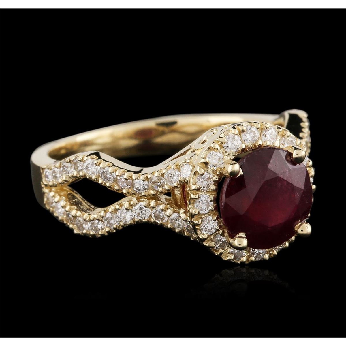 One electronically tested 14KT yellow gold ladies cast ruby and diamond ring with a bright polish finish. Identified with markings of "14K". Condition is new. Containing: One prong set round modified brilliant cut natural ruby, measuring 7.20 - 7.20 x 4.68 mm, approximate weight of 1.94ct., clarity is heavily included, type II, medium dark, very slightly brownish, strongly purplish red color, (GIA stpR 6/3), cut is good. Sixty-Six prong set round brilliant cut diamonds, measuring 1.30 - 1.30 x 0.78mm (depth est.) approximate total weight of 66 Stones = 0.53ct. Clarity: SI-2 to I-1. Color: I - J, Cut is Good. Colored gemstones are presumed to have been subjected to commonly used enhancement processes. All diamonds and colored gemstones are graded in the mounting, unless otherwise stated. Total Weight of Colored Stones 1.94ct. Total Weight of Diamonds 0.53ct. Total Weight of Ring 4.60 grams. GGL Appraised at $3,030.00.
