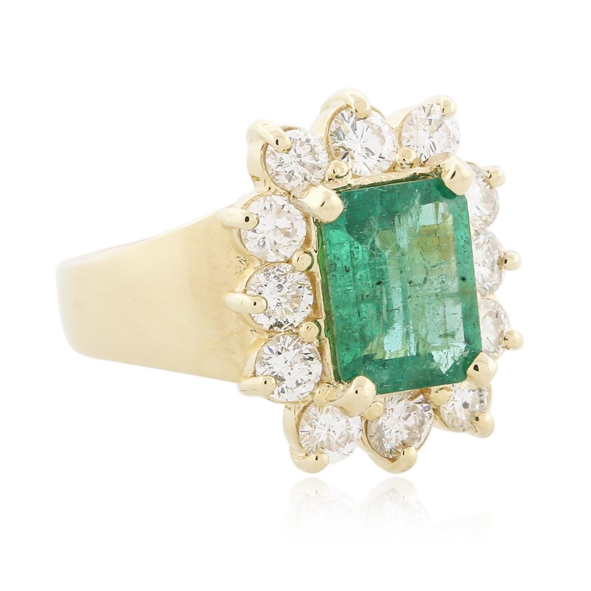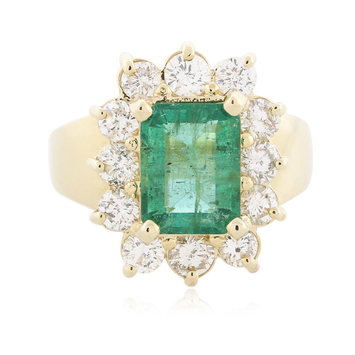 Great Condition! One electronically tested 14KT yellow gold Ladies combination cast & assembled fashion ring with a bright polish finish. Condition is new. Identified with markings of "14K". Containing: One prong set emerald standard step cut natural emerald, measuring 9.10 x 7.00 x 3.80mm, approximate weight of 1.95ct., clarity is moderately included, type III, medium, very slightly grayish, very slightly bluish green color, (GIA vslbG 5/3), cut is good. Colored gemstones are presumed to have been subjected to commonly used and possible undetectable color/clarity enhancement processes. Twelve prong set round brilliant cut diamonds, measuring 3.00 - 3.00 x 1.80mm (depth est.) approximate total weight of 12 Stones = 1.19ct. Clarity of SI-2 to I-1, Color of I - J, Cut is Good. Total Weight of Colored Stones 1.95ct. Total Weight of Diamonds 1.19ct. Total Weight of Ring 7.80 grams. GGL Appraised at $9,160.00.