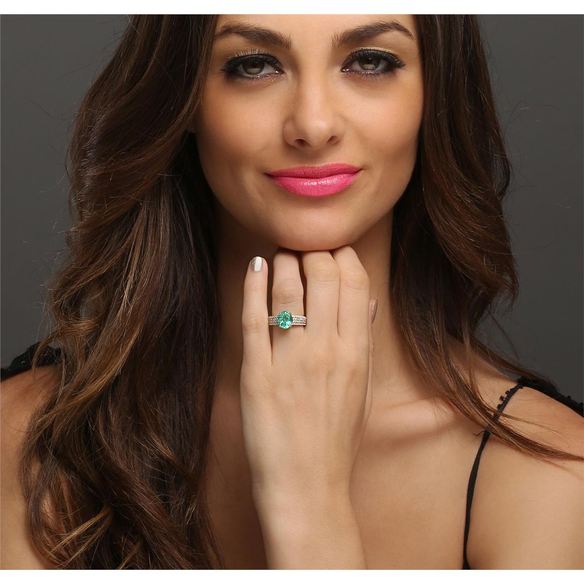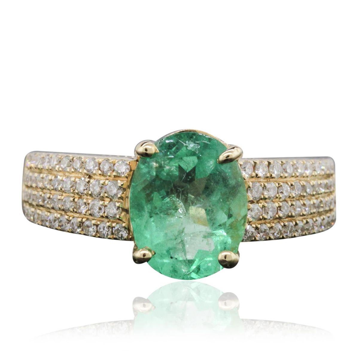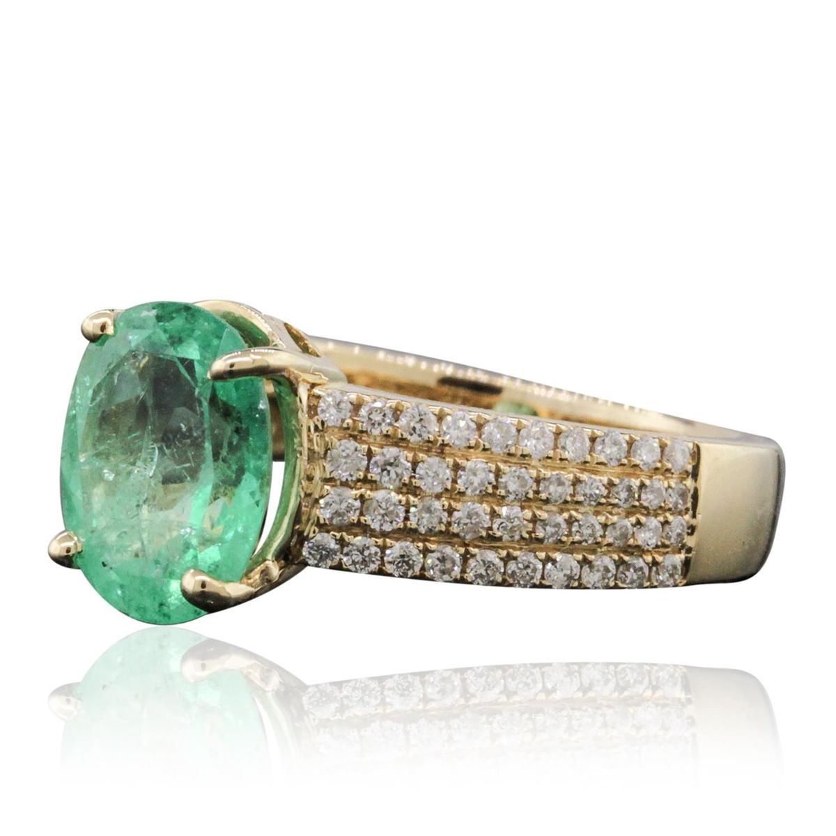 One electronically tested 14KT yellow gold ladies combination cast & assembled emerald and diamond ring with a flat shank with a bright polish finish. Identified with markings of "14K". Condition is new. Containing: One prong set oval modified brilliant cut natural emerald, measuring 9.58 x 7.66 x 4.87mm, approximate weight of 1.97ct., clarity is moderately included, type III, medium light, moderately strong, very slightly bluish green color, (GIA vslbG 4/4), cut is good. Seventy-Two prong set round brilliant cut diamonds, measuring 1.10 - 1.10 x 0.66mm (depth est.) approximate total weight of 72 Stones = 0.35ct. Clarity: I-1 to I-2. Color: I - J, Cut is Good. Colored gemstones are presumed to have been subjected to commonly used enhancement processes. All diamonds and colored gemstones are graded in the mounting, unless otherwise stated total weight of Colored Stones 1.97ct. Total Weight of Diamonds 0.35ct. Total Weight of Ring 5.30 grams. GGL Appraised at $6,710.00.