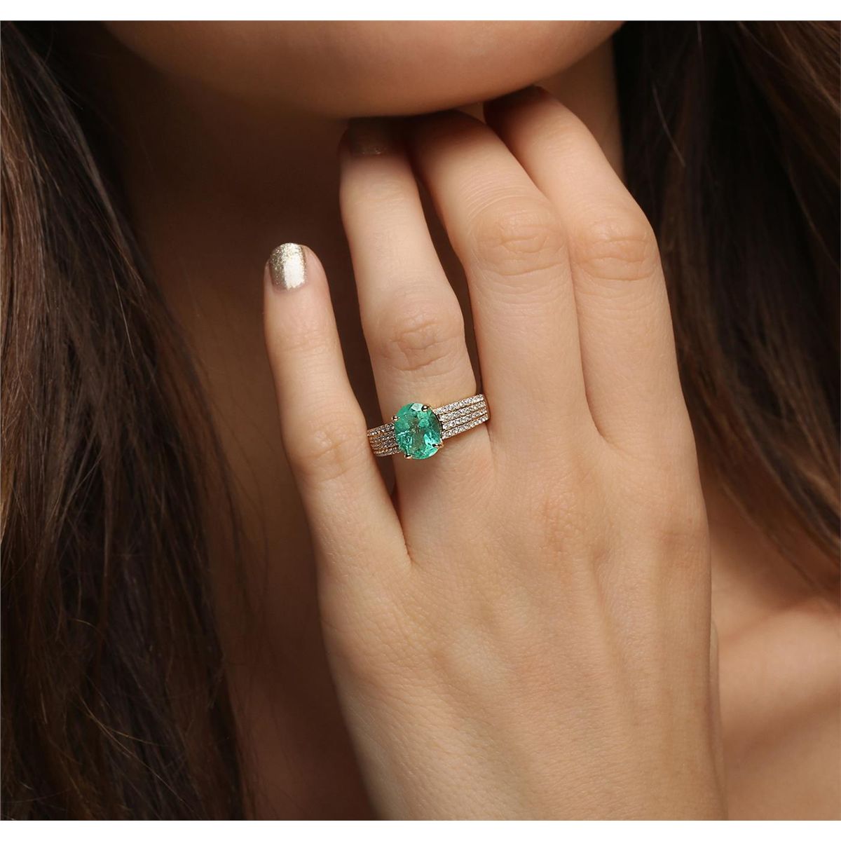 One electronically tested 14KT yellow gold ladies combination cast & assembled emerald and diamond ring with a flat shank with a bright polish finish. Identified with markings of "14K". Condition is new. Containing: One prong set oval modified brilliant cut natural emerald, measuring 9.58 x 7.66 x 4.87mm, approximate weight of 1.97ct., clarity is moderately included, type III, medium light, moderately strong, very slightly bluish green color, (GIA vslbG 4/4), cut is good. Seventy-Two prong set round brilliant cut diamonds, measuring 1.10 - 1.10 x 0.66mm (depth est.) approximate total weight of 72 Stones = 0.35ct. Clarity: I-1 to I-2. Color: I - J, Cut is Good. Colored gemstones are presumed to have been subjected to commonly used enhancement processes. All diamonds and colored gemstones are graded in the mounting, unless otherwise stated total weight of Colored Stones 1.97ct. Total Weight of Diamonds 0.35ct. Total Weight of Ring 5.30 grams. GGL Appraised at $6,710.00.