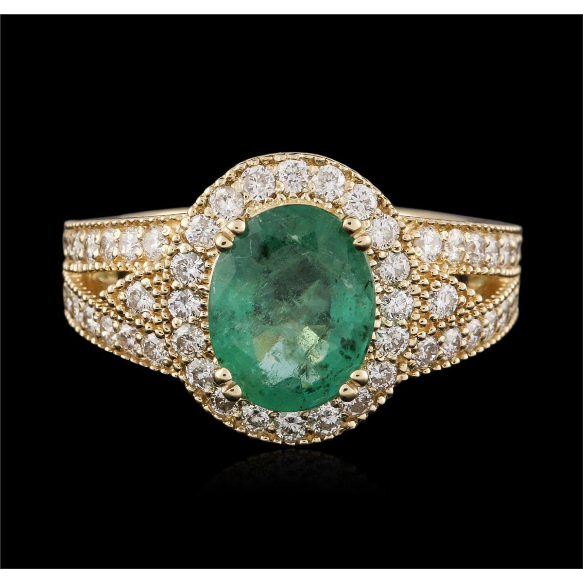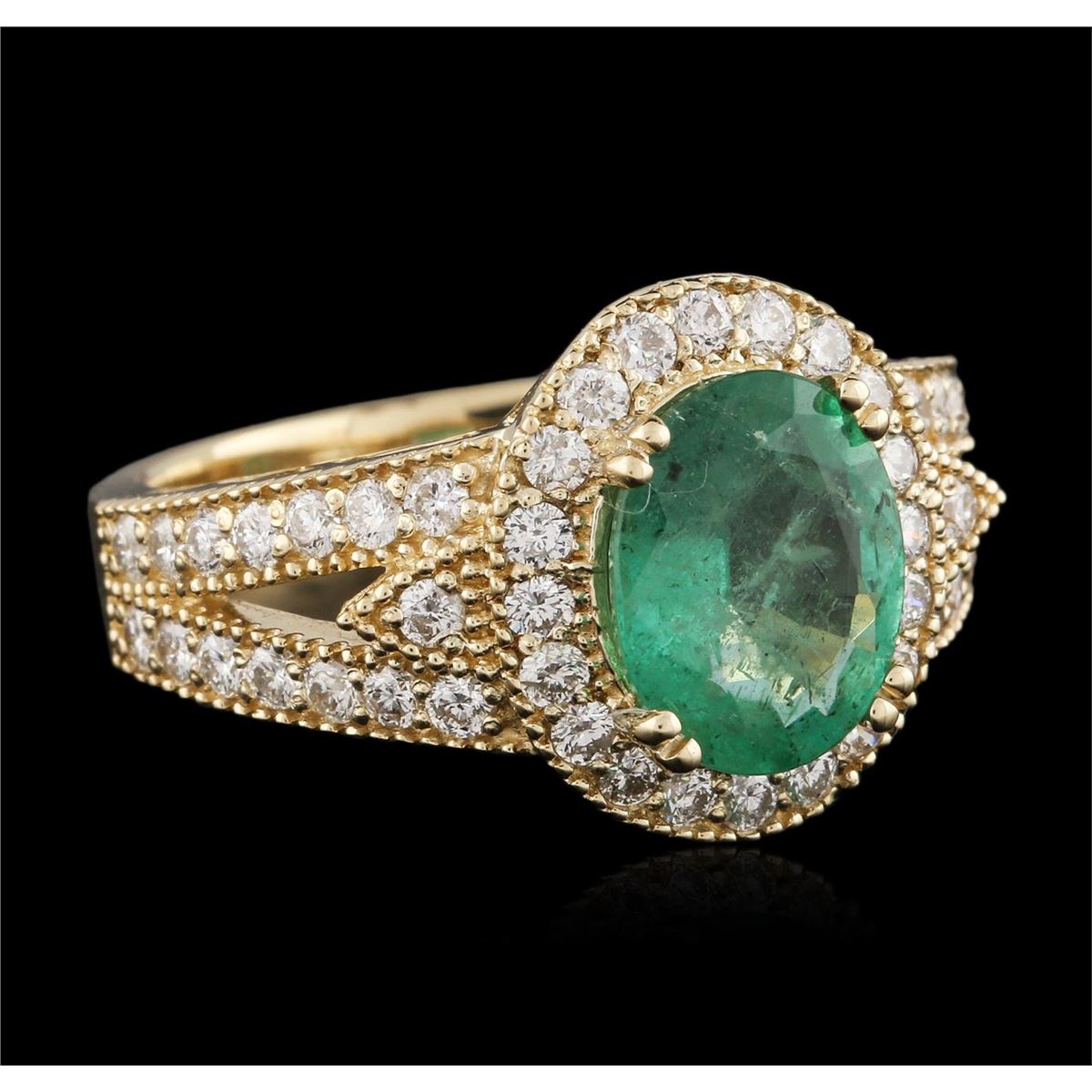 One electronically tested 14KT yellow gold ladies cast emerald and diamond ring with a bright polish finish. Identified with markings of "14K". Condition is new. Containing: One prong set oval modified brilliant cut natural emerald, measuring 10.10 x 8.00 x 4.30mm, approximate weight of 1.98ct., clarity is slightly included, type III, medium light, very slightly grayish, green color, (GIA G 4/3), cut is good. Fifty-Two prong set round brilliant cut diamonds, measuring 1.50 - 1.50 x 0.90mm (depth est.) approximate total weight of 52 Stones = 0.64ct. Clarity: SI-2 to I-1. Color: J - K, Cut is Good. Colored gemstones are presumed to have been subjected to commonly used enhancement processes. All diamonds and colored gemstones are graded in the mounting, unless otherwise stated. Total Weight of Colored Stones 1.98ct. Total Weight of Diamonds 0.64ct. Total Weight of Ring 7.00 grams. GGL Appraised at $4,185.00.