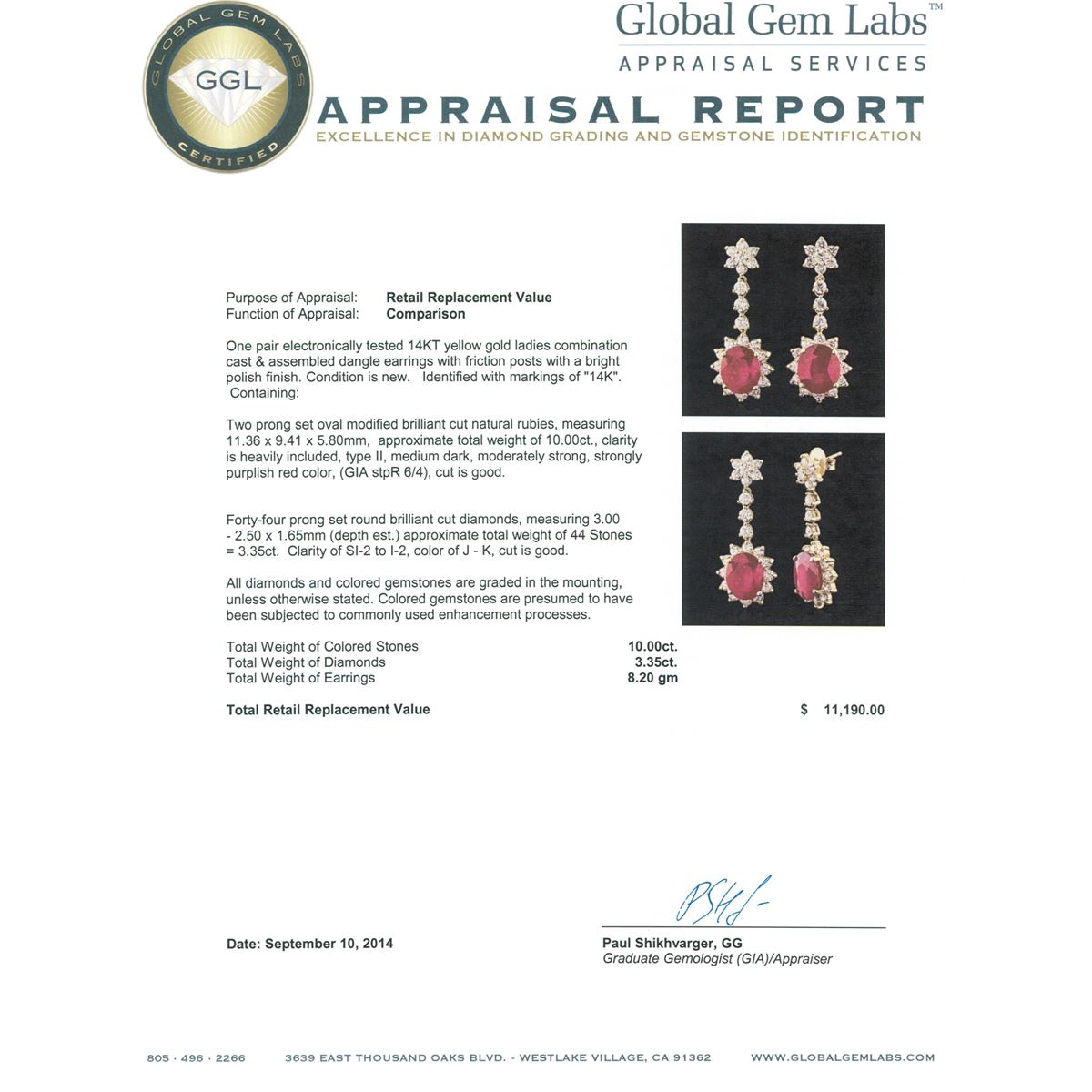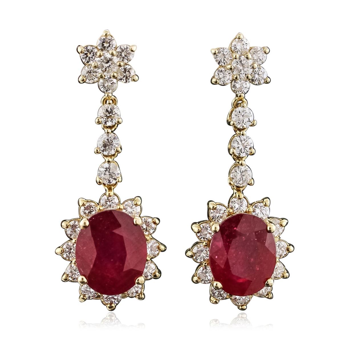 One pair electronically tested 14KT yellow gold ladies combination cast & assembled dangle earrings with friction posts with a bright polish finish.  Identified with markings of "14K". Condition is new. Containing: Two prong set oval modified brilliant cut natural rubies, measuring 11.36 x 9.41 x 5.80mm, approximate total weight of 10.00ct., clarity is heavily included, type II, medium dark, moderately strong, strongly purplish red color, (GIA stpR 6/4), cut is good. Forty-Four prong set round brilliant cut diamonds, measuring 3.00 - 2.50 x 1.65mm (depth est.) approximate total weight of 44 Stones = 3.35ct. Clarity: SI-2 to I-2. Color: J - K, Cut is Good. All diamonds and colored gemstones are graded in the mounting, unless otherwise stated. Colored gemstones are presumed to have been subjected to commonly used enhancement processes.. Total Weight of Colored Stones 10.00ct. Total Weight of Diamonds 3.35ct. Total Weight of Earrings 8.20 grams. GGL Appraised at $11,190.00.