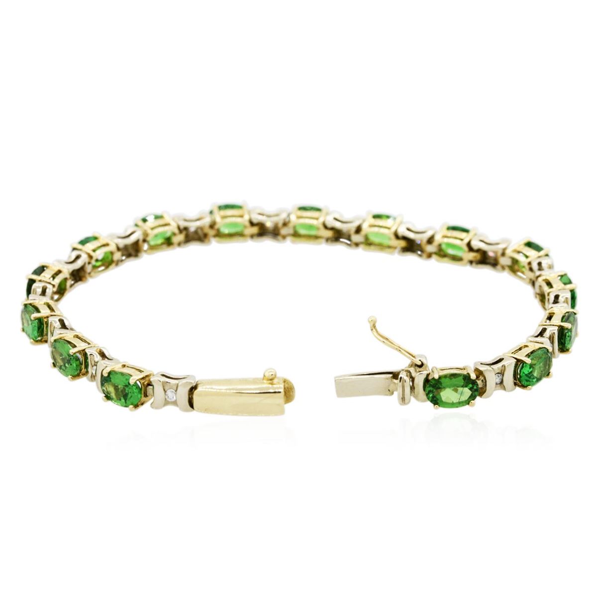 One electronically tested 14KT yellow gold ladies cast & assembled tsavorite garnet and diamond bracelet. Seven and one-half inch length bracelet features a flexible tsavorite garnet and diamond bracelet, terminating in a concealed clasp with safety. Bright polish finish. Identified with markings of "14K". Condition is new, good workmanship. Containing: Fifteen prong set oval mixed cut natural tsavorite garnets, measuring 6.60 x 4.70 x 2.75mm, 6% bulge factor, approximate total weight of 10.05ct., clarity is slightly included, type II, medium dark, moderately strong, slightly yellowish green color, (GIA slyG 6/4), cut is good. Transmitting light with a minimum of distortion, transparent. Naturally occurring internal & external characteristics are present. Measurements & the color grade are an average for the group. Refractive index testing results of 1.74. This is a conclusive result for grossularite garnet(tsavorite). Graded in the setting. Fifteen channel set round brilliant cut diamonds, measuring 1.70 - 1.60 x 0.99mm (depth est.) approximate total weight of 15 Stones = 0.34ct. Graded in the setting. Clarity: SI-2 to I-1. Color: F - H. Total Weight of Colored Stones 10.05ct. Total Weight of Diamonds 0.34ct. Total Weight of Bracelet 16.05 grams. AIG Appraised at $17,210.00.