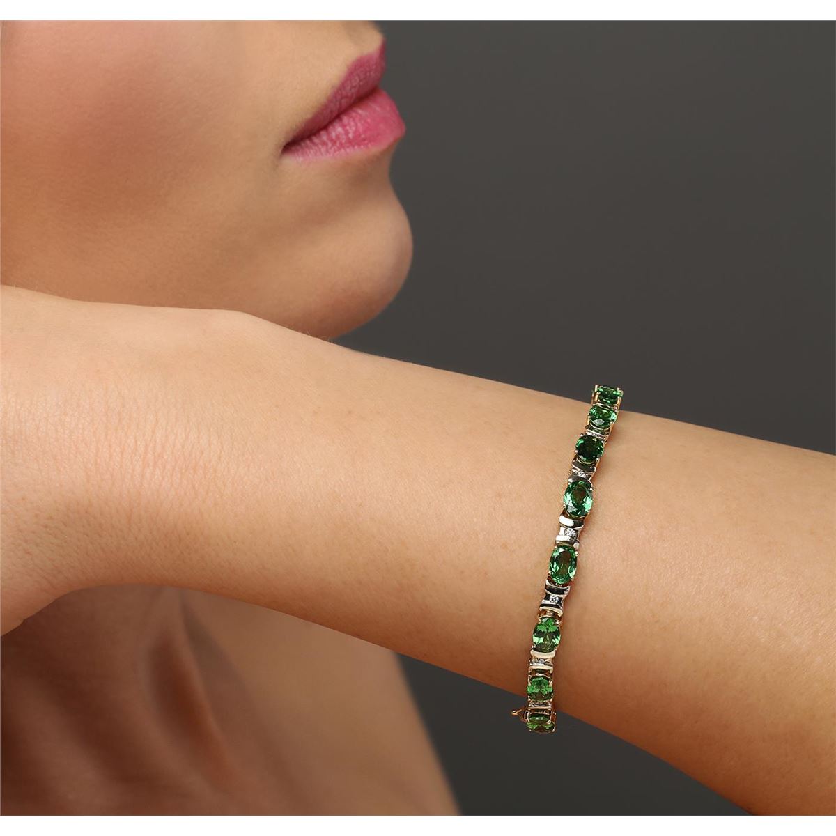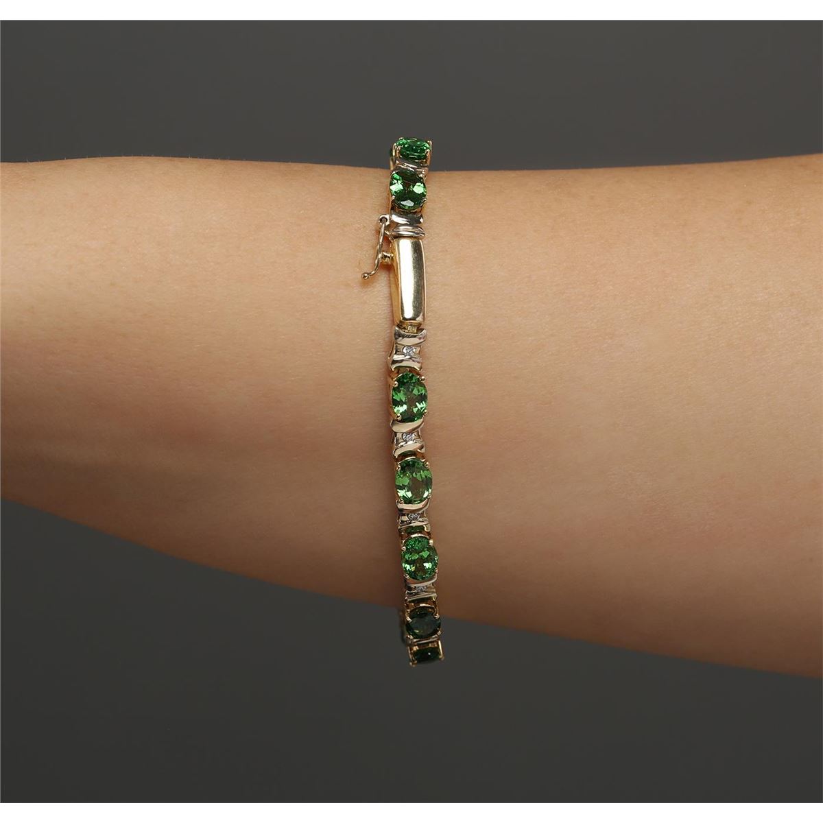 One electronically tested 14KT yellow gold ladies cast & assembled tsavorite garnet and diamond bracelet. Seven and one-half inch length bracelet features a flexible tsavorite garnet and diamond bracelet, terminating in a concealed clasp with safety. Bright polish finish. Identified with markings of "14K". Condition is new, good workmanship. Containing: Fifteen prong set oval mixed cut natural tsavorite garnets, measuring 6.60 x 4.70 x 2.75mm, 6% bulge factor, approximate total weight of 10.05ct., clarity is slightly included, type II, medium dark, moderately strong, slightly yellowish green color, (GIA slyG 6/4), cut is good. Transmitting light with a minimum of distortion, transparent. Naturally occurring internal & external characteristics are present. Measurements & the color grade are an average for the group. Refractive index testing results of 1.74. This is a conclusive result for grossularite garnet(tsavorite). Graded in the setting. Fifteen channel set round brilliant cut diamonds, measuring 1.70 - 1.60 x 0.99mm (depth est.) approximate total weight of 15 Stones = 0.34ct. Graded in the setting. Clarity: SI-2 to I-1. Color: F - H. Total Weight of Colored Stones 10.05ct. Total Weight of Diamonds 0.34ct. Total Weight of Bracelet 16.05 grams. AIG Appraised at $17,210.00.