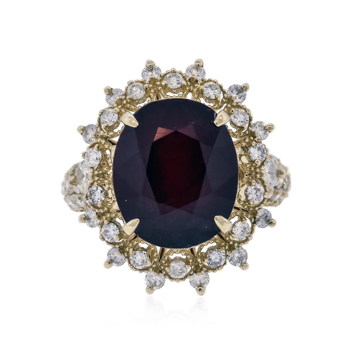 One electronically tested 14KT yellow gold ladies combination cast & assembled ring with a bright polish finish. Condition is new. Identified with markings of "K14". Containing: One prong set oval modified brilliant cut natural ruby, measuring 13.76 x 11.50 x 7.94mm, approximate weight of 10.13ct., clarity is heavily included, type II, medium dark, moderately strong, strongly purplish red color, (GIA stpR 6/4), cut is good. Two prong set round brilliant cut diamonds, measuring 3.00 - 3.00 x 1.80mm (depth est.) approximate. Total Weight of 2 Stones = 0.20ct. Clarity: I-1. Color: K - L, Cut is Good. Fifty-Four prong set round brilliant cut diamonds, measuring 1.70 - 1.50 x 0.96mm (depth est.) approximate. Total Weight of 54 Stones = 0.81ct. Clarity: SI-2 to I-1. Color: K - L, Cut is Good. Colored gemstones are presumed to have been subjected to commonly used enhancement processes. All diamonds and colored gemstones are graded in the mounting, unless otherwise stated. Total Weight of Colored Stones 10.13ct. Total Weight of Diamonds 1.00ct. Total Weight of Ring 8.40 grams. GGL Appraised at $8,805.00.