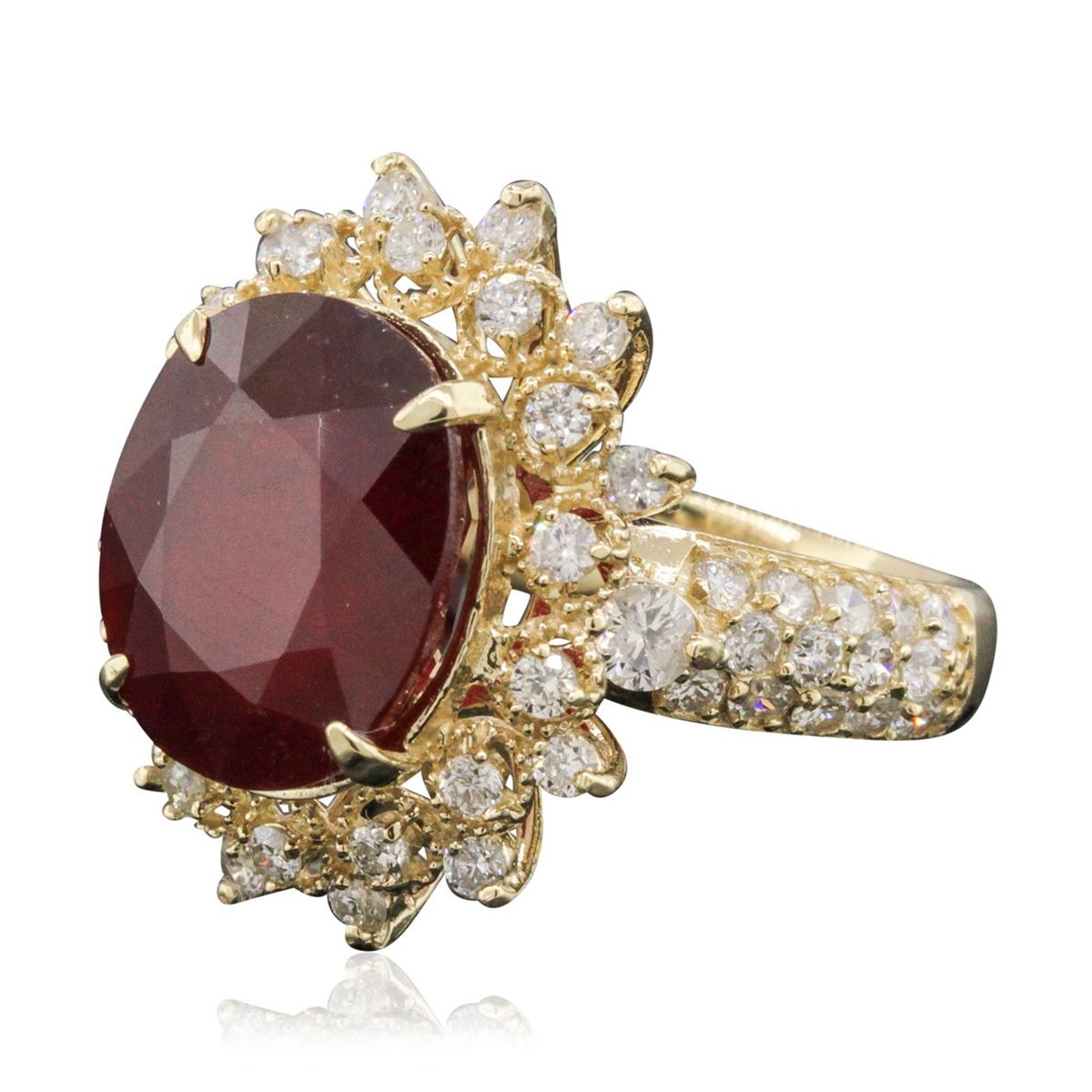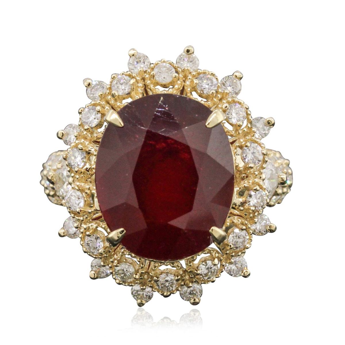 One electronically tested 14KT yellow gold ladies combination cast & assembled ring with a bright polish finish. Condition is new. Identified with markings of "K14". Containing: One prong set oval modified brilliant cut natural ruby, measuring 13.76 x 11.50 x 7.94mm, approximate weight of 10.13ct., clarity is heavily included, type II, medium dark, moderately strong, strongly purplish red color, (GIA stpR 6/4), cut is good. Two prong set round brilliant cut diamonds, measuring 3.00 - 3.00 x 1.80mm (depth est.) approximate. Total Weight of 2 Stones = 0.20ct. Clarity: I-1. Color: K - L, Cut is Good. Fifty-Four prong set round brilliant cut diamonds, measuring 1.70 - 1.50 x 0.96mm (depth est.) approximate. Total Weight of 54 Stones = 0.81ct. Clarity: SI-2 to I-1. Color: K - L, Cut is Good. Colored gemstones are presumed to have been subjected to commonly used enhancement processes. All diamonds and colored gemstones are graded in the mounting, unless otherwise stated. Total Weight of Colored Stones 10.13ct. Total Weight of Diamonds 1.00ct. Total Weight of Ring 8.40 grams. GGL Appraised at $8,805.00.
