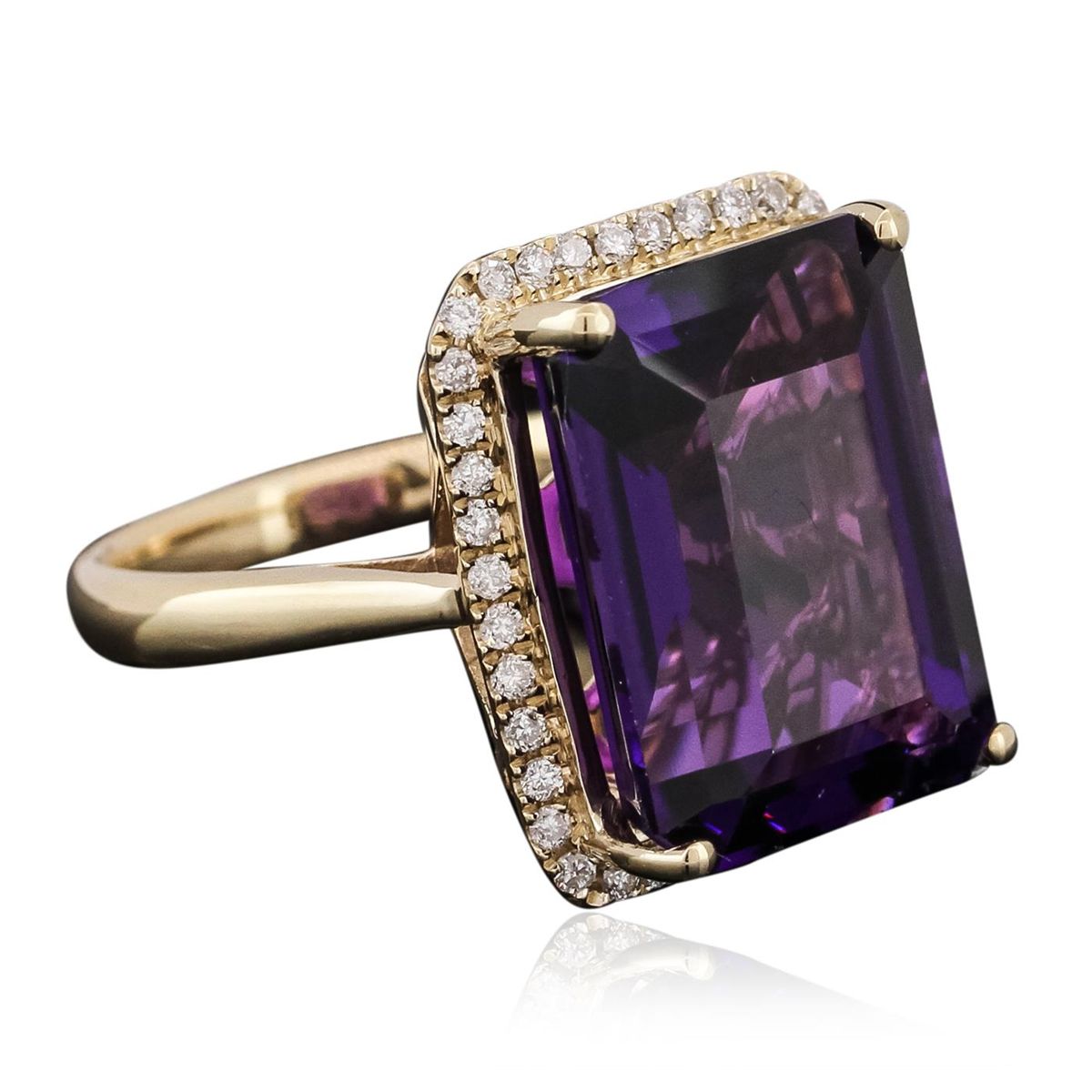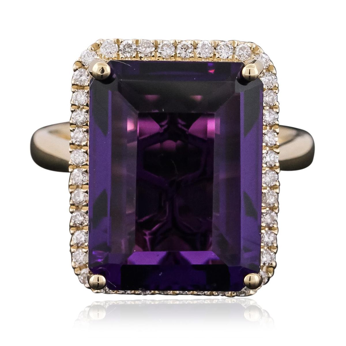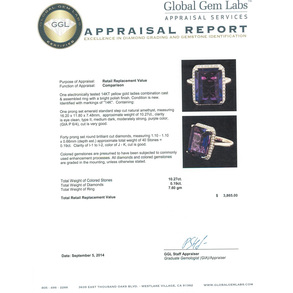 One electronically tested 14KT yellow gold ladies combination cast & assembled ring with a bright polish finish. Identified with markings of "14K". Condition is new. Containing: One prong set emerald standard step cut natural amethyst, measuring 16.20 x 11.80 x 7.48mm, approximate weight of 10.27ct., clarity is eye clean, type II, medium dark, moderately strong, purple color, (GIA P 6/4), cut is very good. Forty prong set round brilliant cut diamonds, measuring 1.10 - 1.10 x 0.66mm (depth est.) approximate total weight of 40 Stones = 0.19ct. Clarity: I-1 to I-2. Color: J - K, Cut is Good. Colored gemstones are presumed to have been subjected to commonly used enhancement processes. All diamonds and colored gemstones are graded in the mounting, unless otherwise stated. Total Weight of Colored Stones 10.27ct. Total Weight of Diamonds 0.19ct. Total Weight of Ring 7.60 grams. GGL Appraised at $3,865.00.