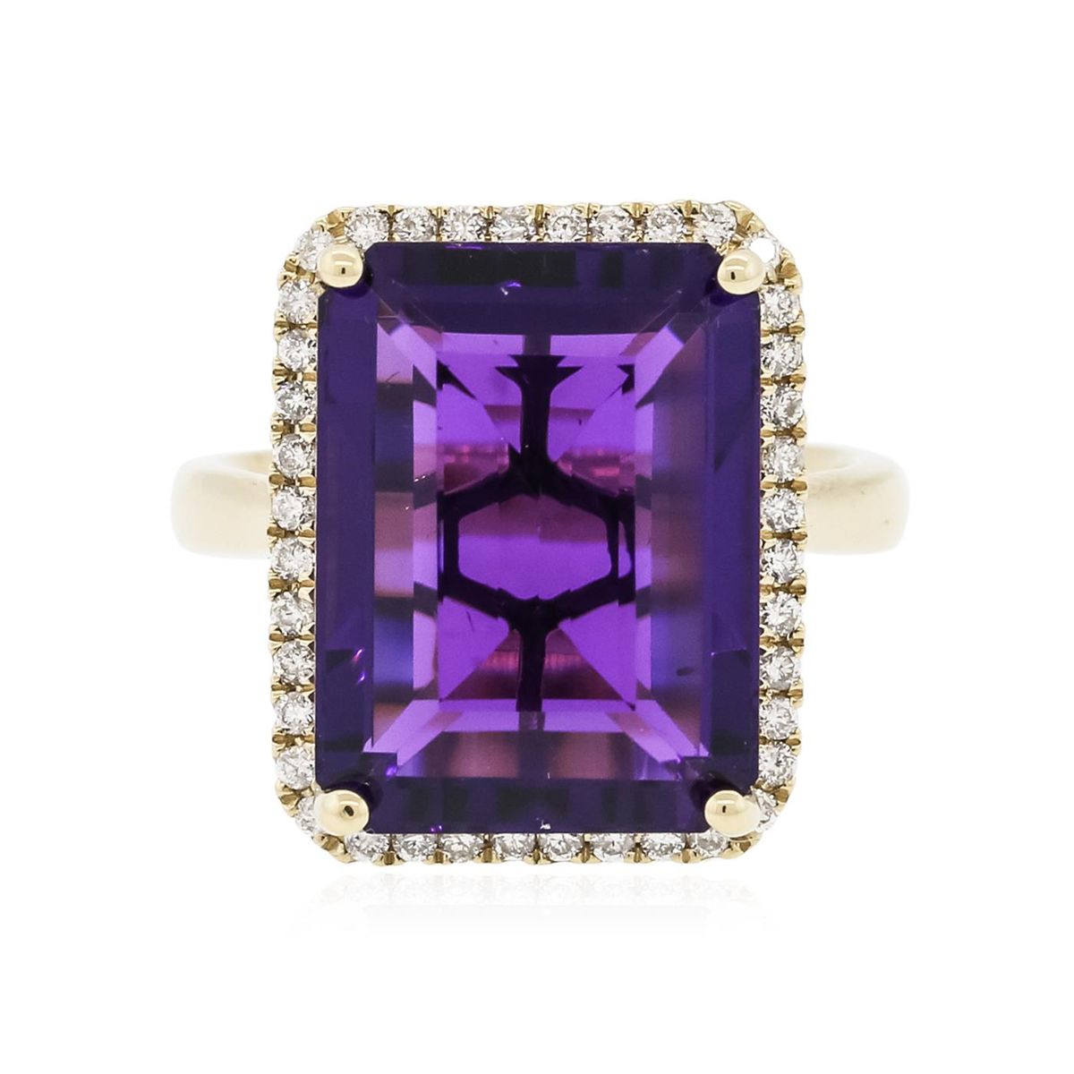 One electronically tested 14KT yellow gold ladies combination cast & assembled ring with a bright polish finish. Identified with markings of "14K". Condition is new. Containing: One prong set emerald standard step cut natural amethyst, measuring 16.20 x 11.80 x 7.48mm, approximate weight of 10.27ct., clarity is eye clean, type II, medium dark, moderately strong, purple color, (GIA P 6/4), cut is very good. Forty prong set round brilliant cut diamonds, measuring 1.10 - 1.10 x 0.66mm (depth est.) approximate total weight of 40 Stones = 0.19ct. Clarity: I-1 to I-2. Color: J - K, Cut is Good. Colored gemstones are presumed to have been subjected to commonly used enhancement processes. All diamonds and colored gemstones are graded in the mounting, unless otherwise stated. Total Weight of Colored Stones 10.27ct. Total Weight of Diamonds 0.19ct. Total Weight of Ring 7.60 grams. GGL Appraised at $3,865.00.