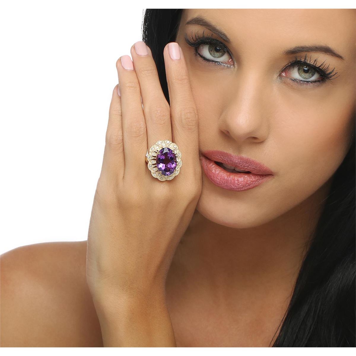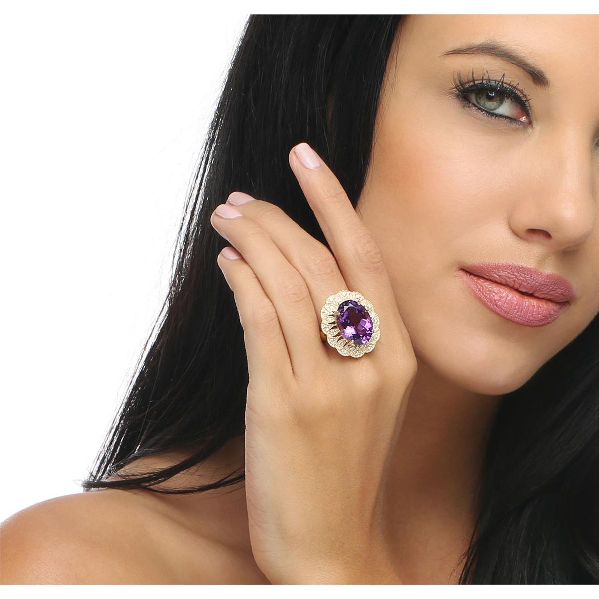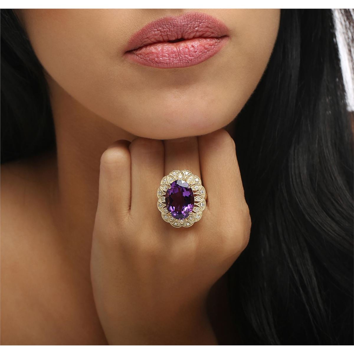 One electronically tested 14KT yellow gold ladies combination cast & assembled ring with a bright polish finish. Condition is new. Identified with markings of "K14". Containing: One prong set oval modified brilliant cut natural amethyst, measuring 17.65 x 13.00 x 8.37mm, approximate weight of 10.46ct., clarity is eye clean, type II, medium light, moderately strong, purple color, (GIA P 4/4), cut is good. Twenty-Four prong set round brilliant cut diamonds, measuring 1.80 - 1.50 x 0.99mm (depth est.) approximate. Total Weight of 24 Stones = 0.39ct. Clarity: SI-1 to SI-2. Color: I - J, Cut is Good. Colored gemstones are presumed to have been subjected to commonly used enhancement processes. All diamonds and colored gemstones are graded in the mounting, unless otherwise stated. Total Weight of Colored Stones 10.46ct. Total Weight of Diamonds 0.39ct. Total Weight of Ring 12.70 grams. GGL Appraised at $7,485.00.