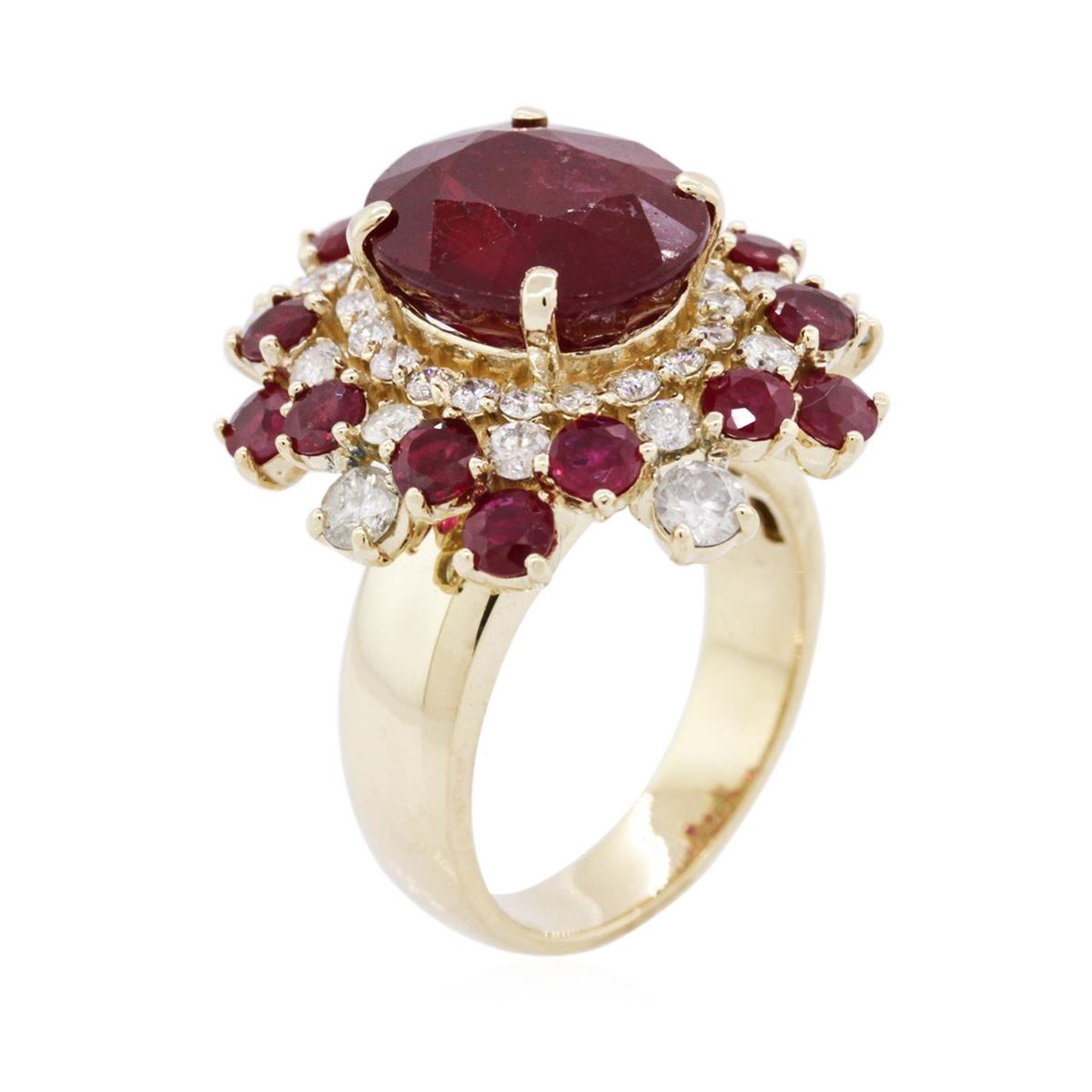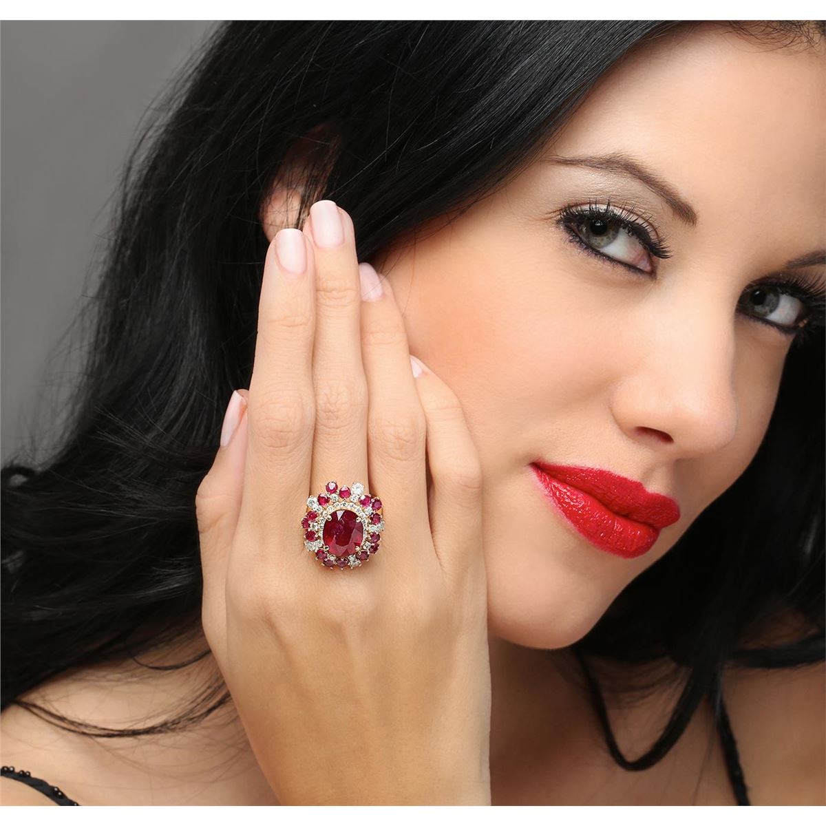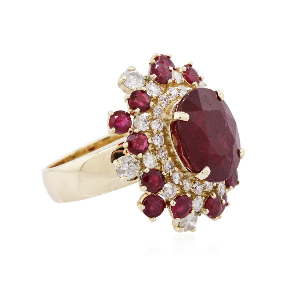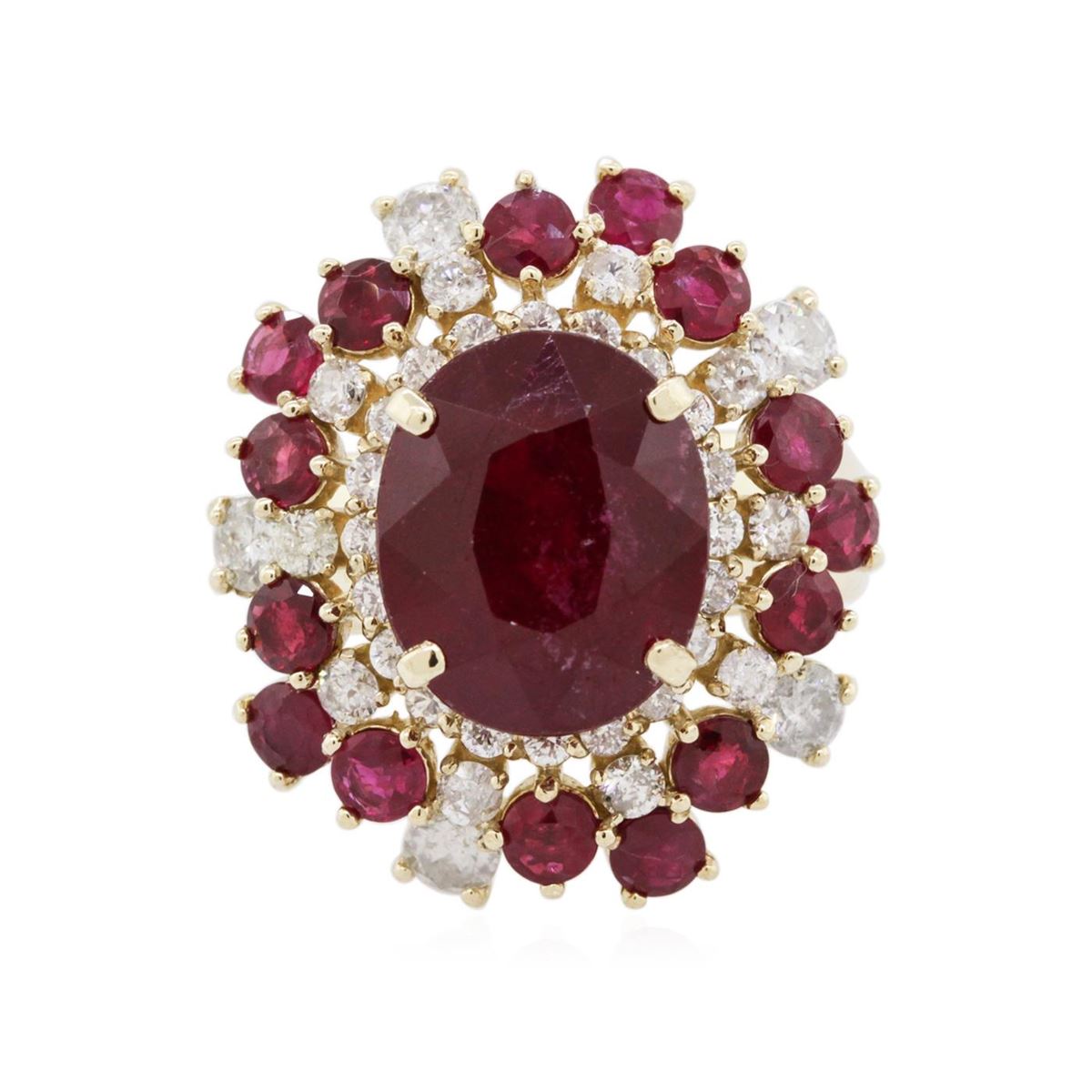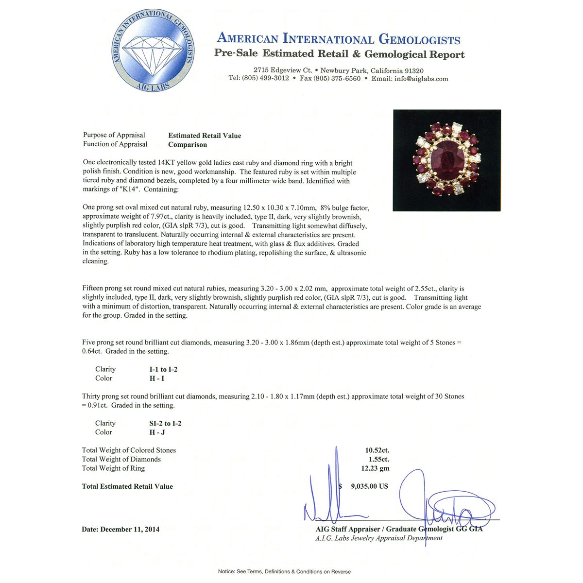 One electronically tested 14KT yellow gold ladies cast ruby and diamond ring with a bright polish finish. The featured ruby is set within multiple tiered ruby and diamond bezels, completed by a four millimeter wide band. Identified with markings of "K14". Condition is new, good workmanship. Containing: One prong set oval mixed cut natural ruby, measuring 12.50 x 10.30 x 7.10mm, 8% bulge factor, approximate weight of 7.97ct., clarity is heavily included, type II, dark, very slightly brownish, slightly purplish red color, (GIA slpR 7/3), cut is good. Transmitting light somewhat diffusely, transparent to translucent. Naturally occurring internal & external characteristics are present. Indications of laboratory high temperature heat treatment, with glass & flux additives. Graded in the setting. Ruby has a low tolerance to rhodium plating, repolishing the surface, & ultrasonic cleaning. Fifteen prong set round mixed cut natural rubies, measuring 3.20 - 3.00 x 2.02 mm, approximate total weight of 2.55ct., clarity is slightly included, type II, dark, very slightly brownish, slightly purplish red color, (GIA slpR 7/3), cut is good. Transmitting light with a minimum of distortion, transparent. Naturally occurring internal & external characteristics are present. Color grade is an average for the group. Graded in the setting. Five prong set round brilliant cut diamonds, measuring 3.20 - 3.00 x 1.86mm (depth est.) approximate total weight of 5 Stones = 0.64ct. Graded in the setting. Clarity: I-1 to I-2. Color: H - I Thirty prong set round brilliant cut diamonds, measuring 2.10 - 1.80 x 1.17mm (depth est.) approximate total weight of 30 Stones = 0.91ct. Graded in the setting. Clarity: SI-2 to I-2. Color: H - J. Total Weight of Colored Stones 10.52ct. Total Weight of Diamonds 1.55ct. Total Weight of Ring 12.23 grams. AIG Appraised at $9,035.00.