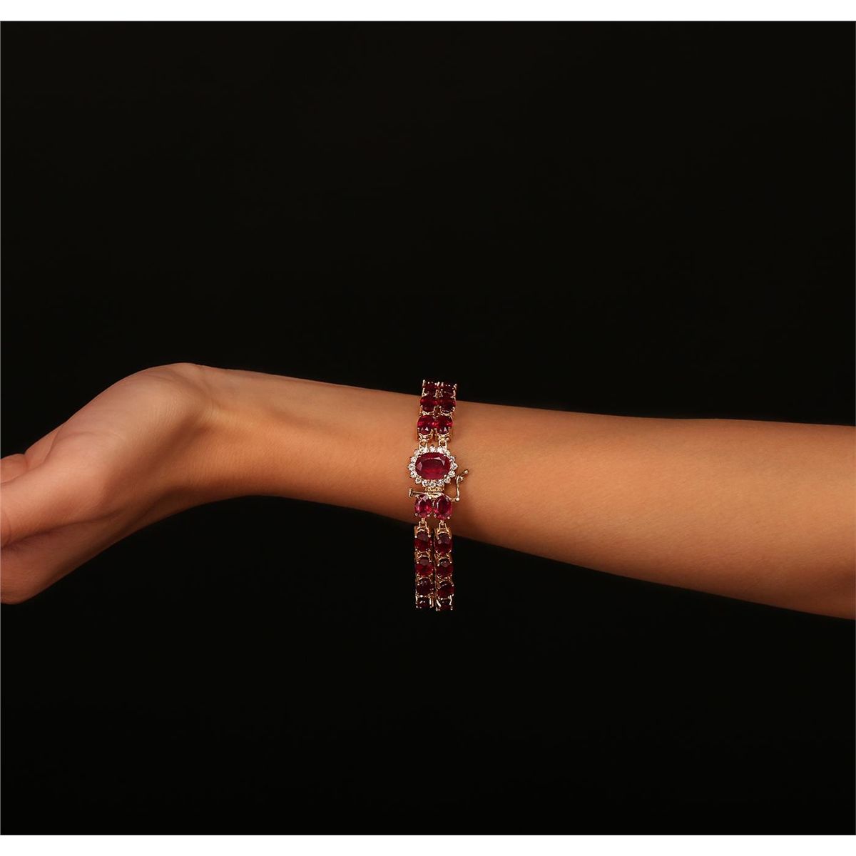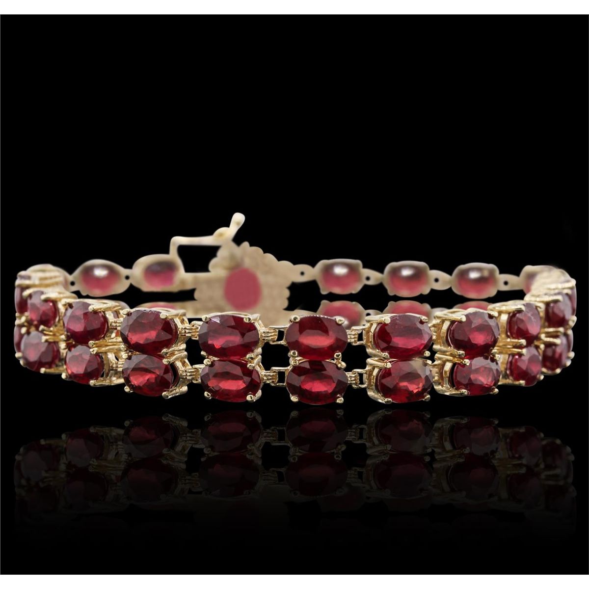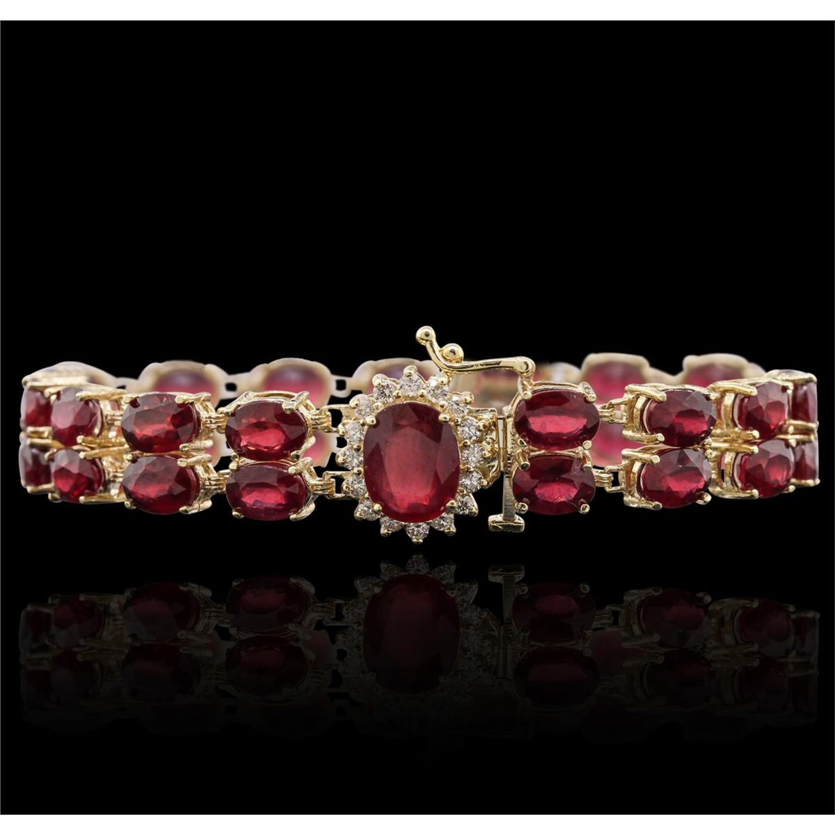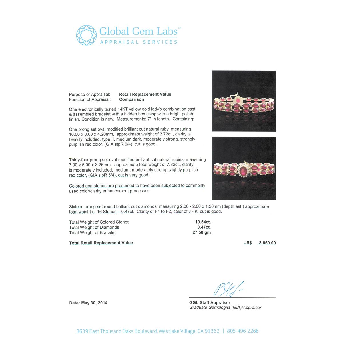 One electronically tested 14KT yellow gold Ladies combination cast & assembled bracelet with a hidden box clasp with a bright polish finish. Condition is new. Measurements: 7" in length. Containing: One prong set oval modified brilliant cut natural ruby, measuring 10.00 x 8.00 x 4.20mm, approximate weight of 2.72ct., clarity is heavily included, type II, medium dark, moderately strong, strongly purplish red color, (GIA stpR 6/4), cut is good. Thirty-four prong set oval modified brilliant cut natural rubies, measuring 7.00 x 5.00 x 3.25mm, approximate. Total Weight of 7.82ct., clarity is moderately included, medium, moderately strong, slightly purplish red color, (GIA slpR 5/4), cut is very good. Colored gemstones are presumed to have been subjected to commonly used color/clarity enhancement processes. Sixteen prong set round brilliant cut diamonds, measuring 2.00 - 2.00 x 1.20mm (depth est.) approximate. Total Weight of 16 Stones = 0.47ct. Clarity: I-1 to I-2. Color: J - K, Cut is Good. Total Weight of Colored Stones 10.54ct. Total Weight of Diamonds 0.47ct. Total Weight of Bracelet 27.50 grams. GGL Appraised at $13,650.00.
