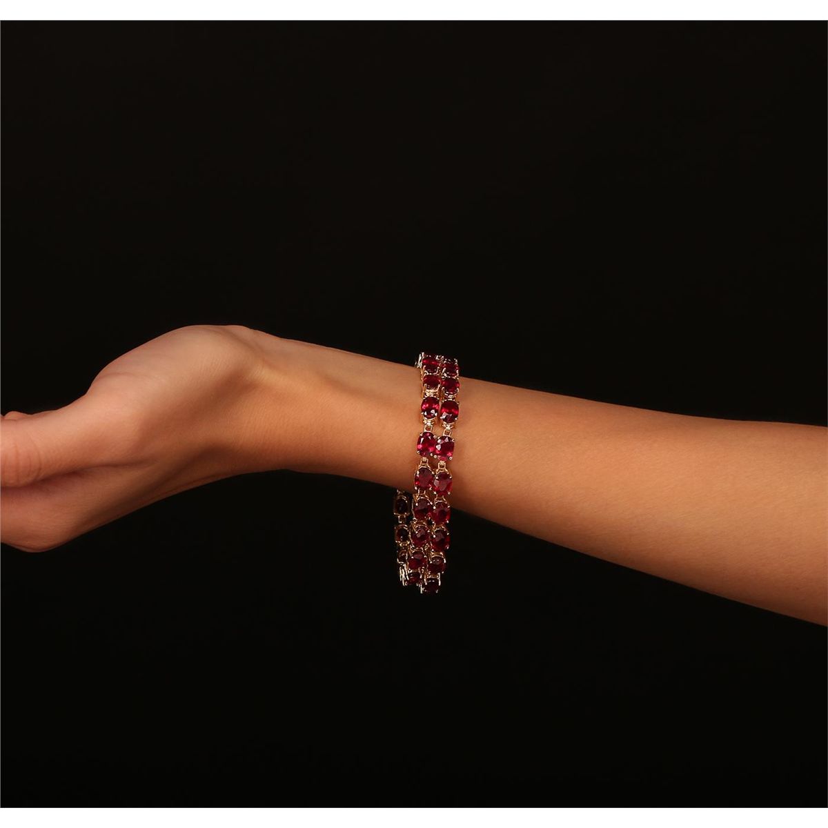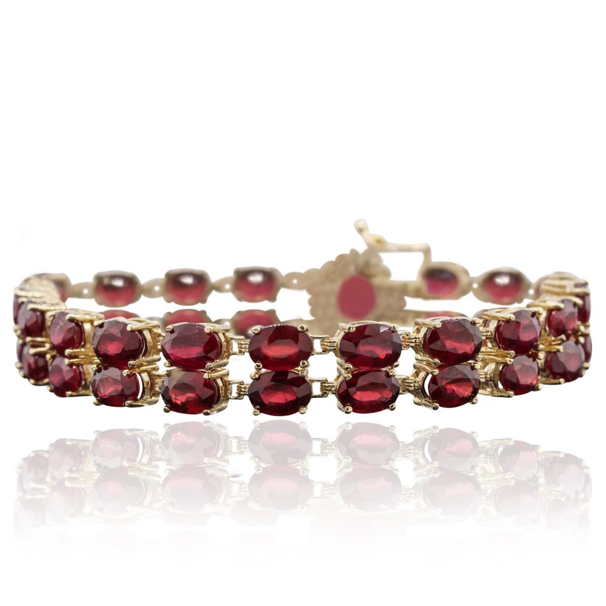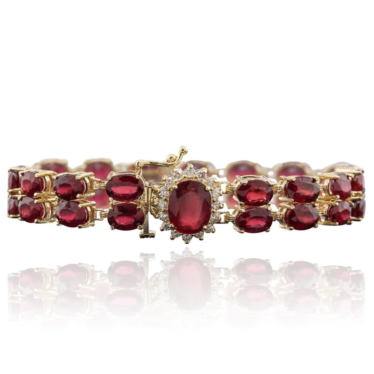 One electronically tested 14KT yellow gold Ladies combination cast & assembled bracelet with a hidden box clasp with a bright polish finish. Condition is new. Measurements: 7" in length. Containing: One prong set oval modified brilliant cut natural ruby, measuring 10.00 x 8.00 x 4.20mm, approximate weight of 2.72ct., clarity is heavily included, type II, medium dark, moderately strong, strongly purplish red color, (GIA stpR 6/4), cut is good. Thirty-four prong set oval modified brilliant cut natural rubies, measuring 7.00 x 5.00 x 3.25mm, approximate. Total Weight of 7.82ct., clarity is moderately included, medium, moderately strong, slightly purplish red color, (GIA slpR 5/4), cut is very good. Colored gemstones are presumed to have been subjected to commonly used color/clarity enhancement processes. Sixteen prong set round brilliant cut diamonds, measuring 2.00 - 2.00 x 1.20mm (depth est.) approximate. Total Weight of 16 Stones = 0.47ct. Clarity: I-1 to I-2. Color: J - K, Cut is Good. Total Weight of Colored Stones 10.54ct. Total Weight of Diamonds 0.47ct. Total Weight of Bracelet 27.50 grams. GGL Appraised at $13,650.00.