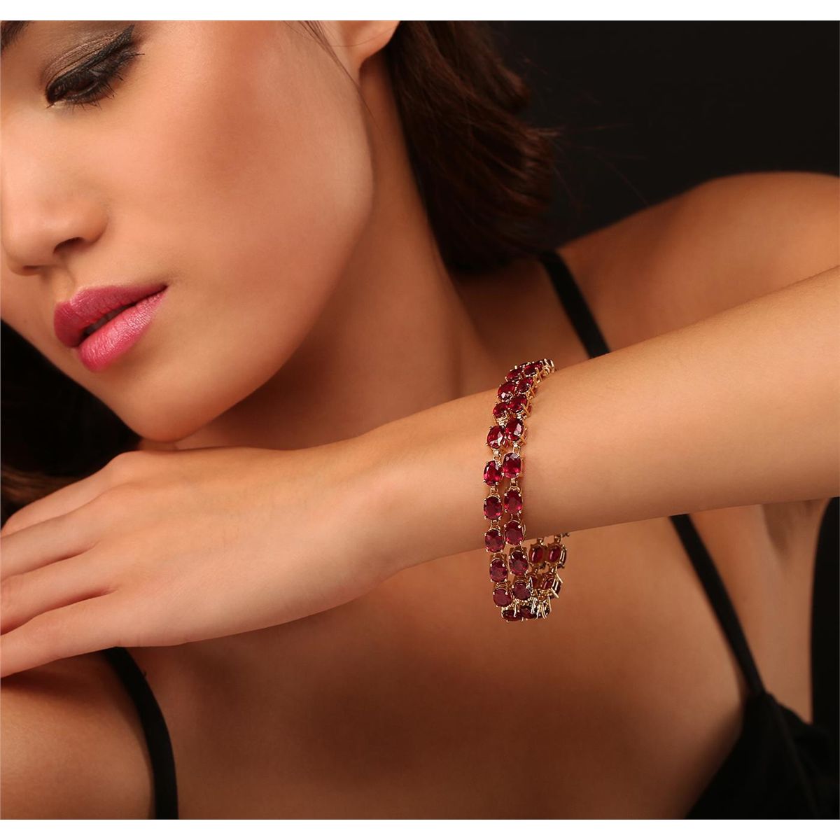 One electronically tested 14KT yellow gold Ladies combination cast & assembled bracelet with a hidden box clasp with a bright polish finish. Condition is new. Measurements: 7" in length. Containing: One prong set oval modified brilliant cut natural ruby, measuring 10.00 x 8.00 x 4.20mm, approximate weight of 2.72ct., clarity is heavily included, type II, medium dark, moderately strong, strongly purplish red color, (GIA stpR 6/4), cut is good. Thirty-four prong set oval modified brilliant cut natural rubies, measuring 7.00 x 5.00 x 3.25mm, approximate. Total Weight of 7.82ct., clarity is moderately included, medium, moderately strong, slightly purplish red color, (GIA slpR 5/4), cut is very good. Colored gemstones are presumed to have been subjected to commonly used color/clarity enhancement processes. Sixteen prong set round brilliant cut diamonds, measuring 2.00 - 2.00 x 1.20mm (depth est.) approximate. Total Weight of 16 Stones = 0.47ct. Clarity: I-1 to I-2. Color: J - K, Cut is Good. Total Weight of Colored Stones 10.54ct. Total Weight of Diamonds 0.47ct. Total Weight of Bracelet 27.50 grams. GGL Appraised at $13,650.00.