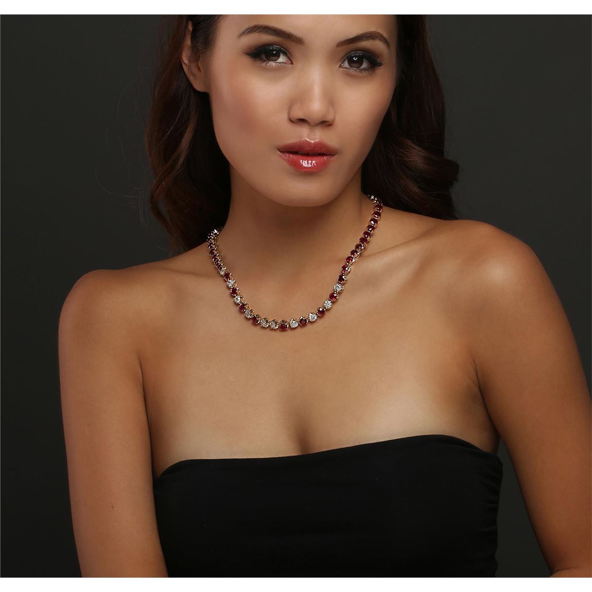 One electronically tested 14KT yellow gold ladies combination cast & assembled necklace with a hidden box clasp with a bright polish finish. Measurements: 17.5" in length. Identified with markings of "14K". Condition is new. Containing: Forty-eight prong set round modified brilliant cut natural rubies, measuring 5.50 - 5.50 x 3.58 mm, approximate total weight of 10.56ct., clarity is heavily included, medium dark, moderately strong, strongly purplish red color, (GIA stpR 6/4), cut is good. Ten prong set round brilliant cut diamonds, measuring 5.50 - 5.20 x 3.21mm (depth est.) approximate total weight of 10 Stones = 5.60ct. Clarity: I-2. Color: I, Cut is Good. Colored gemstones are presumed to have been subjected to commonly used enhancement processes. All diamonds and colored gemstones are graded in the mounting, unless otherwise stated. Total Weight of Colored Stones 10.56ct. Total Weight of Diamonds 5.60ct. Total Weight of Necklace 50.80 grams. GGL Appraised at $21,040.00.