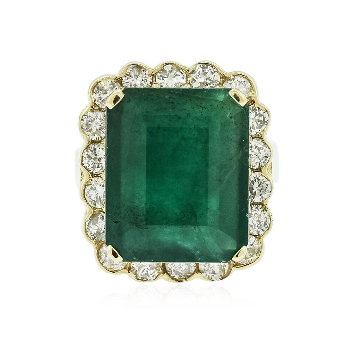 One electronically tested 14KT yellow gold Ladies combination cast & assembled ring with a bright polish finish. Condition is new. Identified with markings of "14K". Containing: One prong set emerald standard step cut natural emerald, measuring 16.00 x 13.50 x 6.80mm, approximate weight of 10.79ct., clarity is heavily included, type III, dark, moderately strong, green color, (GIA G 7/4), cut is good. Colored gemstones are presumed to have been subjected to commonly used and possible undetectable color/clarity enhancement processes. Eighteen prong set round brilliant cut diamonds, measuring 3.00 - 3.00 x 1.80mm (depth est.) approximate total weight of 18 Stones = 1.78ct. Clarity of SI-1 to I-1, Color of J - K, Cut is Good. Total Weight of Colored Stones 10.79ct. Total Weight of Diamonds 1.78 ct. Total Weight of Ring 12.60gm. GGL Appraised at $25,095.00.