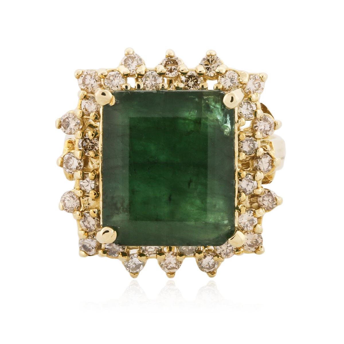 One electronically tested 14KT yellow gold ladies cast emerald and diamond ring with a bright polish finish. Condition is new, good workmanship. The featured emerald is set within a diamond lattice gallery, supported by split shoulders and completed by a three millimeter wide band. Identified with markings of "14K". Containing: One prong set rectangular step cut natural emerald, measuring 14.00 x 11.85 x 7.40mm, 8%. bulge factor, approximate weight of 10.82ct., clarity is severely included, type III, medium, very slightly grayish, very slightly bluish green color, (GIA vslbG 5/3), cut is good. Transmitting light very diffusely, opaque. Naturally occurring internal & external characteristics are present. Indications of oil residue. Colored Stone Grading Report attached. Graded in the setting. Thirty-Two prong set round brilliant cut diamonds, measuring 2.10 - 1.80 x 1.17mm (depth est.) approximate. Total Weight of 32 Stones = 0.96ct. Faint secondary color throughout. Graded in the setting. Clarity: SI-1 to I-1. Color: J - M. Total Weight of Colored Stones 10.82ct. Total Weight of Diamonds 0.96ct. Total Weight of Ring 9.90 grams. AIG Appraised at $5,940.00.